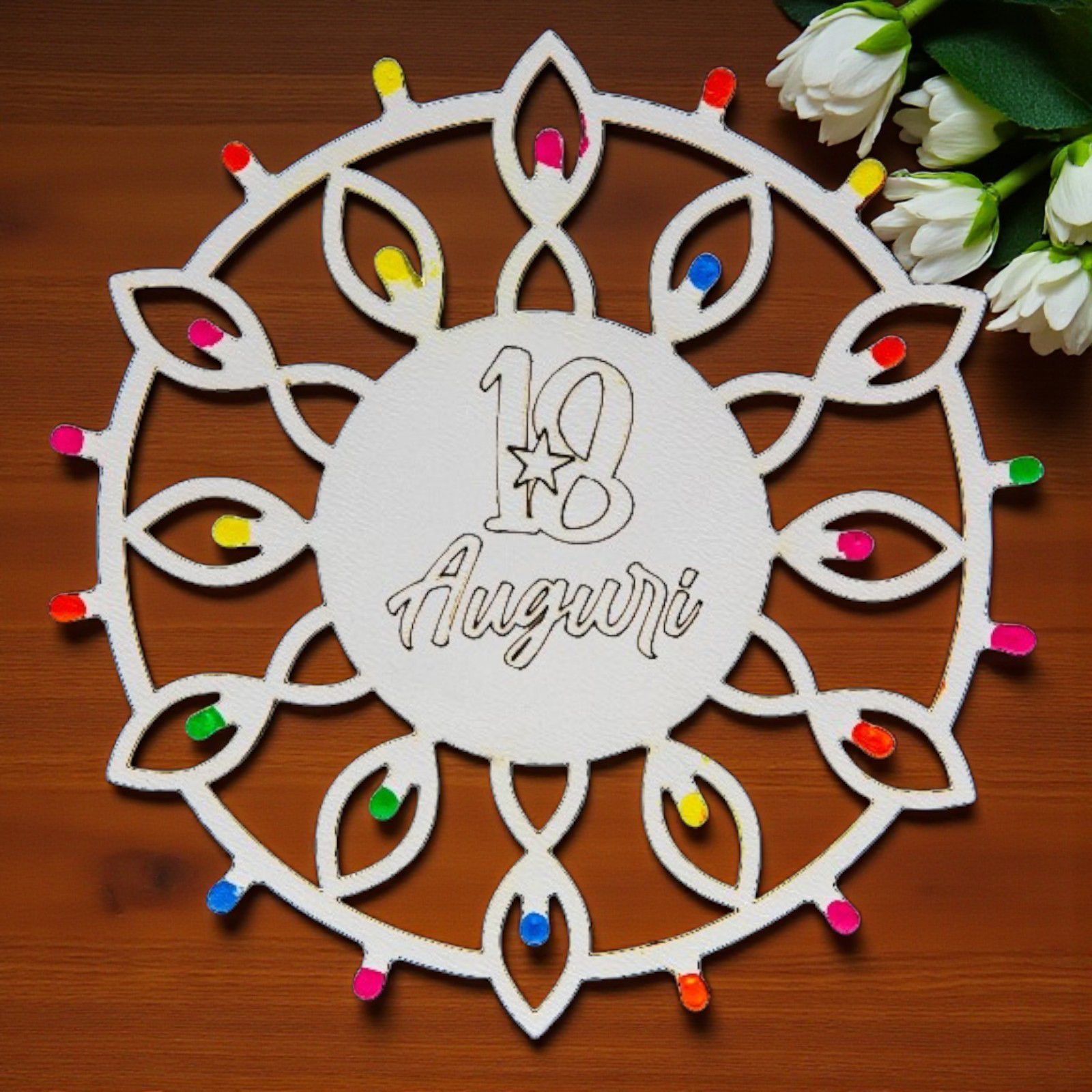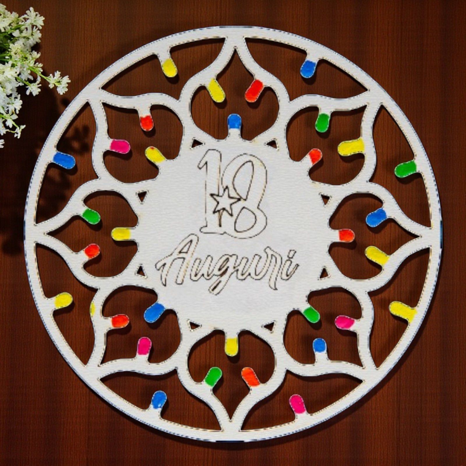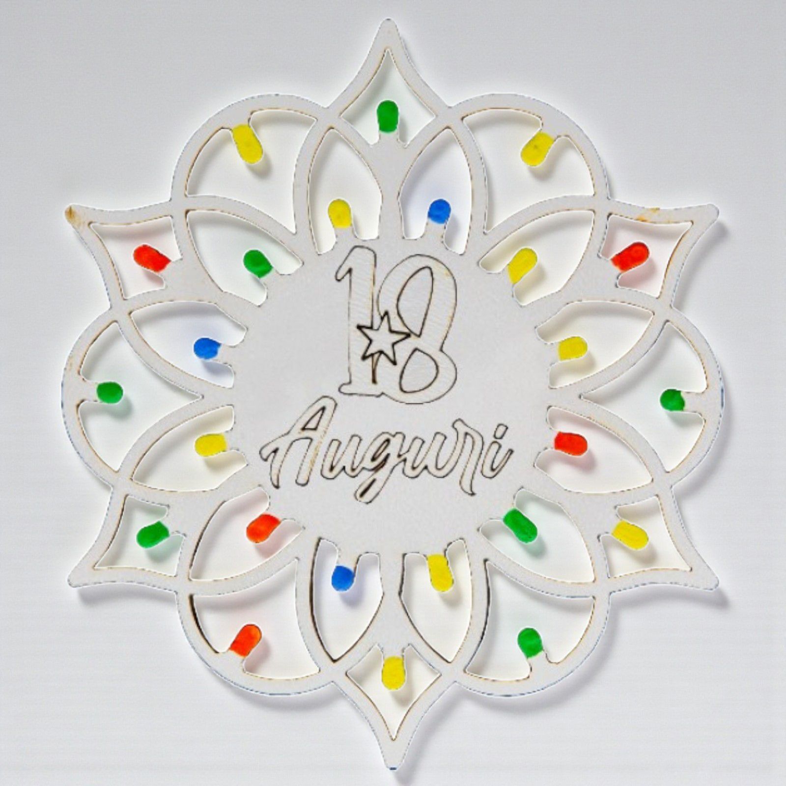 Realizzati in legno bianco di alta qualità, questi segnaposto non sono solo un elemento decorativo, ma anche un regalo dal significato profondo. L'incisione "18 Auguri" e le "lucine" multicolor rendono ogni pezzo unico, evocando la magia delle notti estive pugliesi. Scegli tra diversi modelli e crea un’atmosfera da sogno per la tua festa!