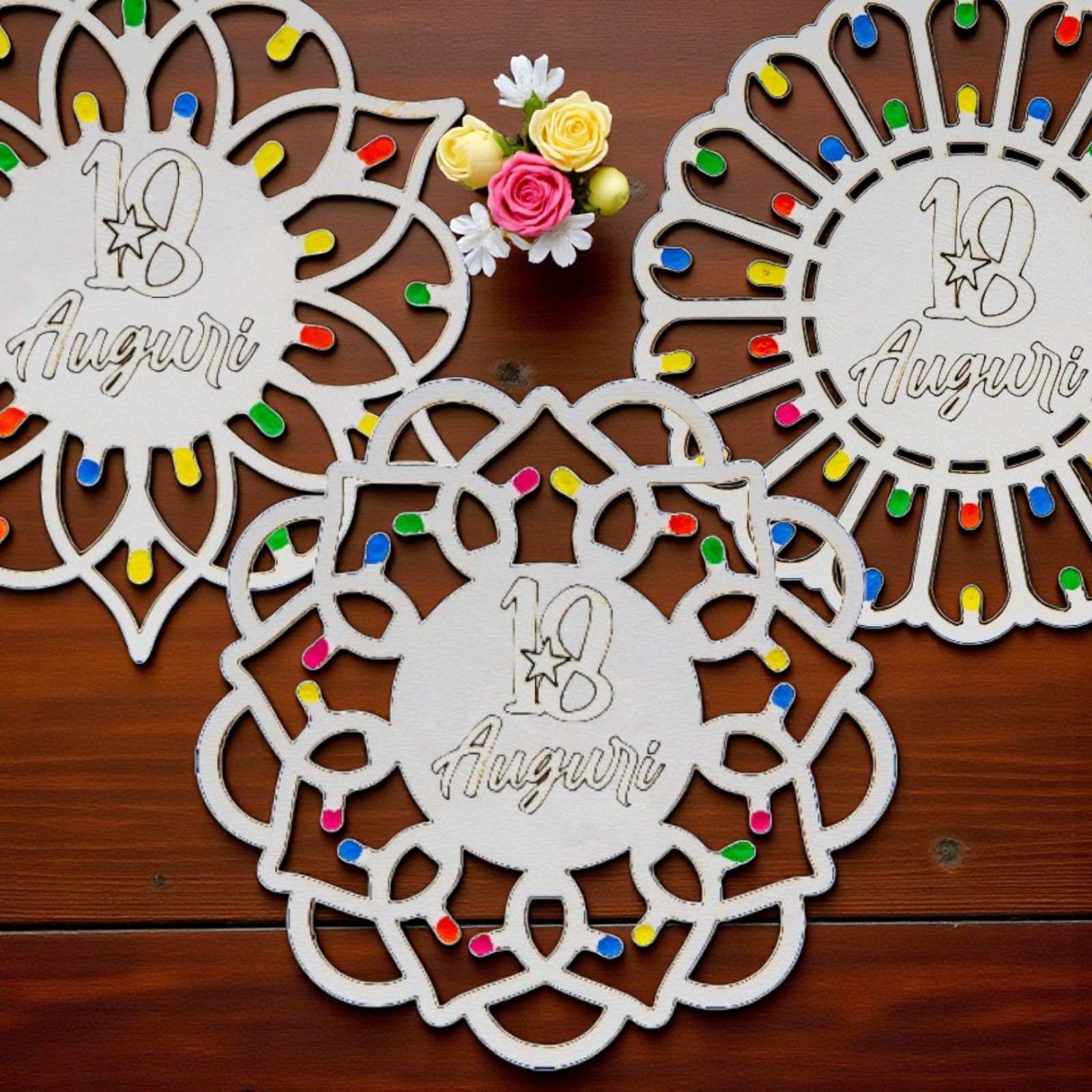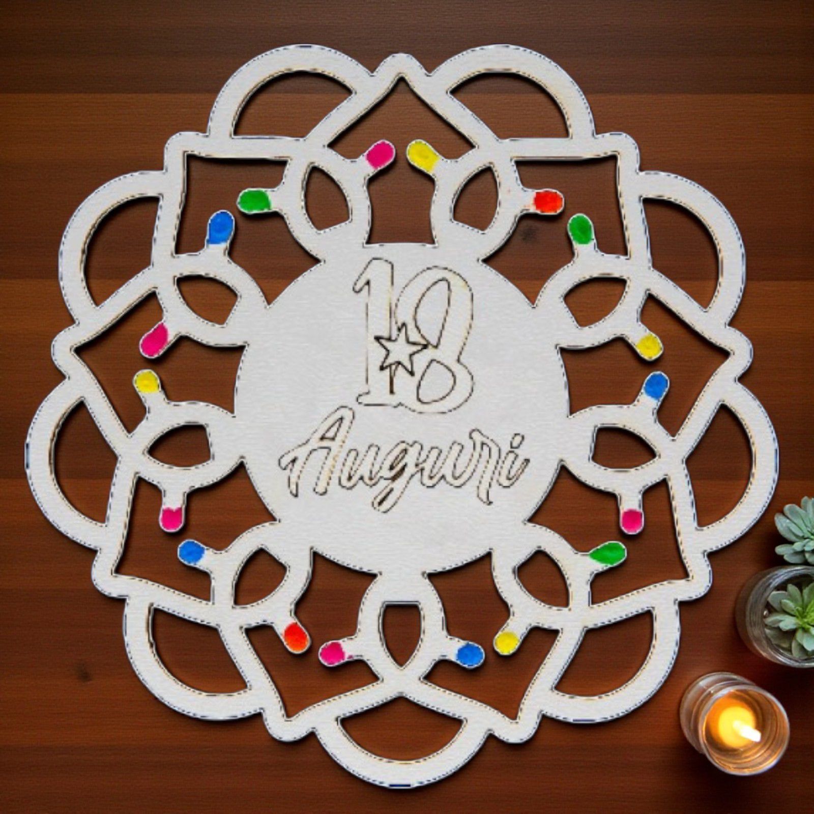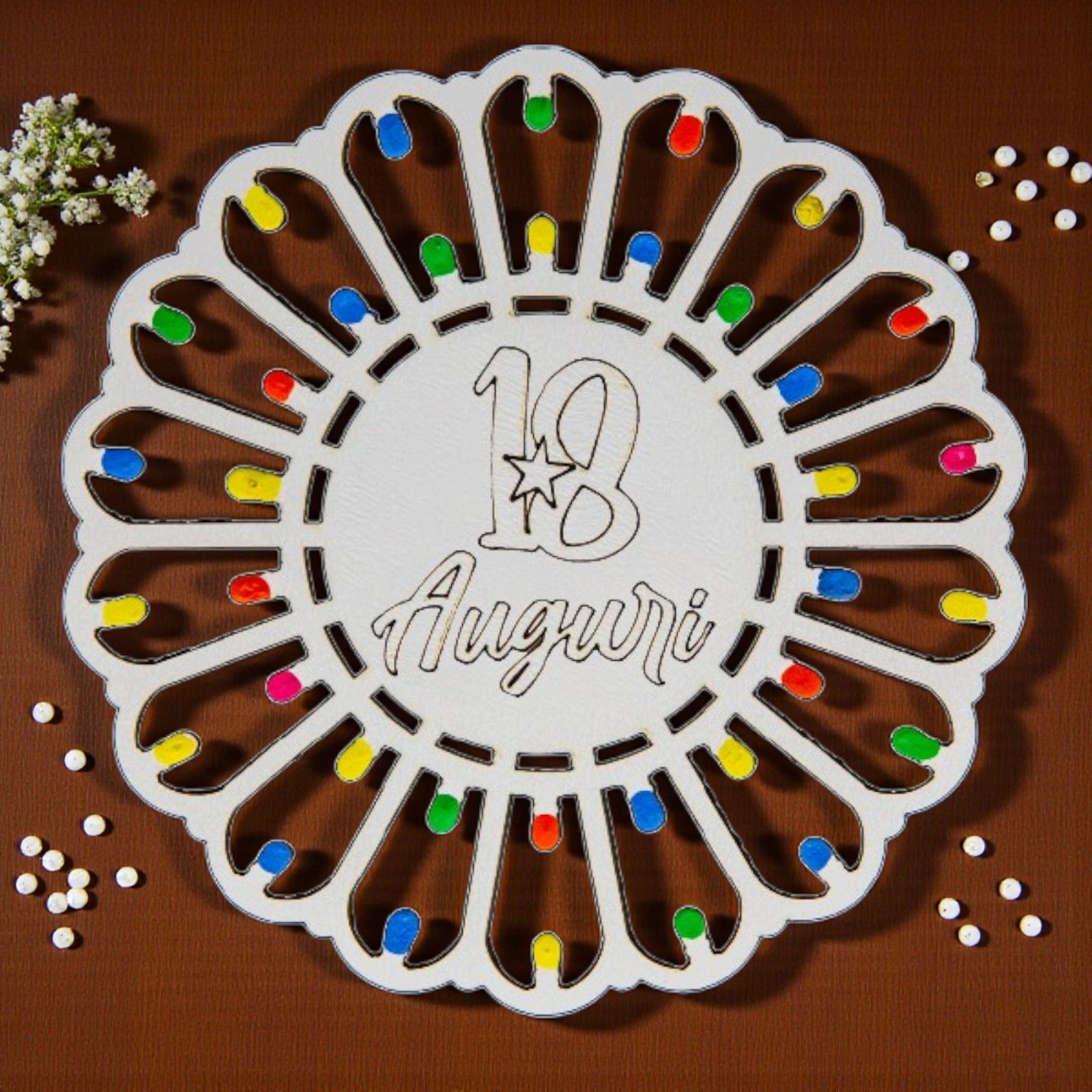 Realizzati in legno bianco di alta qualità, questi segnaposto non sono solo un elemento decorativo, ma anche un regalo dal significato profondo. L'incisione "18 Auguri" e le "lucine" multicolor rendono ogni pezzo unico, evocando la magia delle notti estive pugliesi. Scegli tra diversi modelli e crea un’atmosfera da sogno per la tua festa!