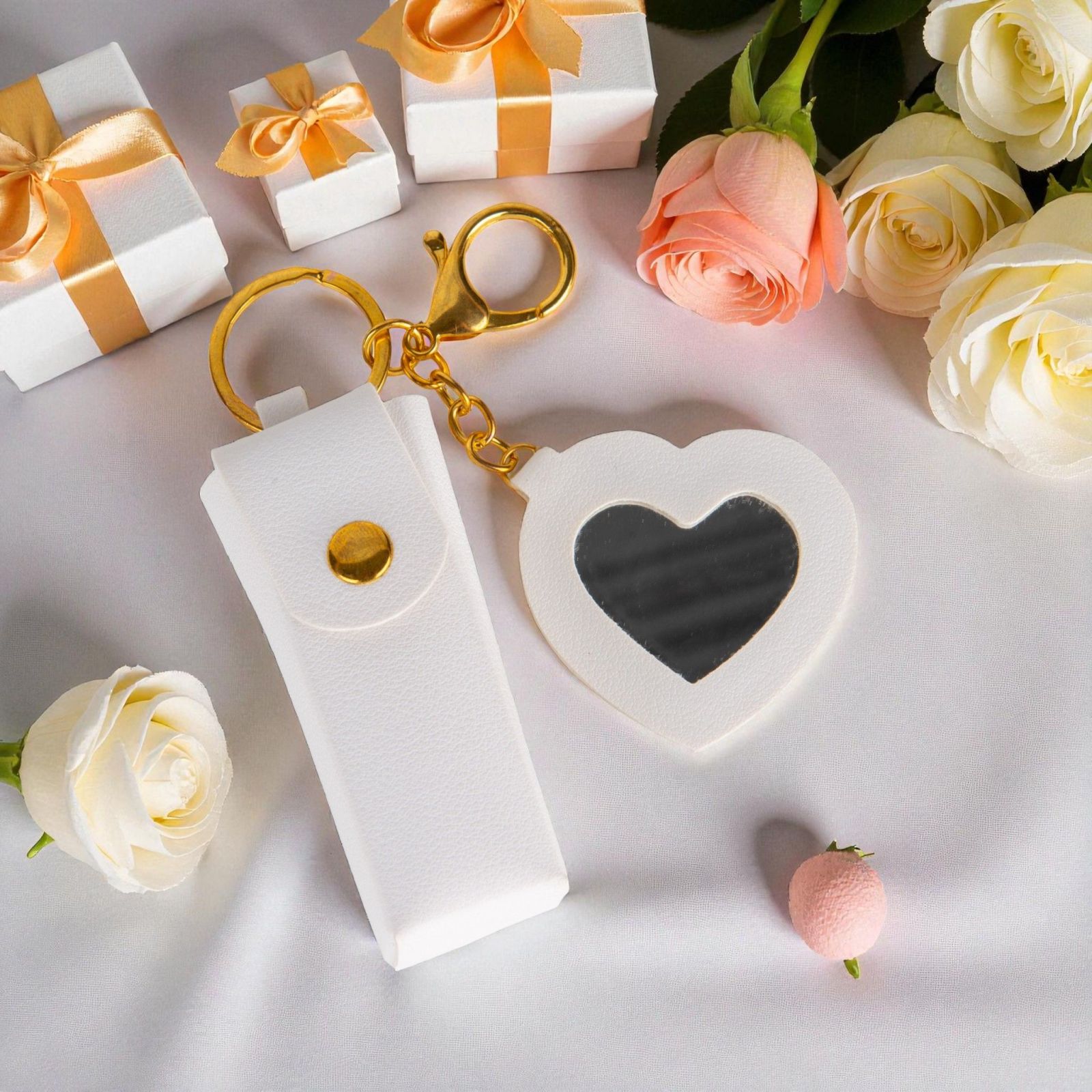 Scopri l'eleganza racchiusa in questo portachiave con bottoncino e specchietto a forma di cuore, un accessorio che trasmette sentimenti e ricordi preziosi. Perfetto come bomboniera per festeggiare momenti speciali come compleanni, diciottesimi e anniversari, questa creazione in ecopelle bianca è un pensiero che scalda il cuore e fa brillare gli occhi.