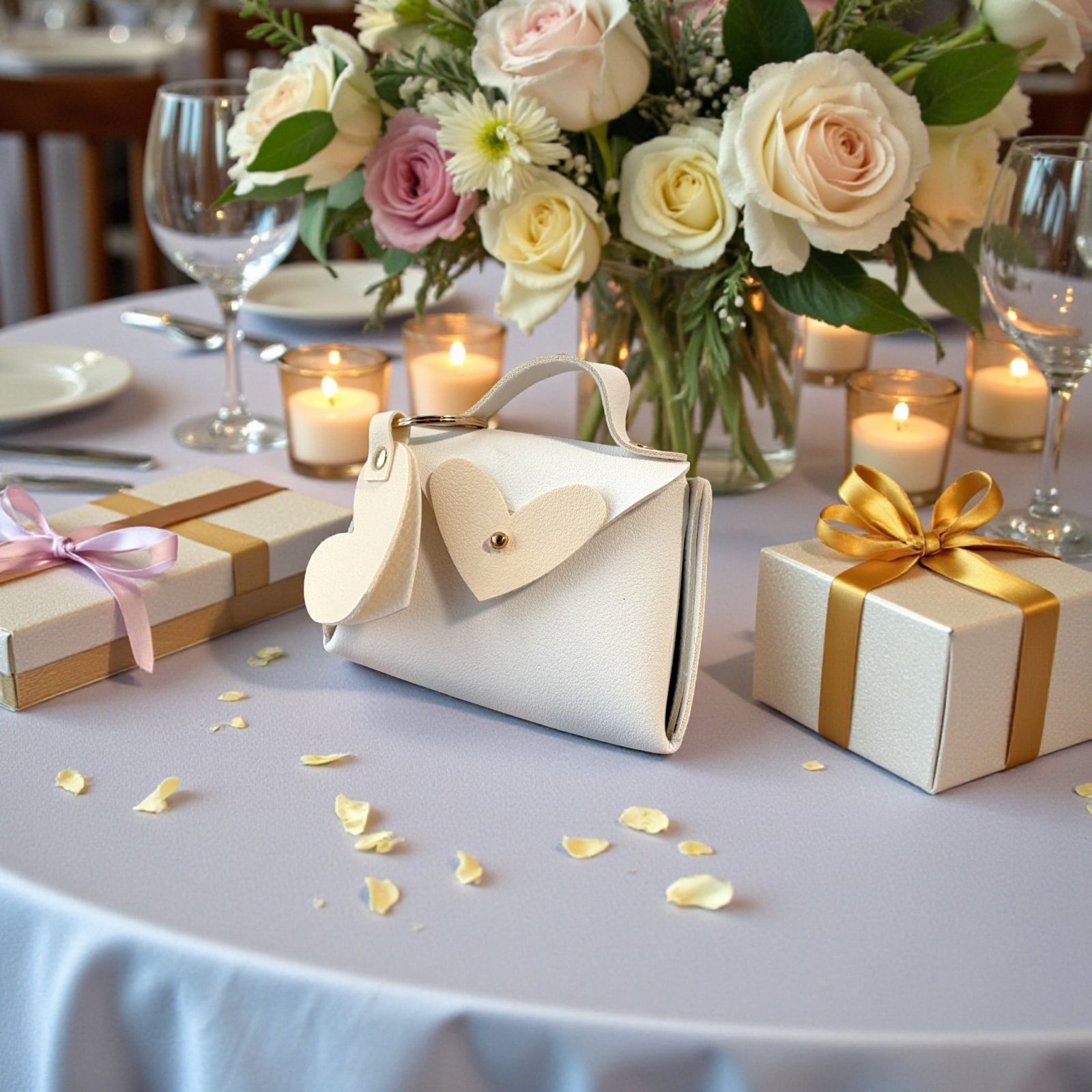 Dolce e curata nei dettagli, questa borsetta portaconfetti è pensata per sorprendere gli invitati con un ricordo semplice ma ricco di significato. Il portachiavi a forma di cuore e la chiusura con cuoricino trasmettono un messaggio di affetto e partecipazione, perfetto per accompagnare una giornata da vivere e condividere.