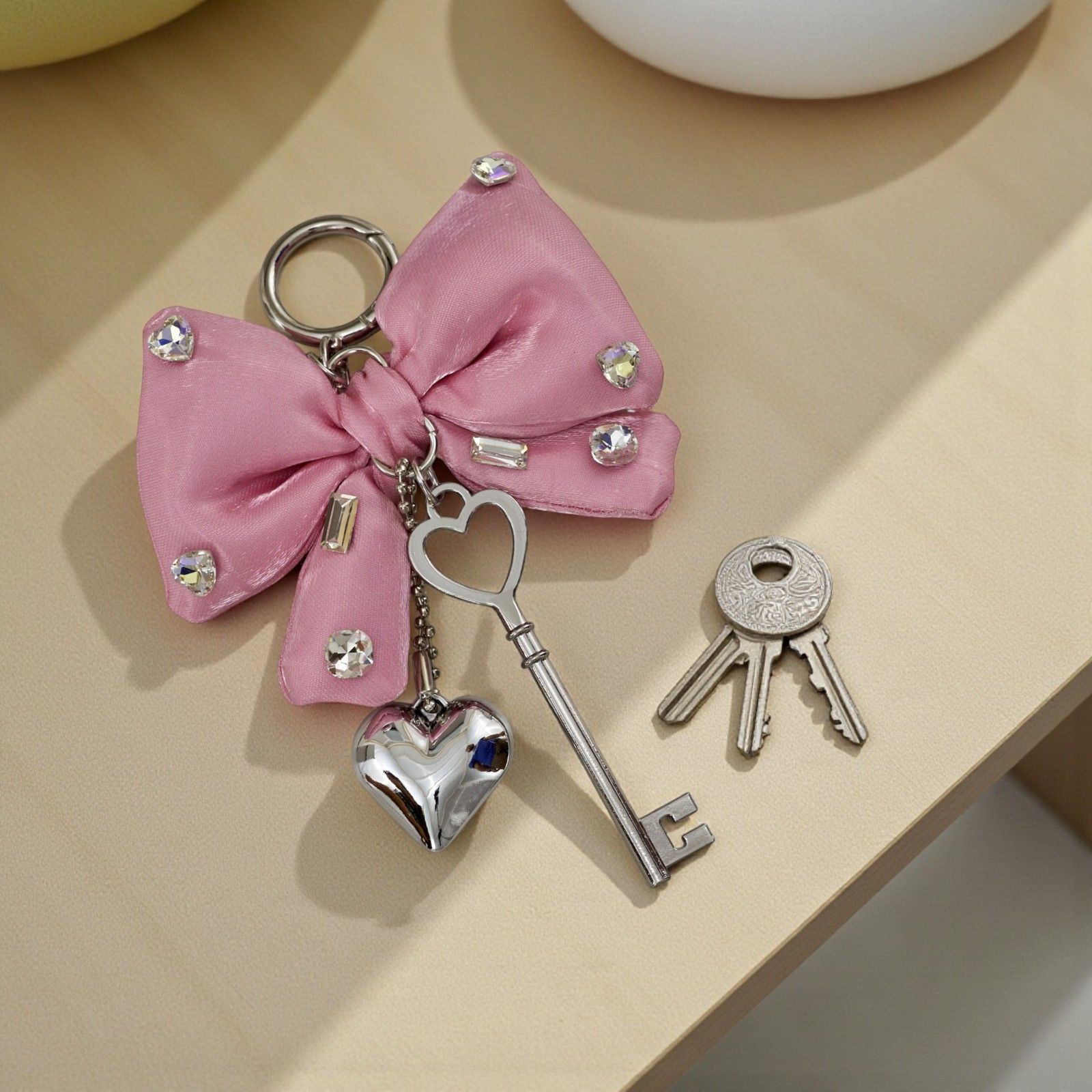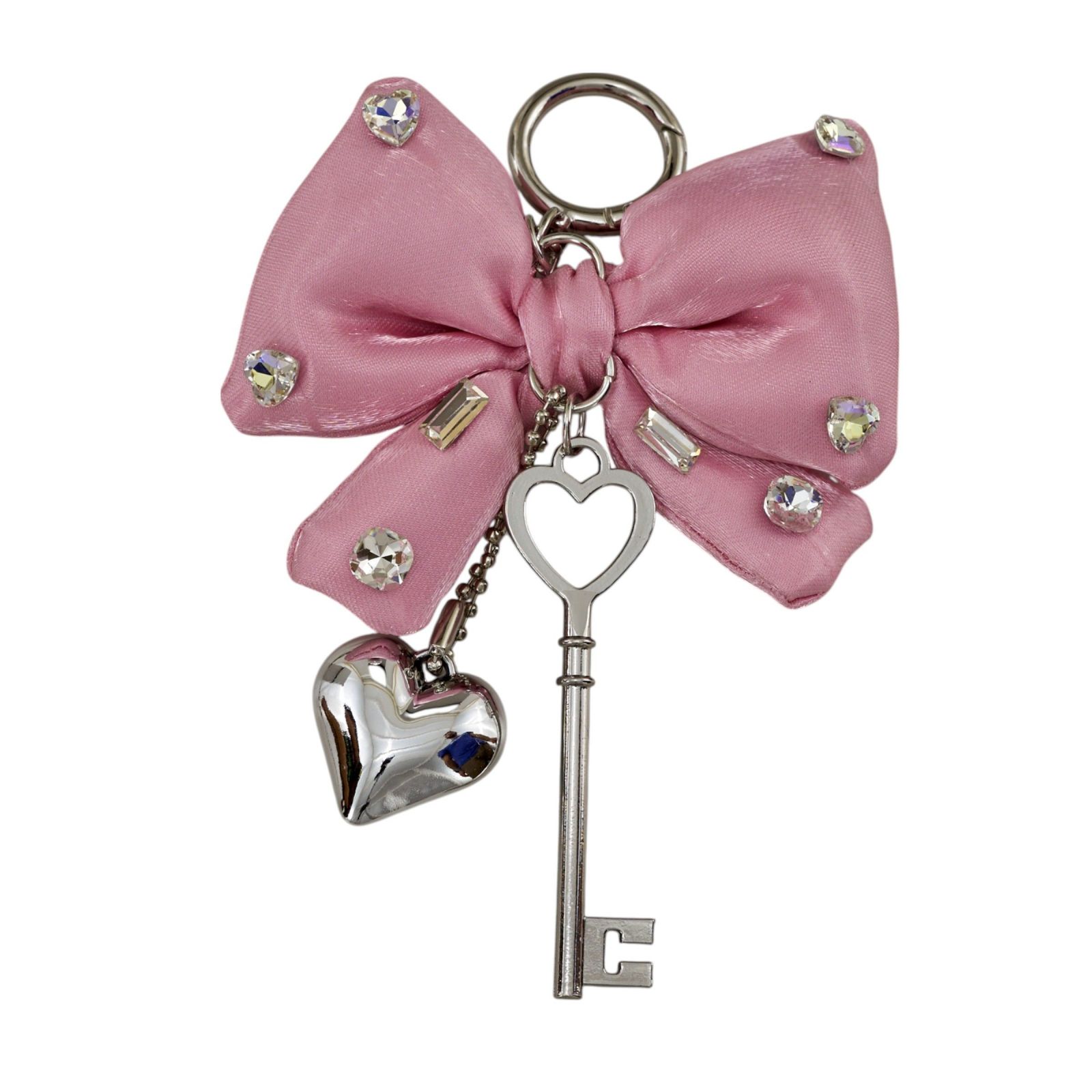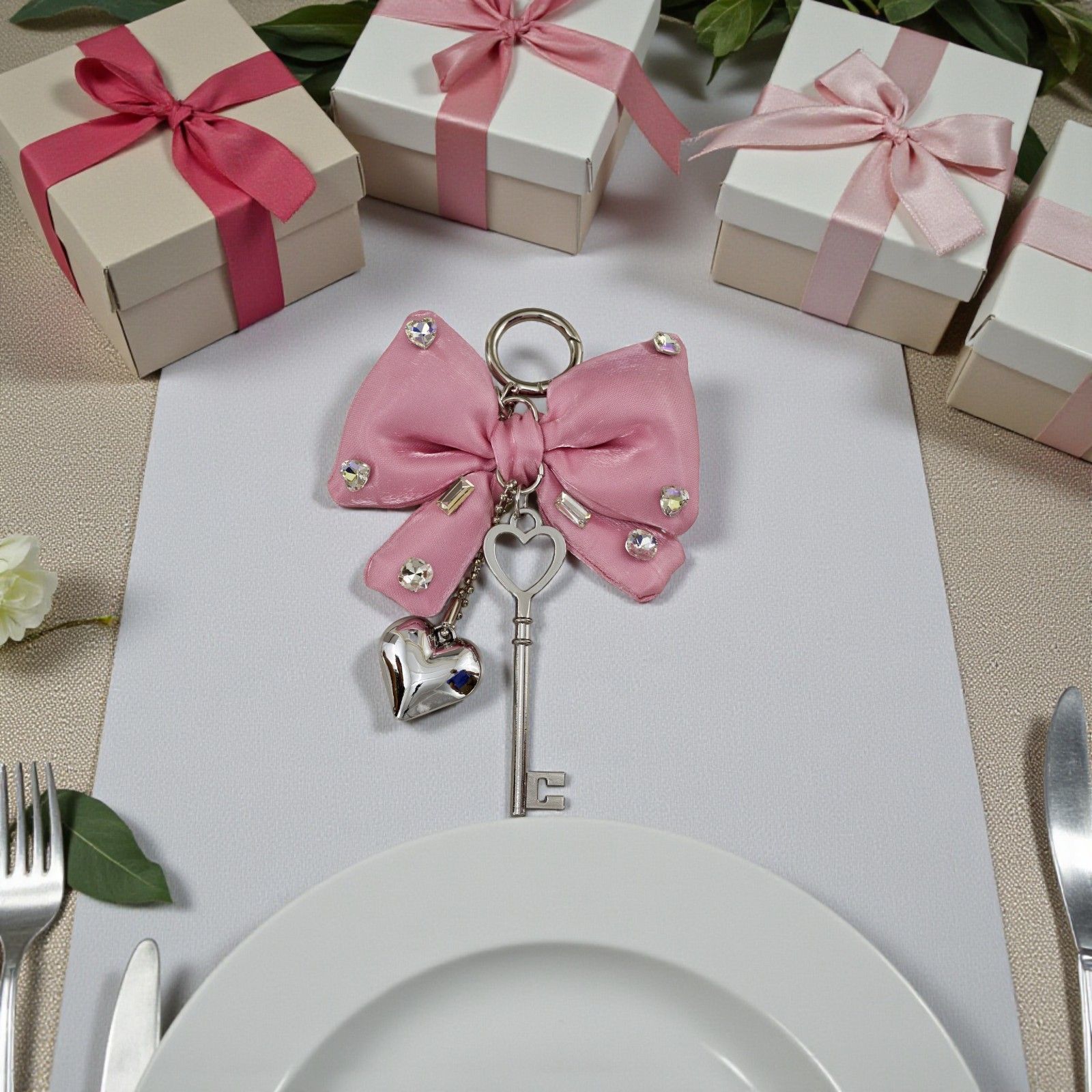 Un delicato ciondolo a forma di fiocco con strass, arricchito da chiave e cuoricino in elegante tonalità rosa, nasce come bomboniera pensata per sorprendere gli invitati con un dono raffinato e simbolico in occasione di comunione, cresima, diciottesimo e compleanno.