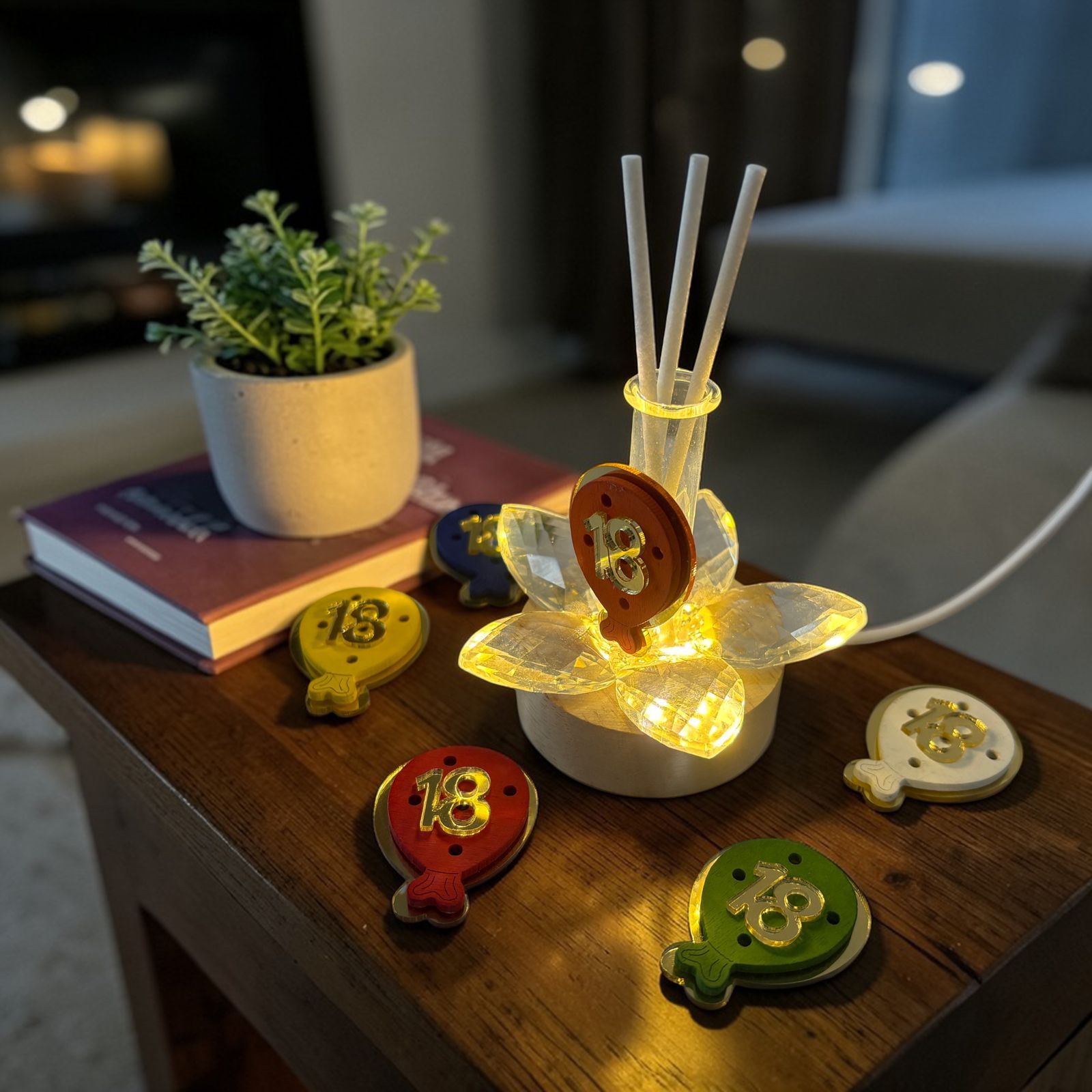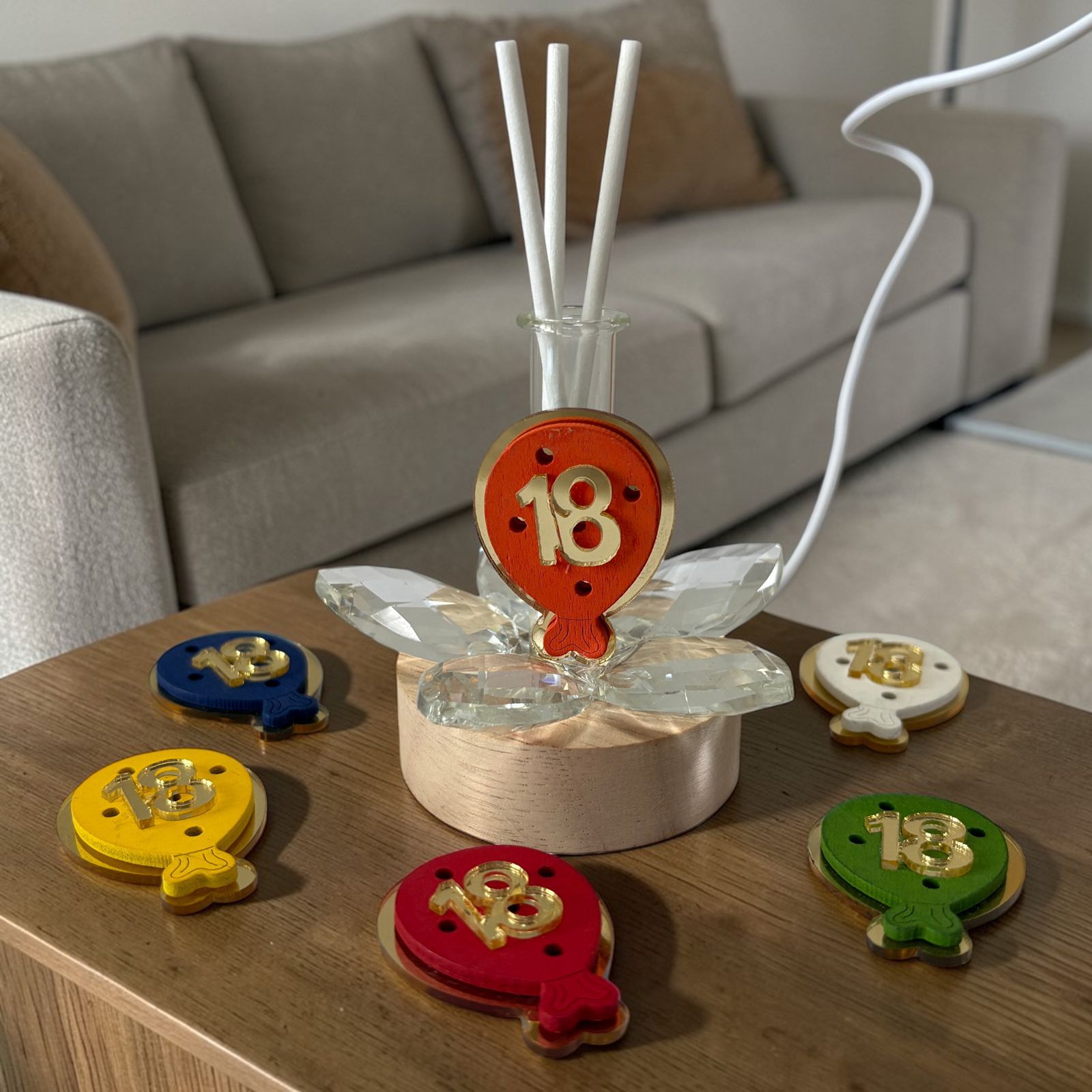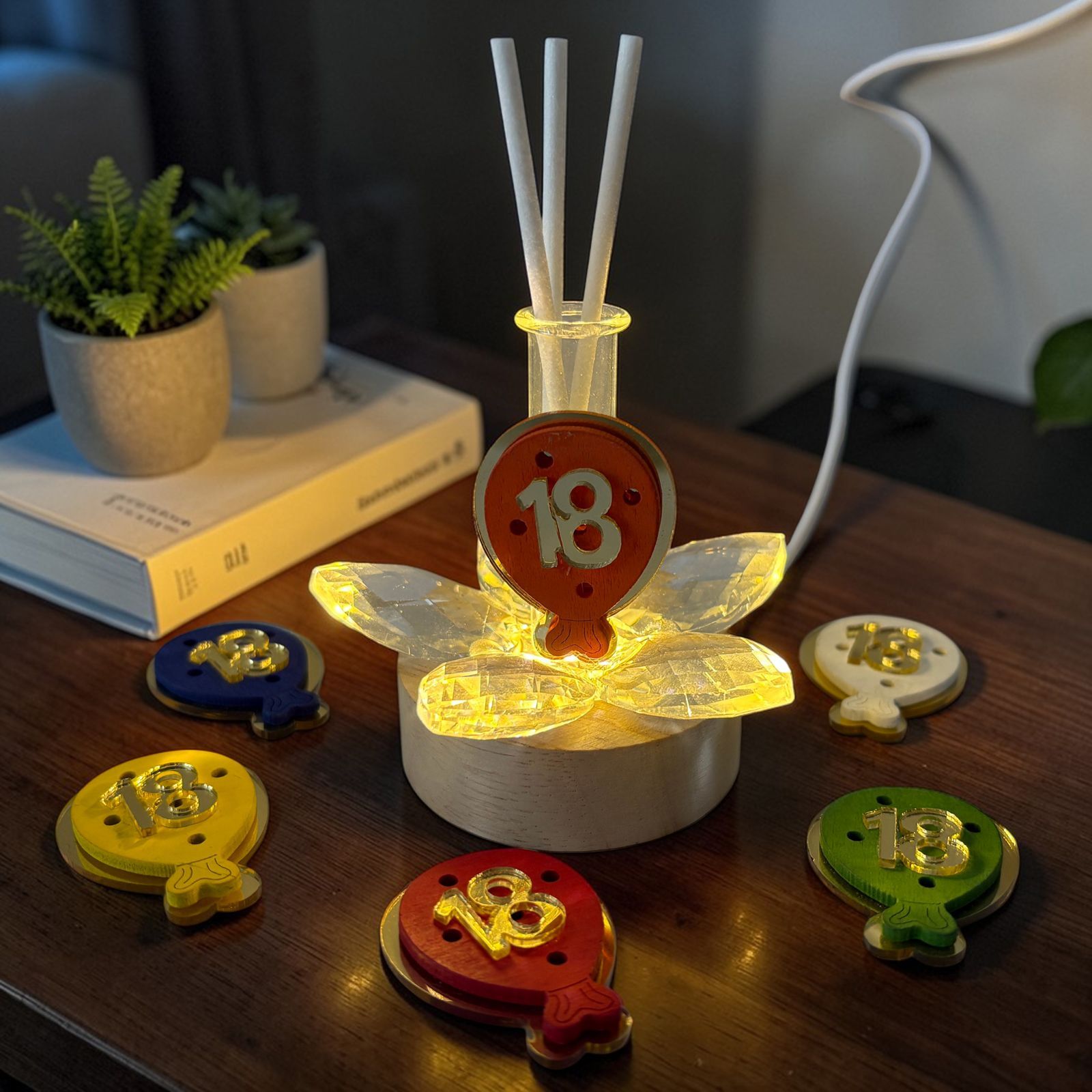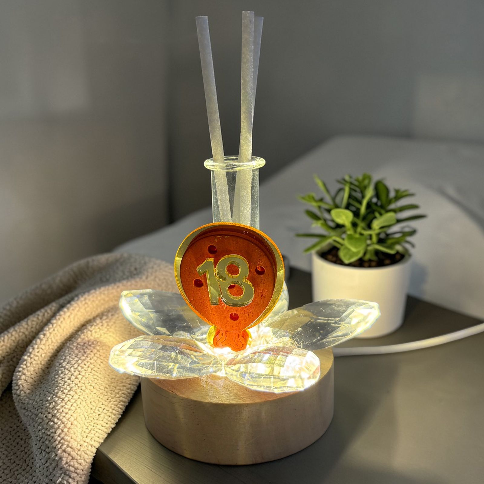 Festeggia i diciotto anni con stile grazie a questa lampada led con profumatore ambiente, una delle bomboniere uniche perfette per il diciottesimo. Il fiore in cristallo si illumina con la base led, creando un effetto elegante e scintillante, mentre il palloncino con numero 18, assortito in vari colori (NON SI PUO' SCEGLIERE IL COLORE), aggiunge un tocco di allegria e originalità alla composizione. Una bomboniera pensata per sorprendere e conquistare gli invitati.