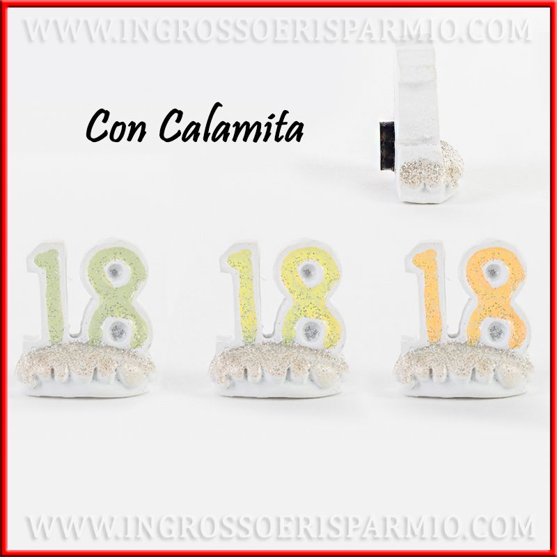 Magneti compleanno a forma di numero 18 in resina, assortiti in 3 varianti di colore: GIALLO, VERDE E ARANCIONE (non è possibile scegliere una sola variante di colore), arricchiti da polvere glitterata. Sulla parte posteriore degli oggettini 18 anni è applicata la calamita, che consente l'applicazione a superfici metalliche.