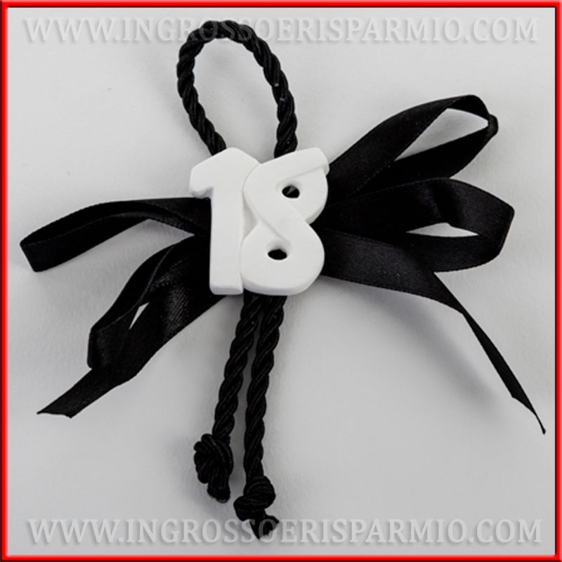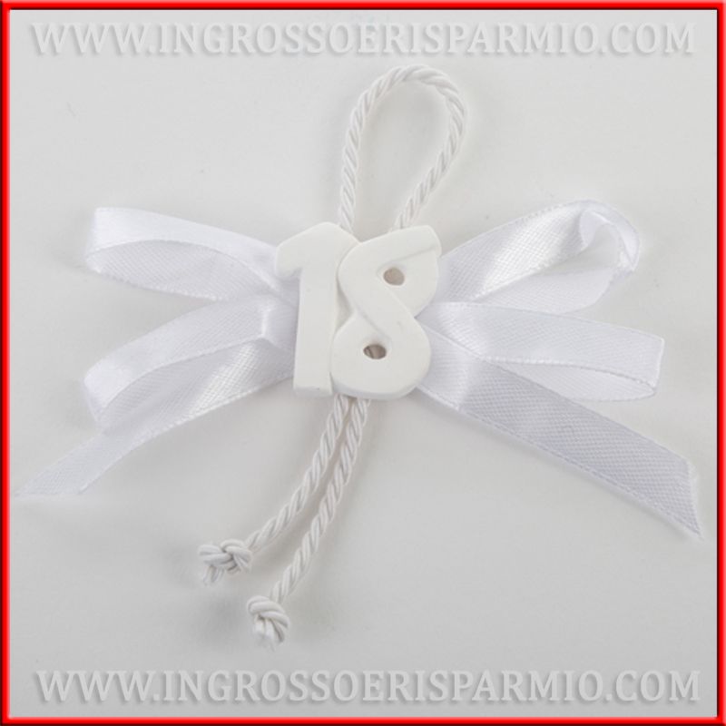 Composizione di fiocchi e cordoncino per appendino, decorata con applicazione centrale di gessi bianchi a forma di numero 18: utilizzali singolarmente come segnaposto diciotto anni, oppure associali a sacchetti portaconfetti o bomboniere diciottesimo, scegliendoli come chiudi pacco.