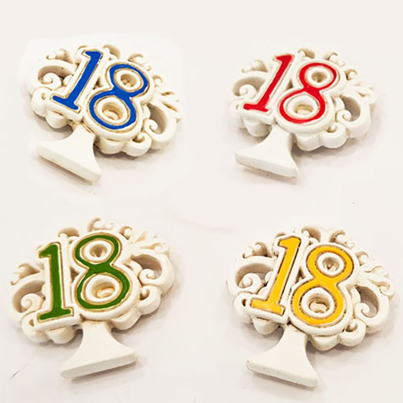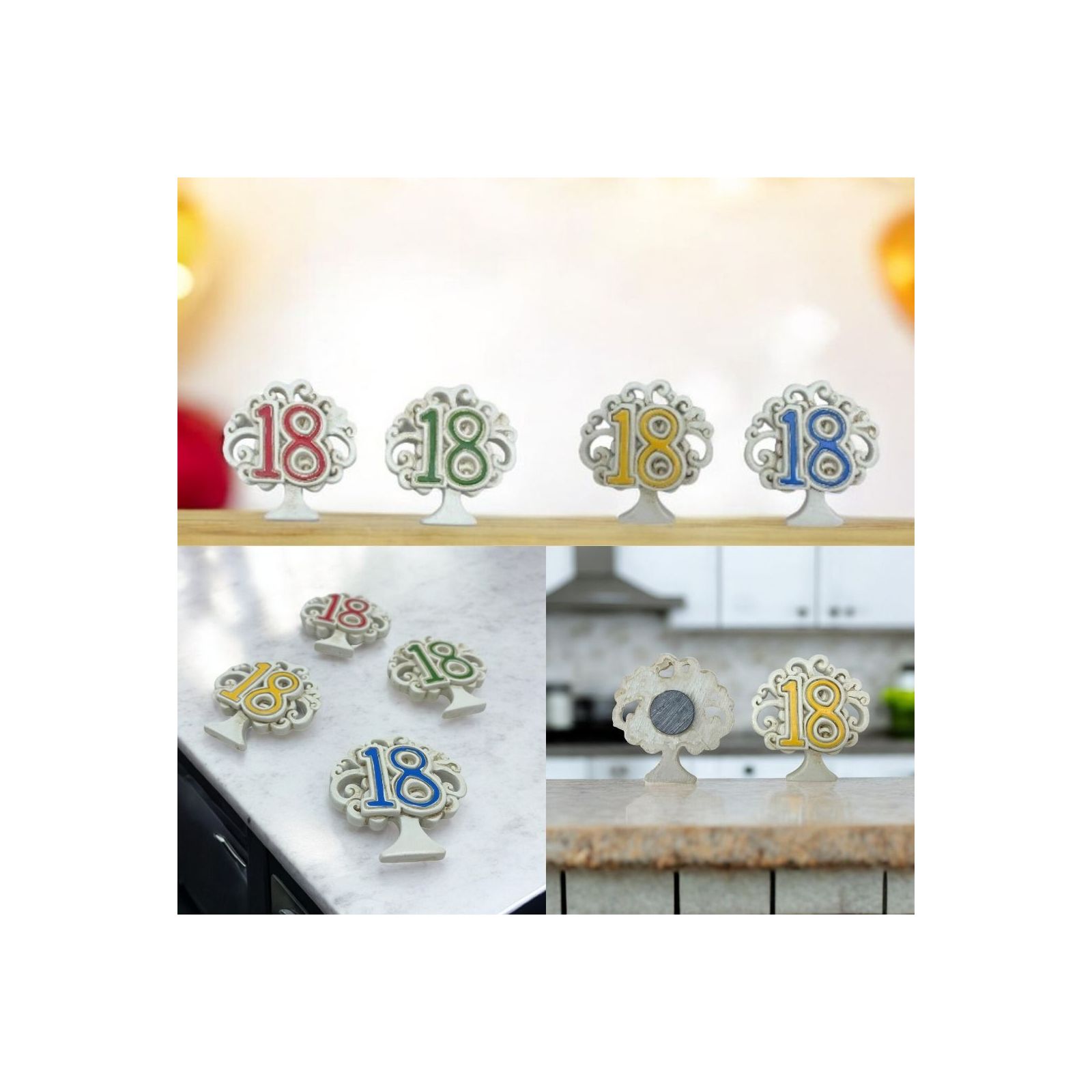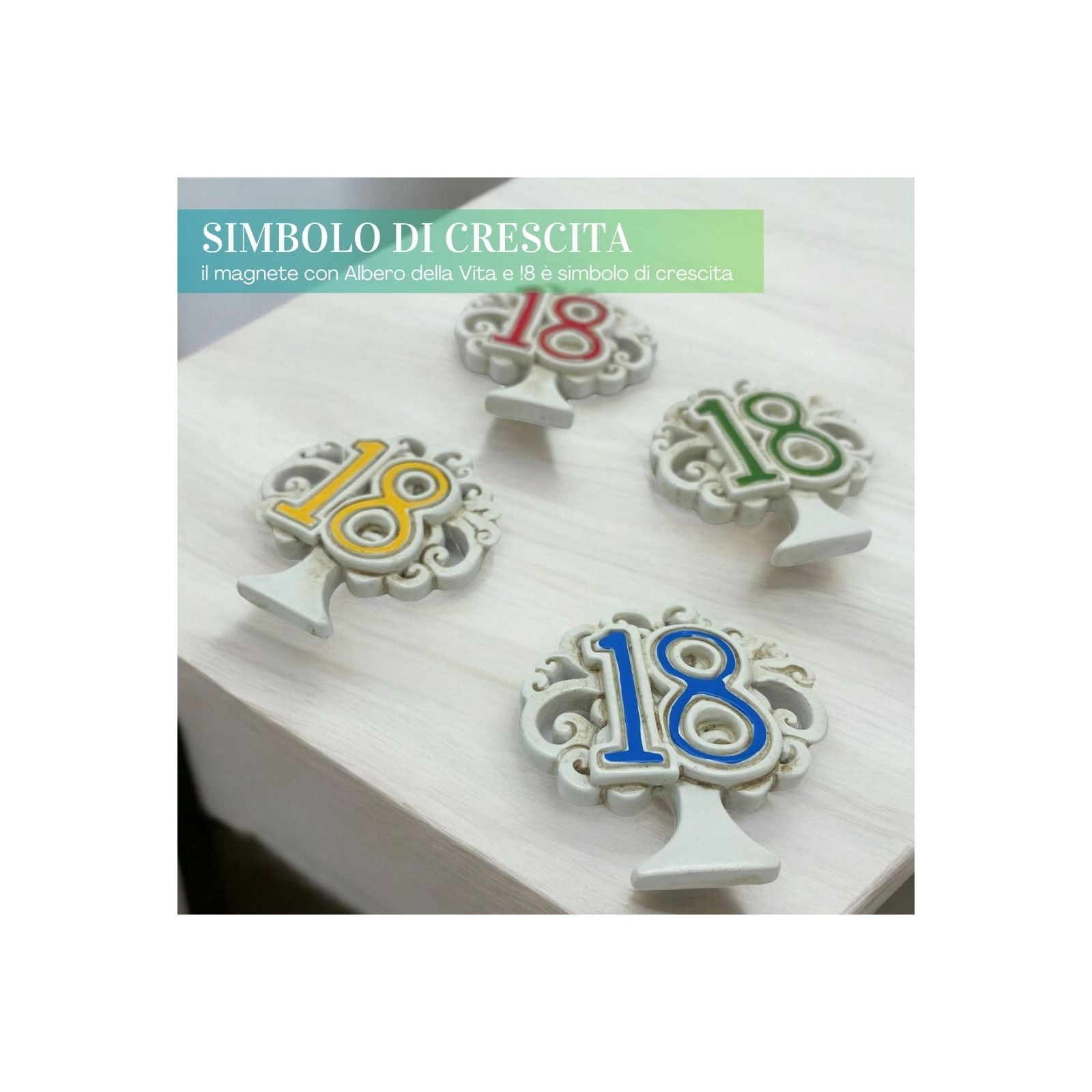 Calamite bomboniere in resina raffiguranti un albero della vita, simbolo con importante significato di buon augurio per una vita ricca, piena ed intensa. Al centro è raffigurato il numero 18 che rende le calamite personalizzate per questo evento. Il numero 18 è colorato in 4 differenti tonalità di colore (assortite): giallo, verde, arancione e rosso!