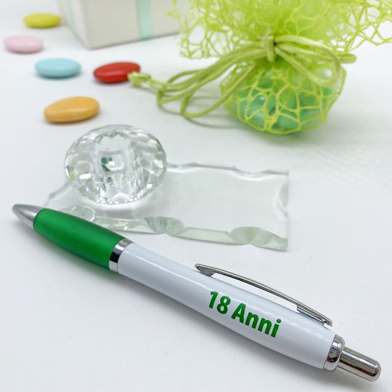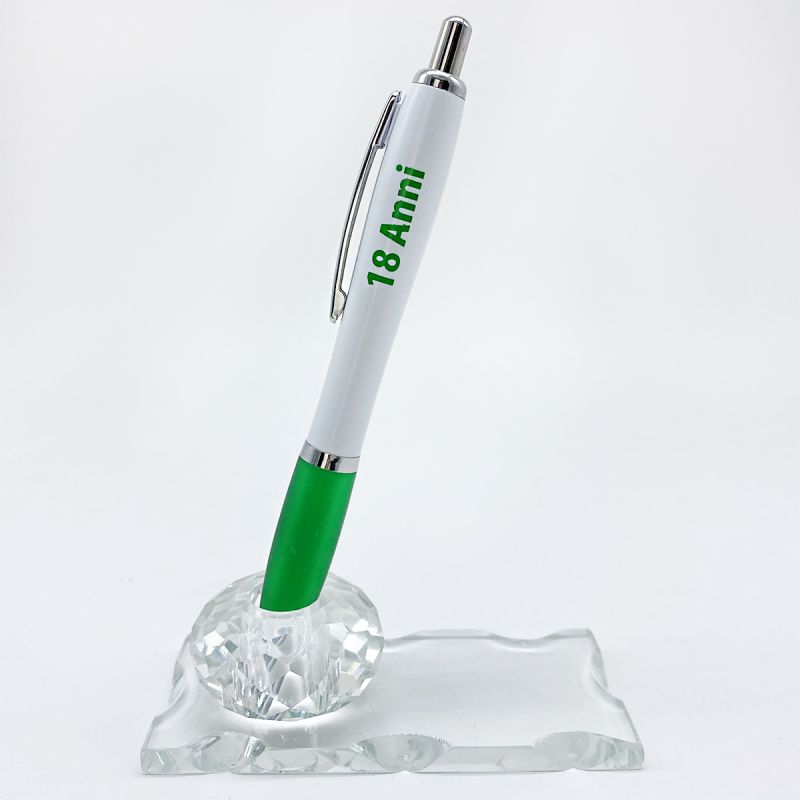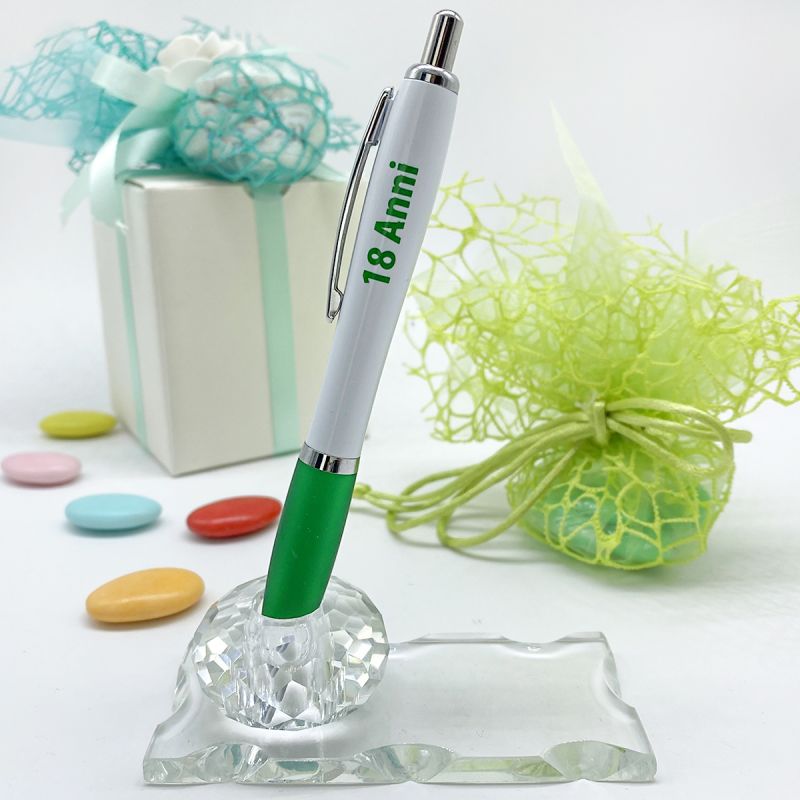 Acquista anche tu dalla nostra selezione di bomboniera utile diciottesimo questo set composto da portapenne in vetro con lavorazione cristallo e penna a sfera. Le penne sono di colore bianco e verde (tipico dei pensierini 18 anni) con dettagli in metallo e stampa di colore verde con dicitura "18 anni".