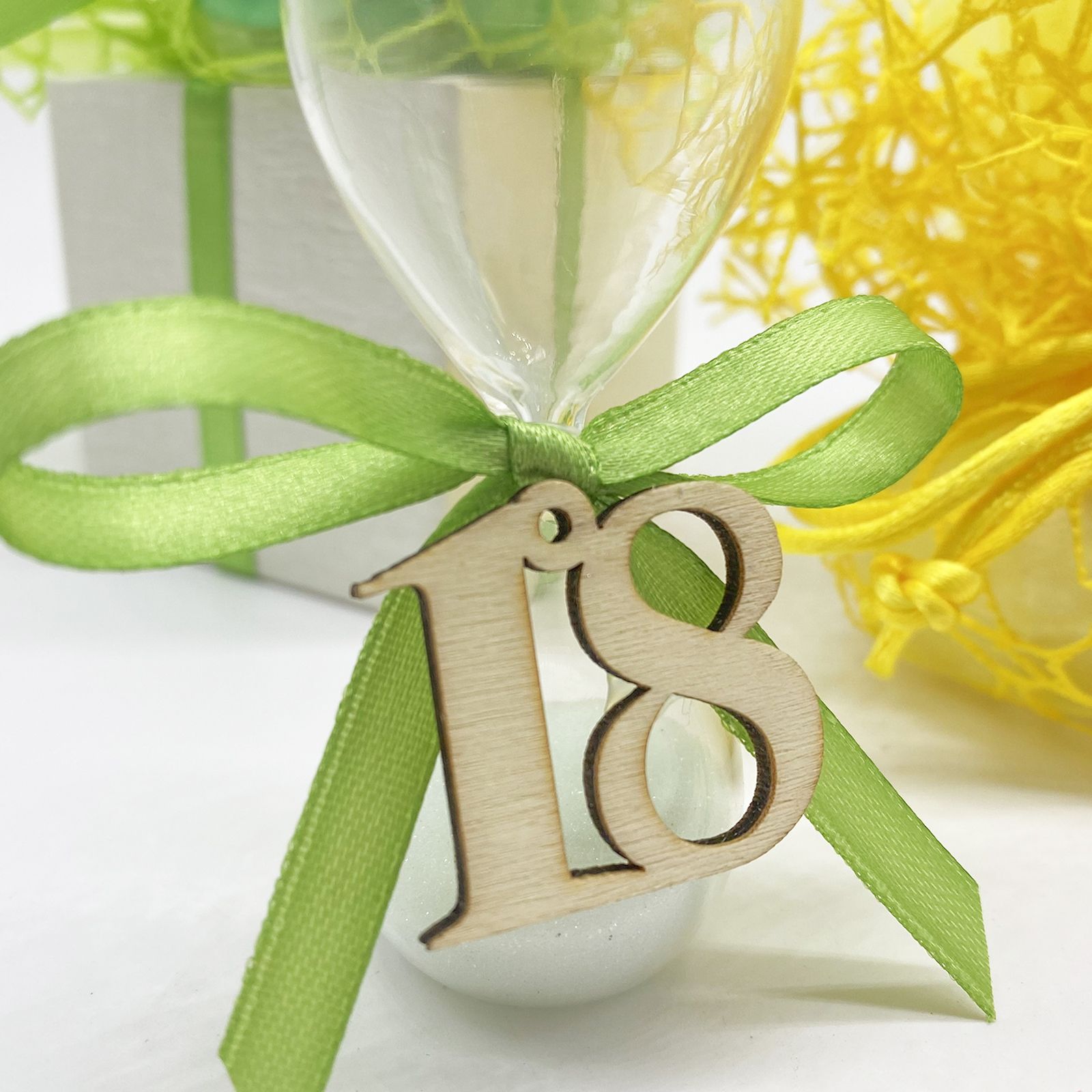 Ad ogni clessidra è abbinata un'applicazione in legno a forma di numero 18 in tonalità naturale.