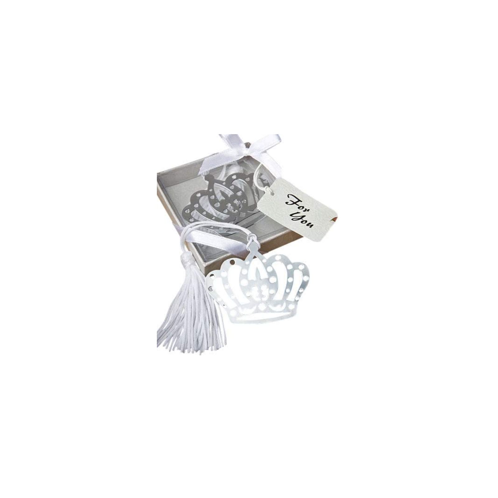 Scegli il nostro store e acquista questi segnalibri in metallo argentato a forma di corona con legata all'estremità superiore una piccola nappina bianca.
