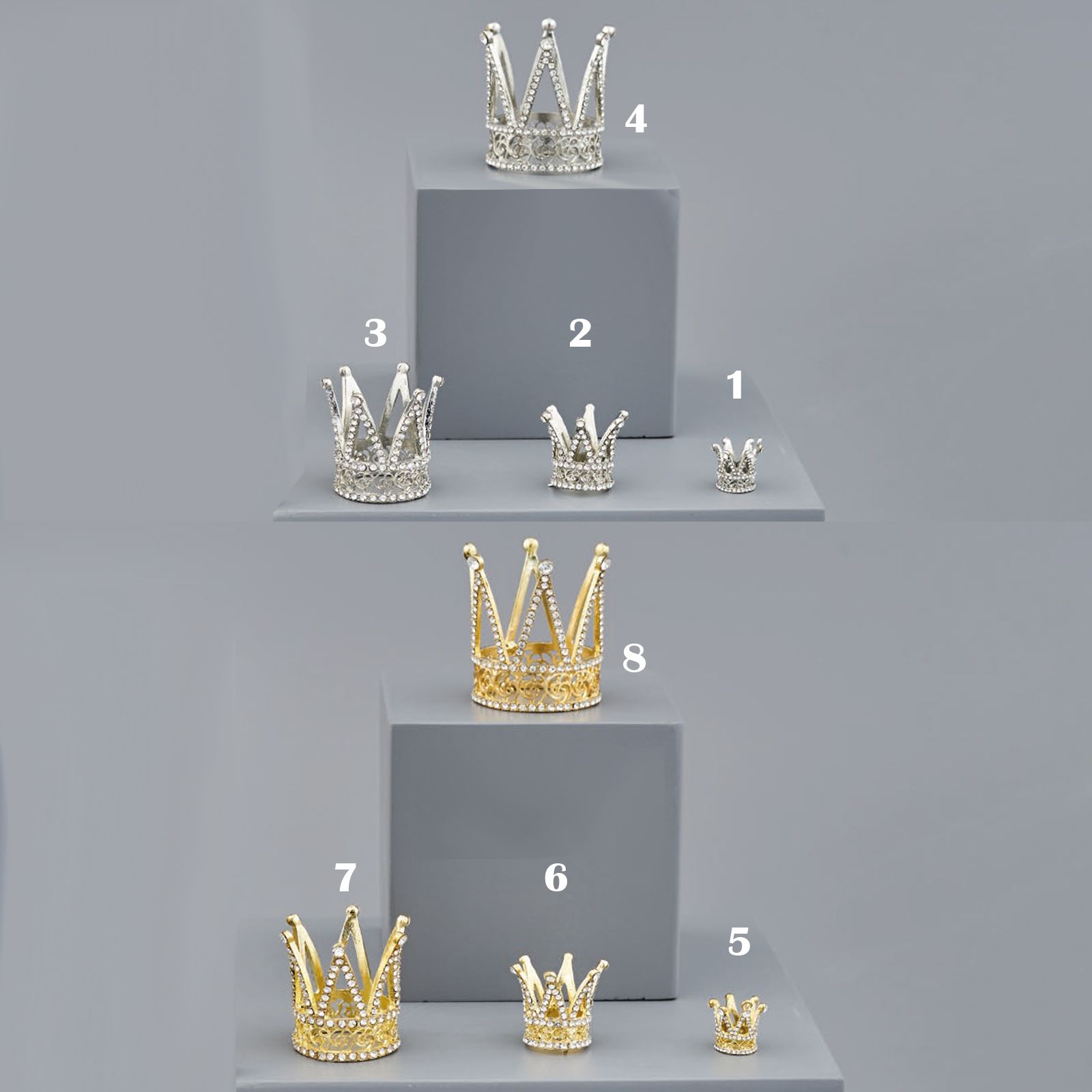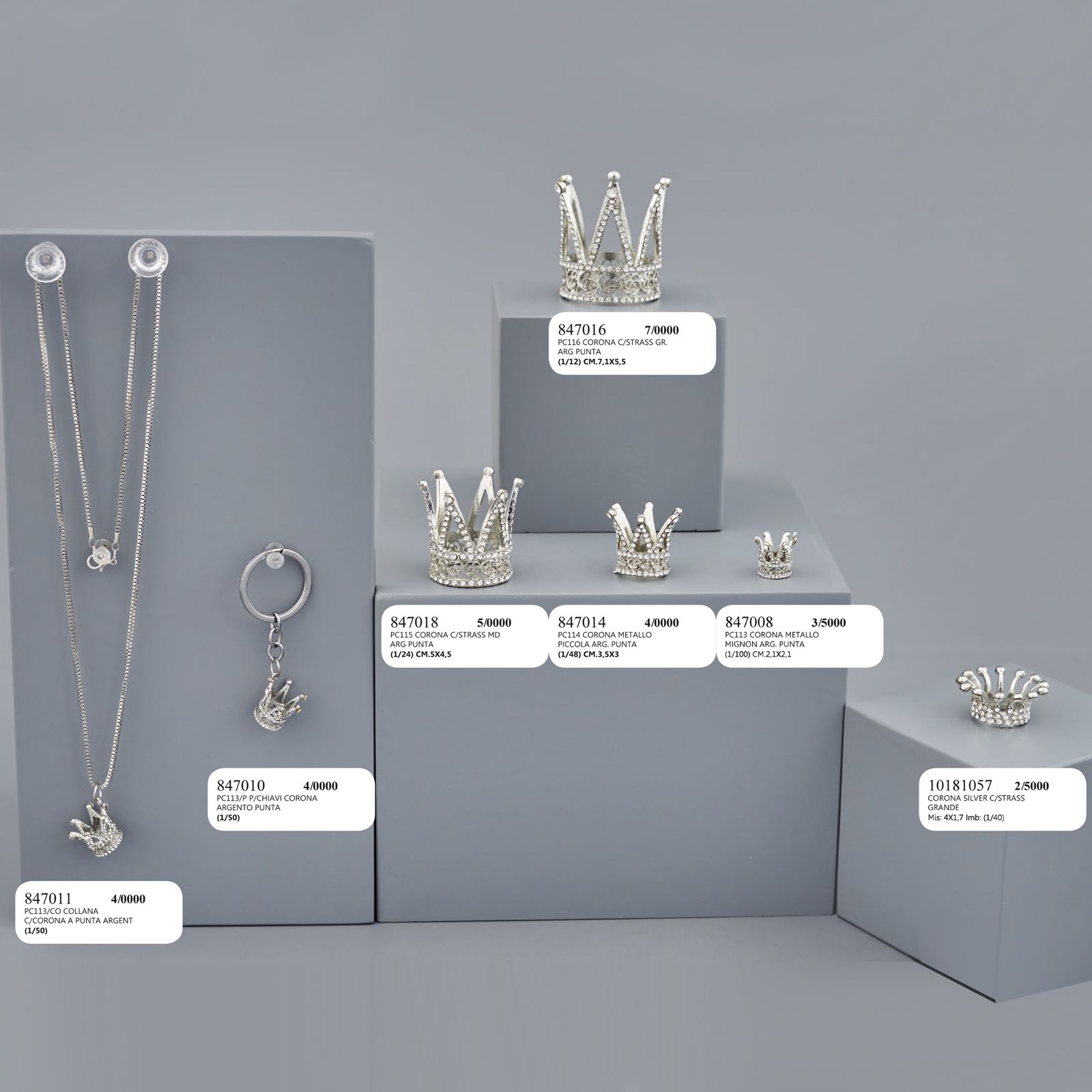Oggettini a forma di corona con strass in 4 misure differenti e in due finiture a scelta, con apertura a 6 punte.
