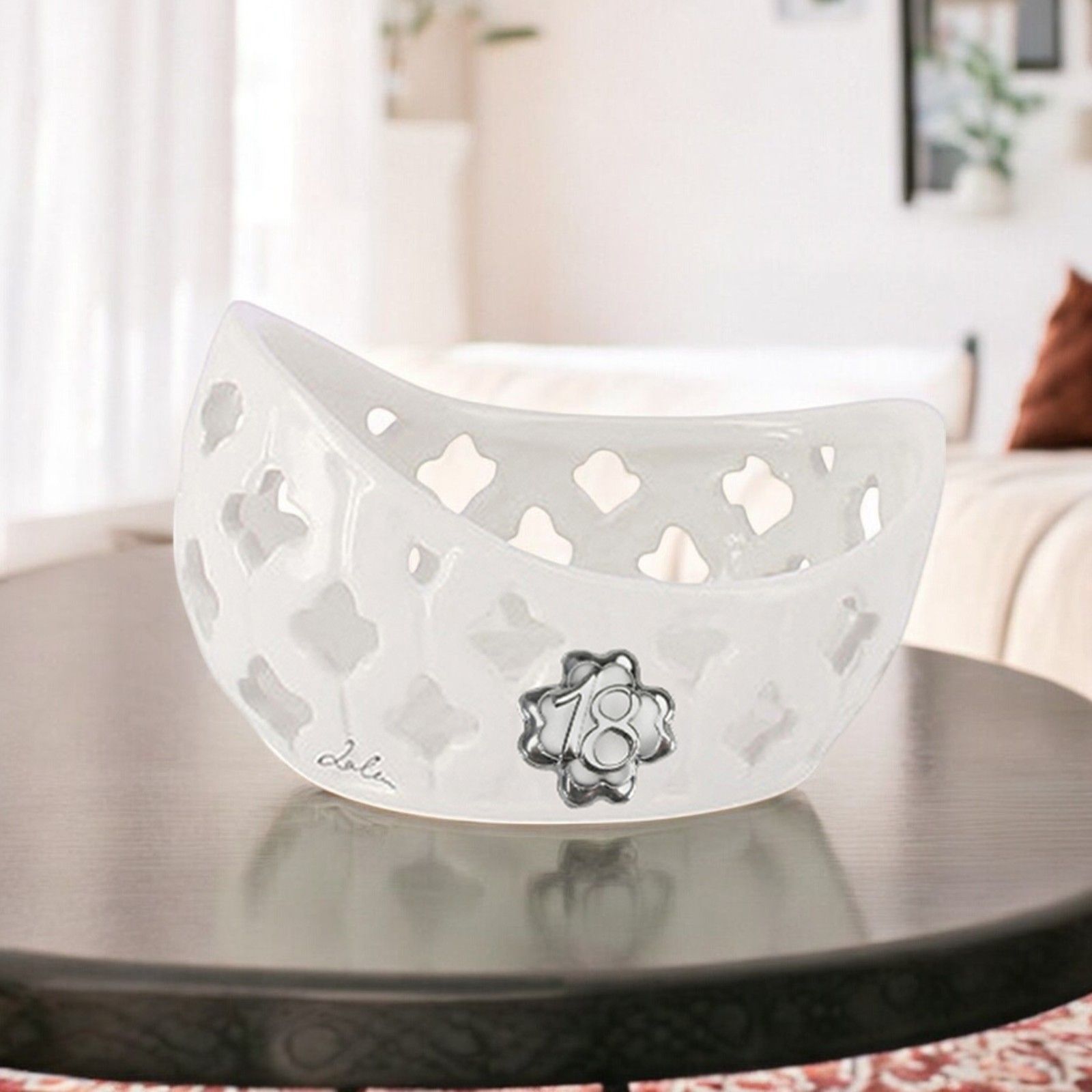 La nostra bomboniera Svuotatasche o portacandela traforato in ceramica bianca con lamina a forma di quadrifoglio e numero 18 è il regalo ideale per festeggiare un diciottesimo compleanno in modo speciale. Con dimensioni di 8 x 6 cm, questo elegante oggetto può essere utilizzato sia come svuotatasche che come portacandela, aggiungendo un tocco di raffinatezza all'evento.