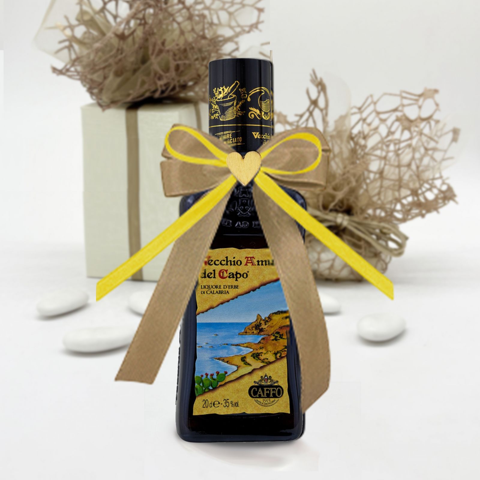 Per aggiungere un tocco di eleganza e raffinatezza al tuo evento, scegli la bomboniera bottiglia liquore con il pregiato Vecchio Amaro del Capo. Questa mini bottiglia da 20 cl (dimensioni: h 18,5 x 5 cm) è la bomboniera ideale per chi cerca qualcosa di originale e di classe per eventi come compleanni, matrimoni, anniversari o cerimonie speciali.