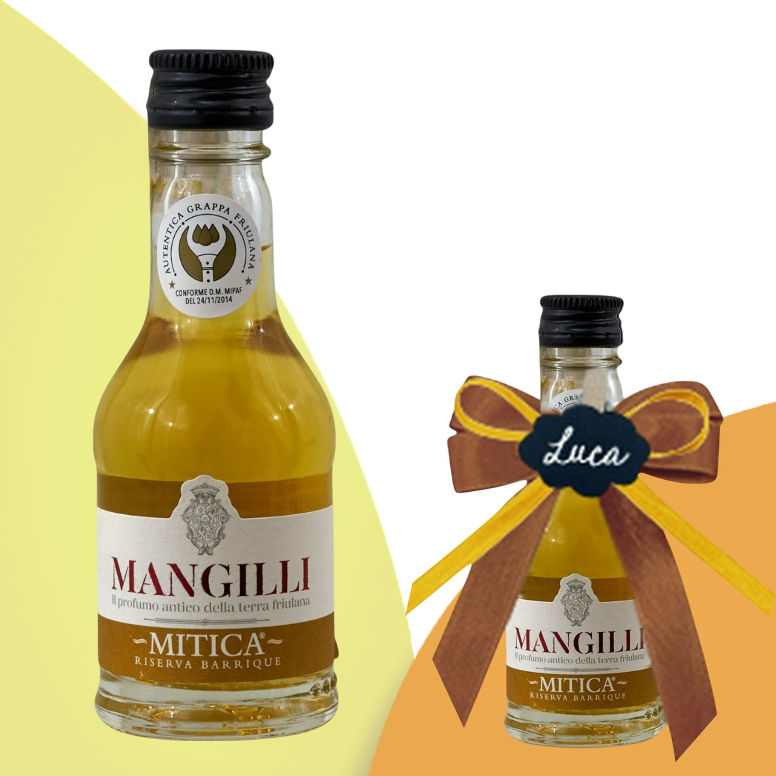 Regala un tocco di eleganza e raffinatezza con l'Autentica Grappa Friulana "Mangilli". Questa bomboniera è perfetta per eventi speciali come compleanni, anniversari, matrimoni e altre occasioni importanti. La bottiglia da 30 ml è un segnaposto originale ed economico che sicuramente farà felici i tuoi invitati.