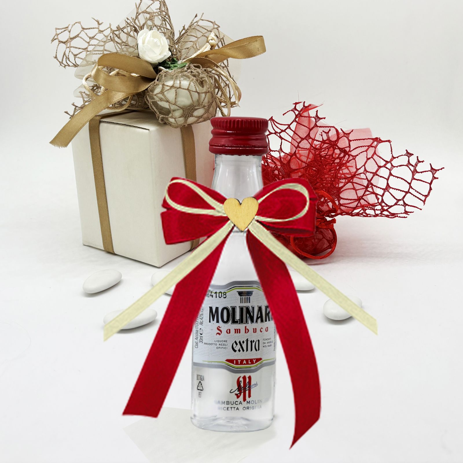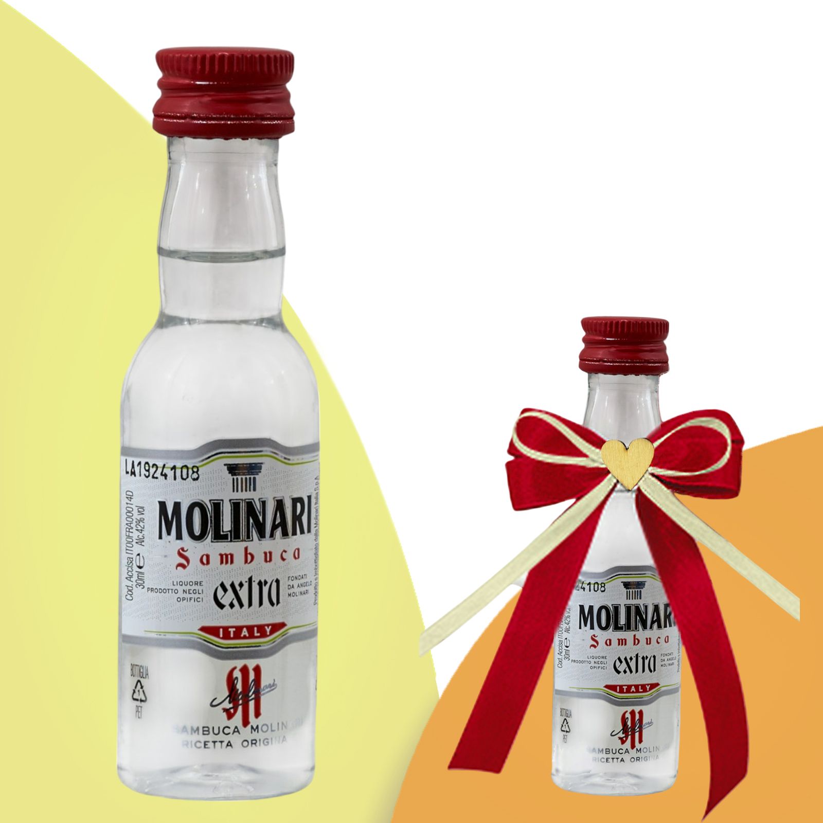 Scopri un'idea originale e di classe per le tue bomboniere con la nostra Sambuca Molinari bottiglia liquore mignon bomboniera. Perfetta per eventi speciali come compleanni, 30 anni, 40 anni, 50 anni, diciottesimi, matrimoni, anniversari e può essere anche utilizzata come segnaposto, questa bottiglia elegante aggiungerà un tocco di raffinatezza e glamour al tuo giorno speciale.