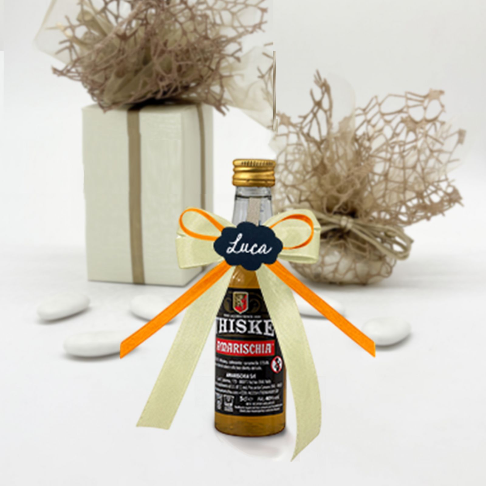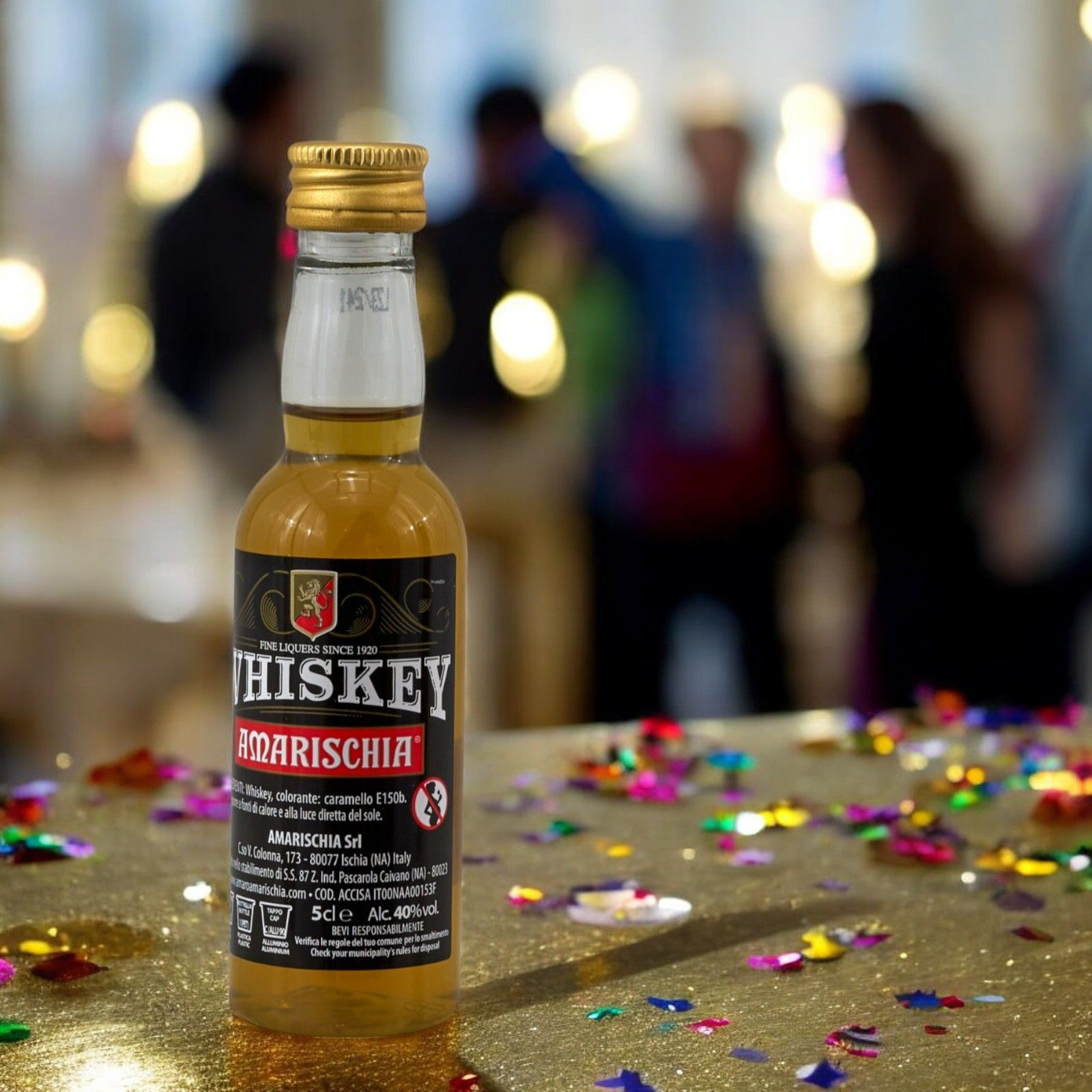 Il Whiskey Amarischia è un liquore pregiato, con un volume alcolico del 40%. Le bottiglie hanno una dimensione di 5 cl, con una misura approssimativa di 11,5 x 3 cm. Realizzate in plastica di alta qualità, sono perfette come segnaposto o regalo per i tuoi ospiti.