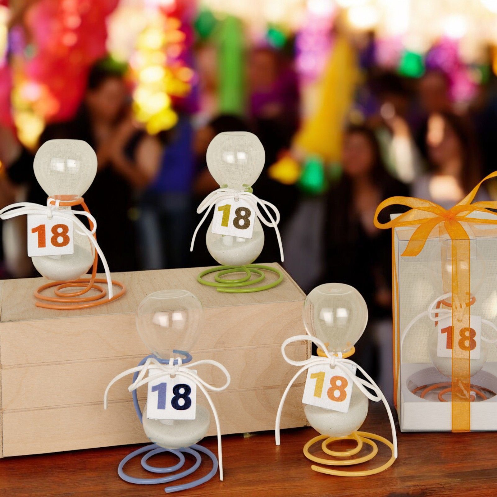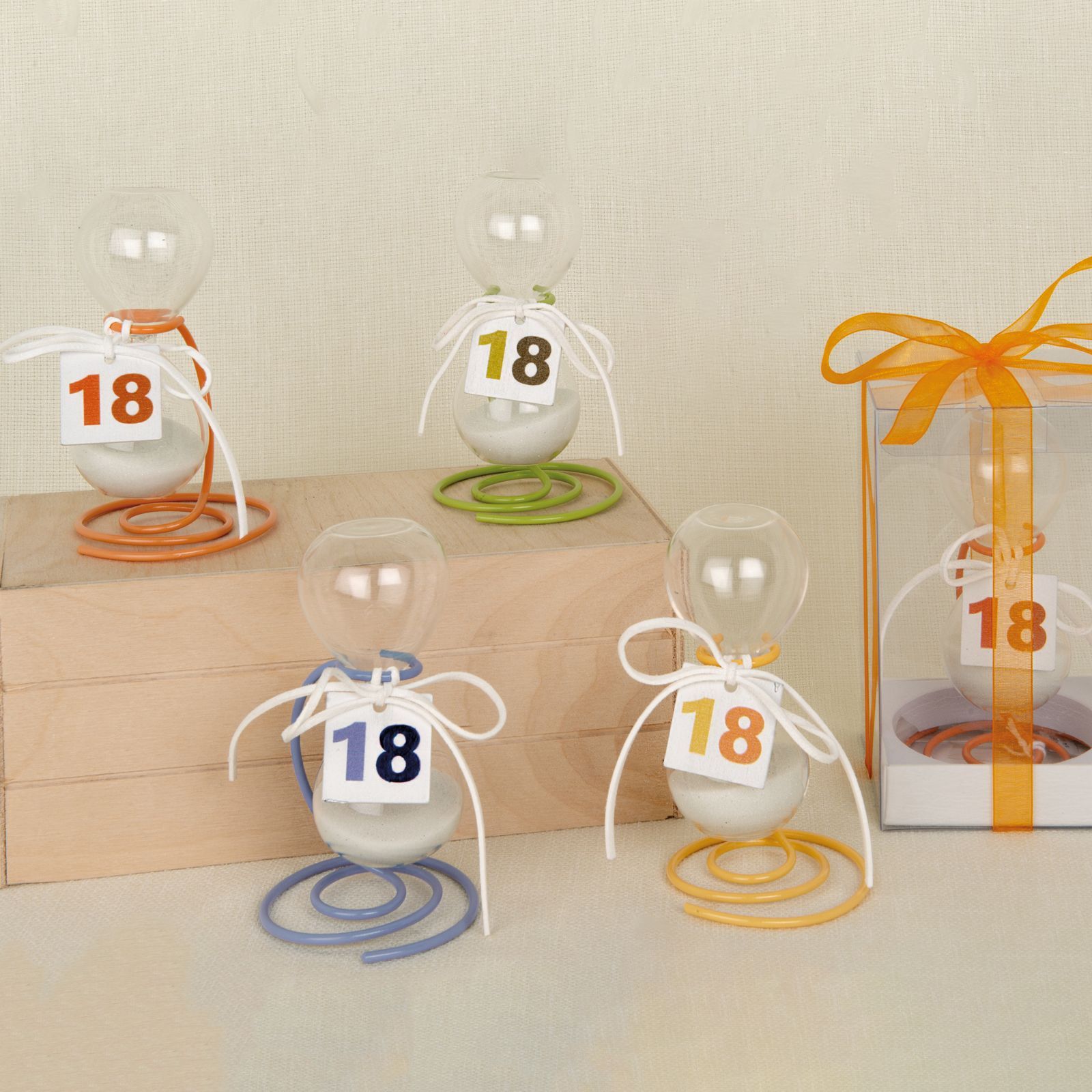 Le bomboniere sono un segno di attenzione e cura. Questa clessidra con sabbia bianca e il numero 18, arricchita dal nastrino bianco e dalla targhetta numerata, è un'idea originale che dona un tocco di eleganza e raffinatezza.