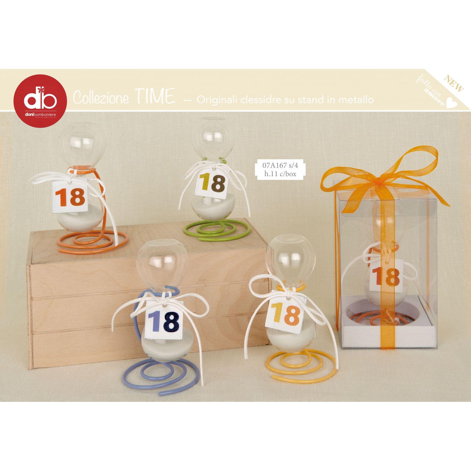 La clessidra con sabbia bianca e nastrino bianco al collo, con targhetta numero 18 e assorita in vari colori, è l'ideale per celebrare un diciottesimo compleanno in modo speciale. Realizzata in vetro e metallo, ha un'altezza di circa 11 cm e si trova in tre colori assortiti: arancio, verde e blu, per una bomboniera elegante e originale.