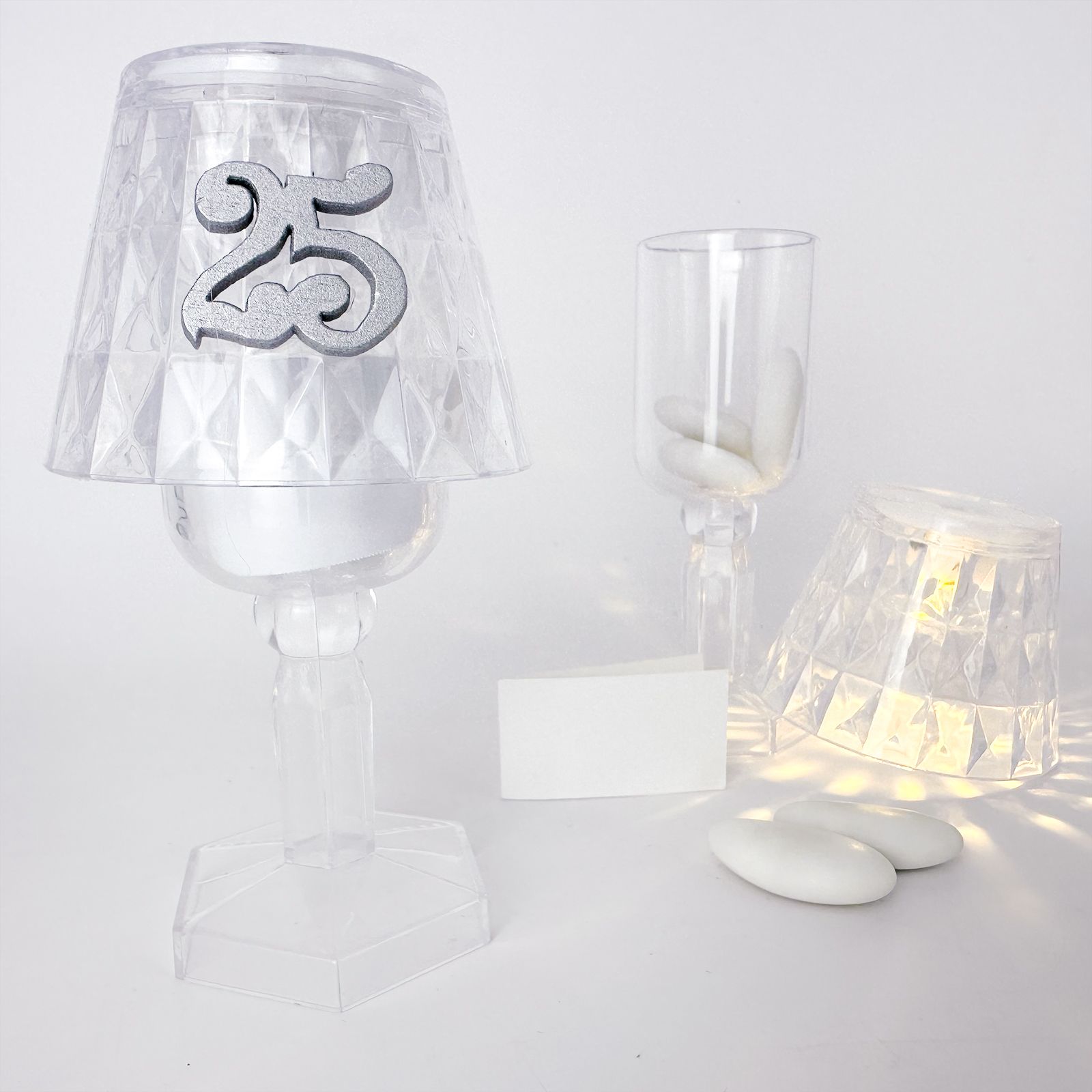 Celebra le nozze d’argento con eleganza grazie a questo splendido lumetto LED con il numero 25, simbolo di un amore solido e duraturo. Il raffinato design argentato lo rende un accessorio perfetto per arricchire la mise en place, fungendo da segnaposto esclusivo e ricordo prezioso per gli ospiti.