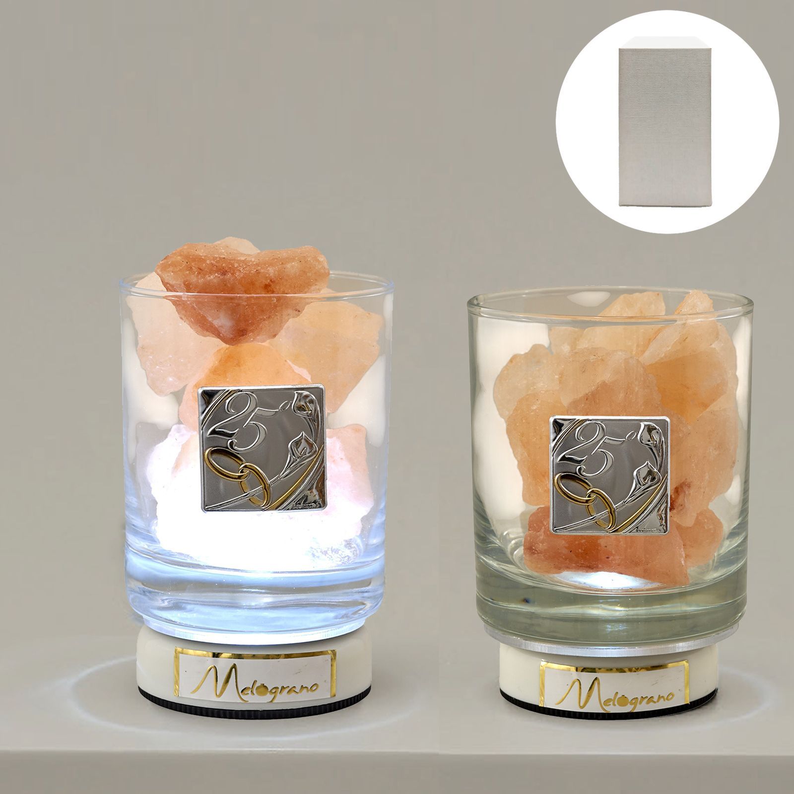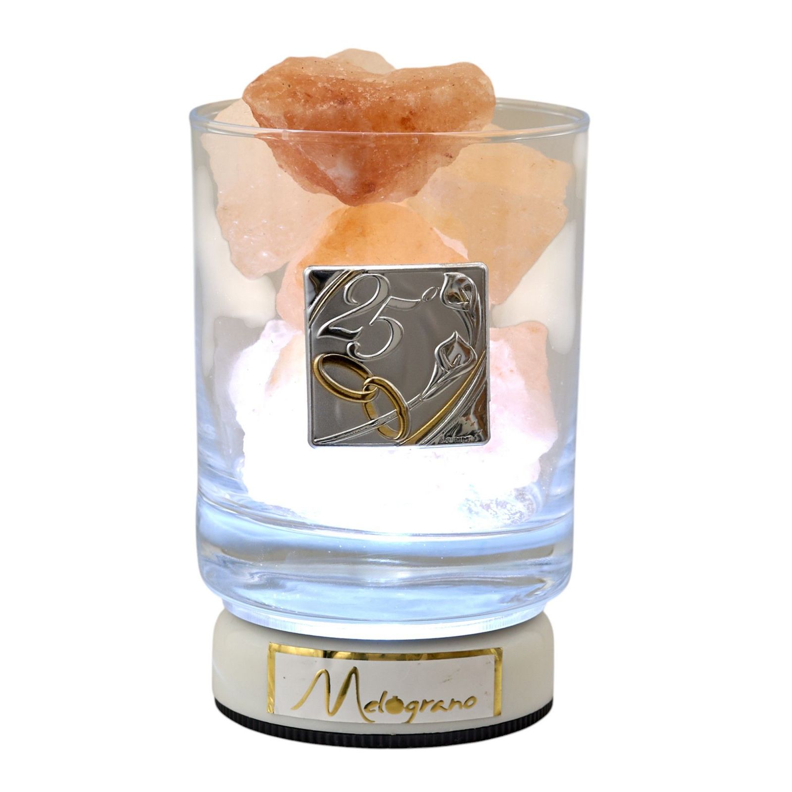 Nel giorno del vostro anniversario, regalate una bomboniera unica e speciale come la vostra storia d'amore. Questa lampada LED con vetro liscio e sale dell'Himalaya è un'idea regalo originale e particolare, perfetta per celebrare i vostri 25 anni insieme o le nozze d'argento.