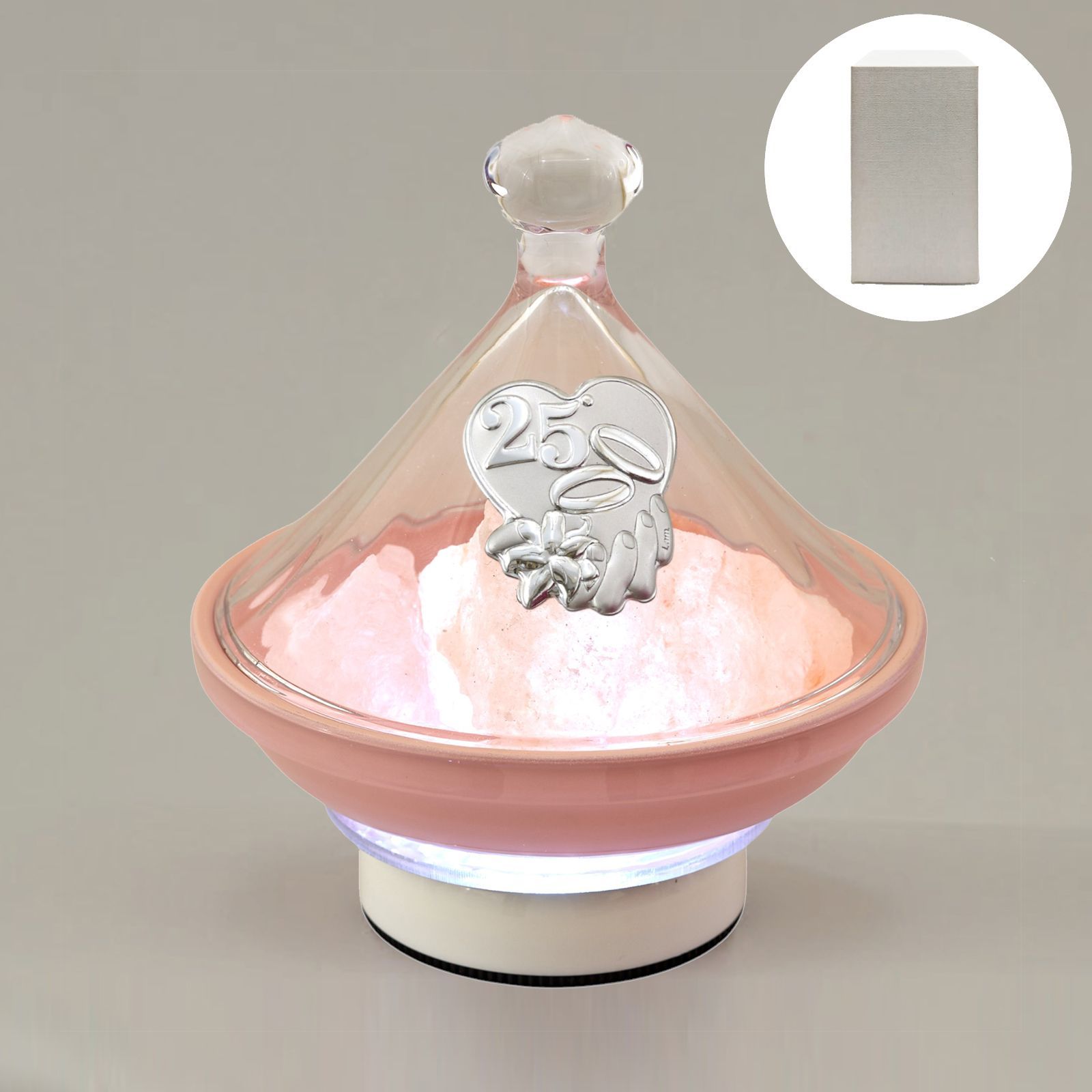 Un'idea unica per celebrare i 25 anni insieme: la lampada in sale rosa dell'Himalaya a forma di trullo. Con una placchetta che riporta il numero 25° e fedi, rappresenta il simbolo perfetto delle tue nozze argento. Elegante, originale e dal significato profondo.