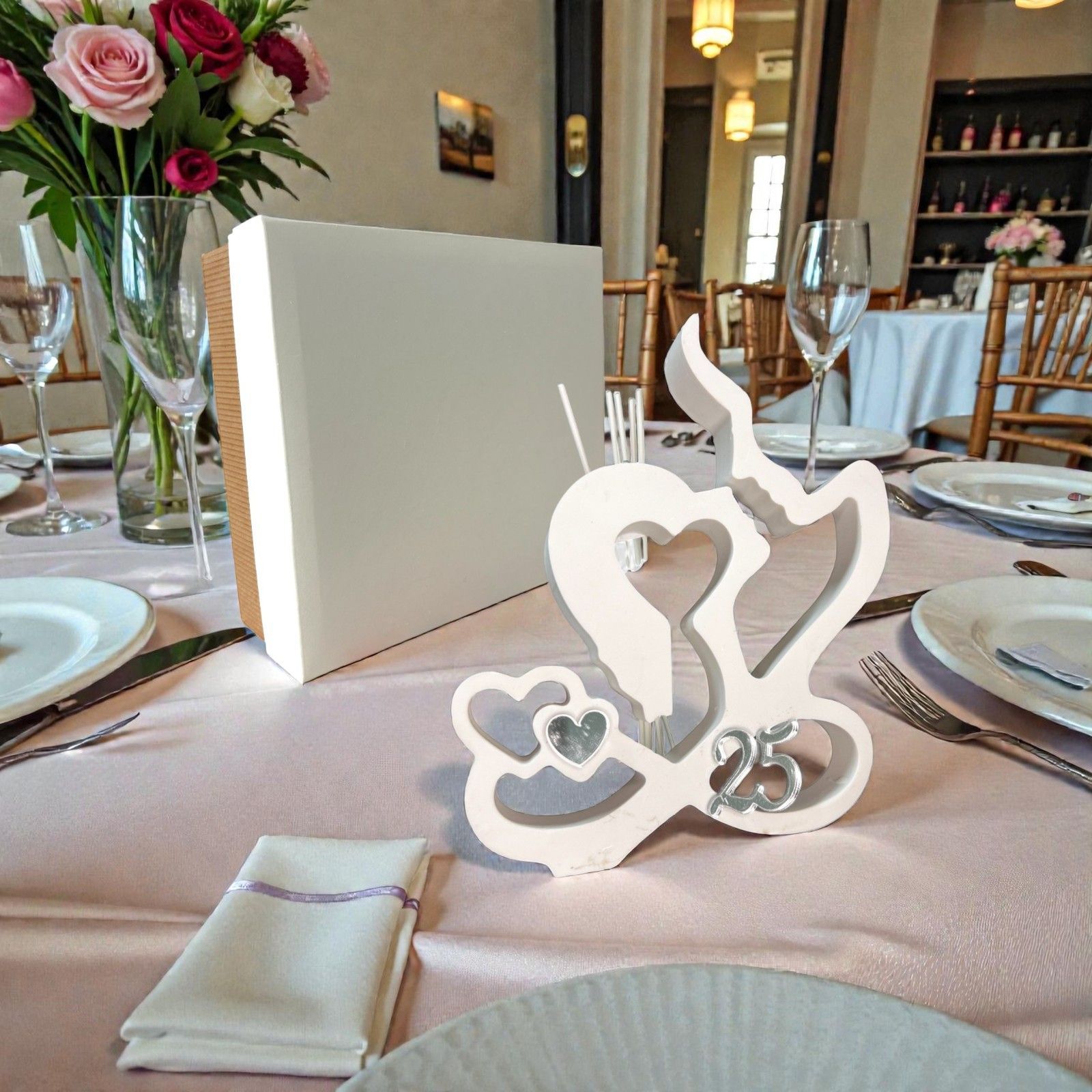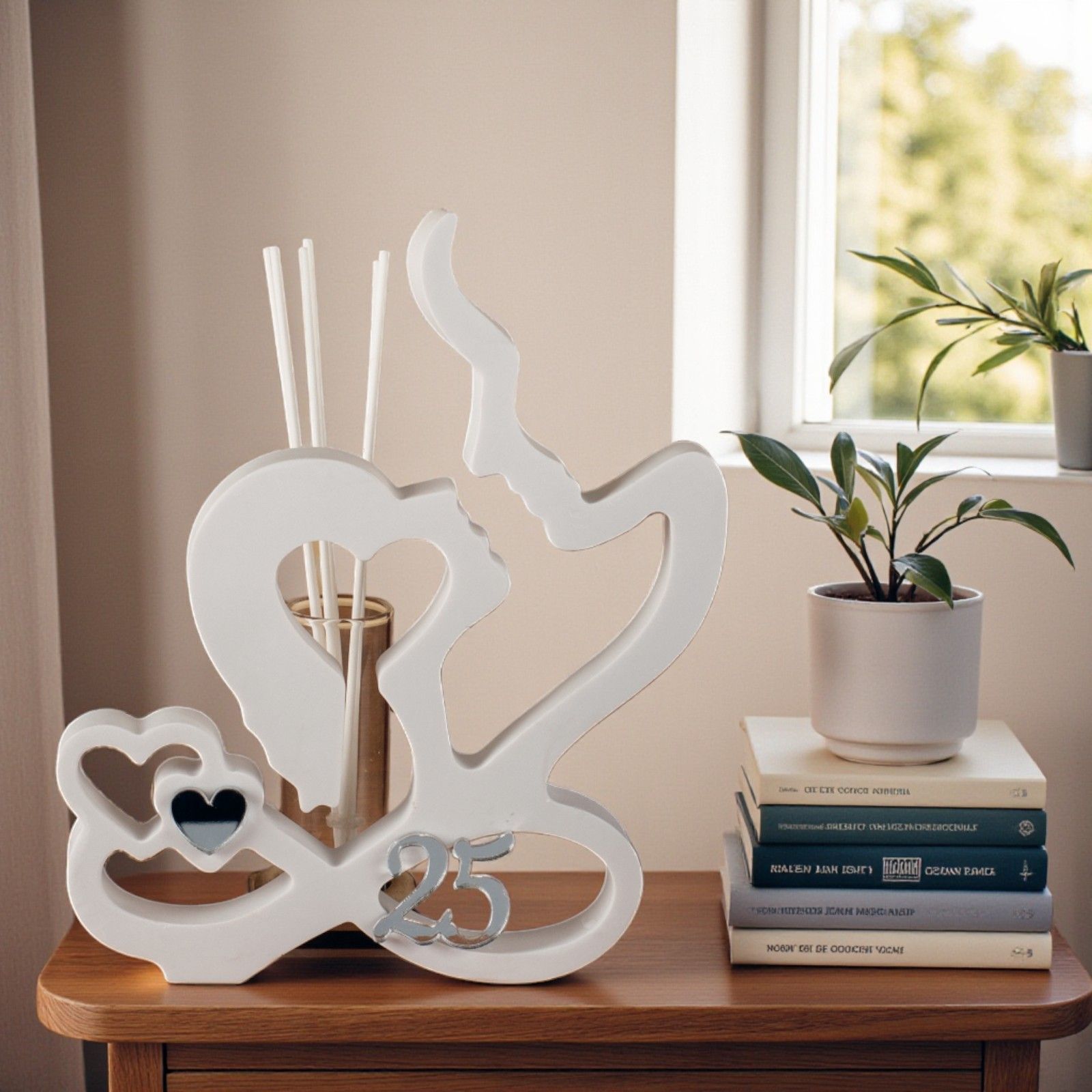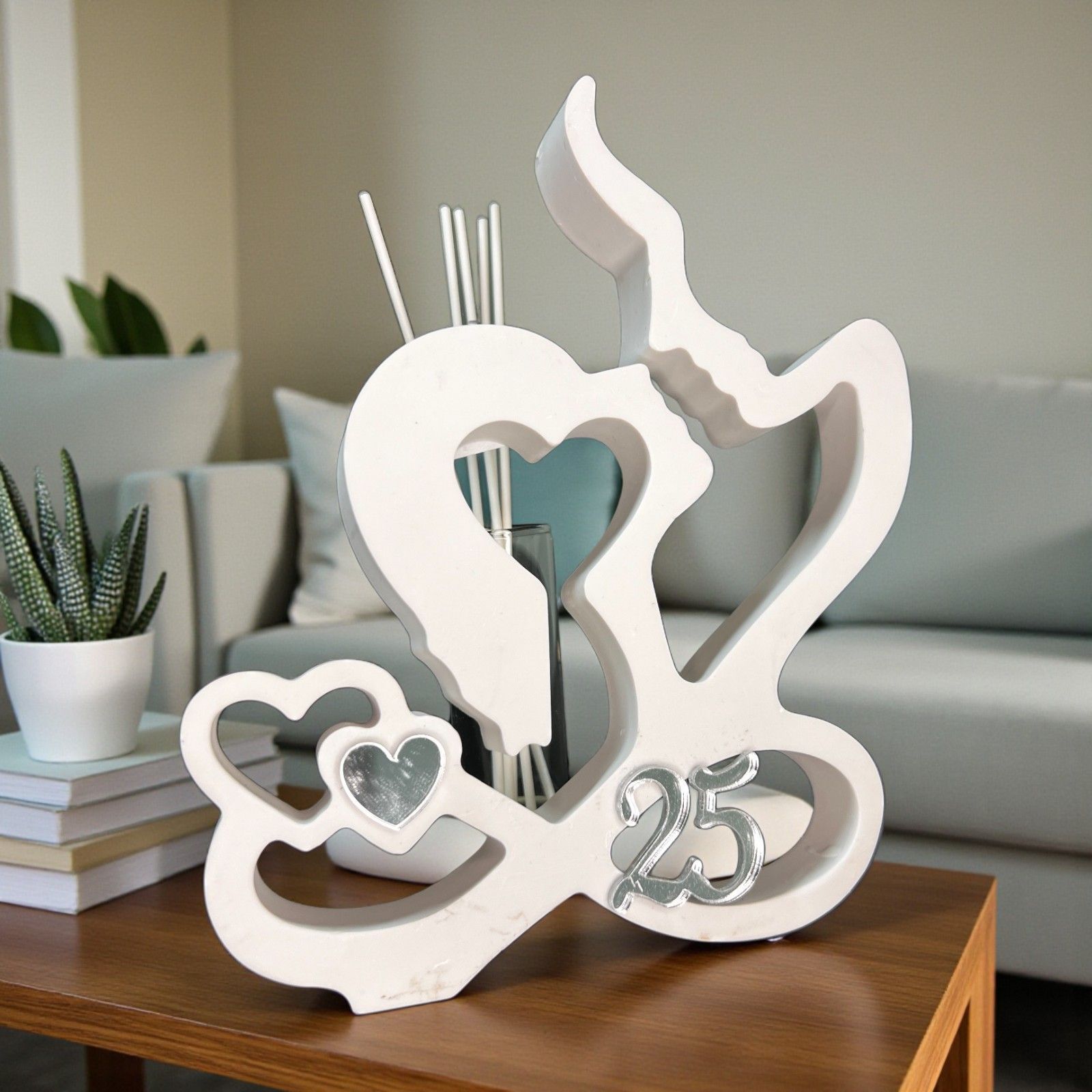 Realizzato in resina bianca, questo profumatore è adornato con un'applicazione argentata in plexiglass, che rappresenta un cuoricino e il numero 25, perfettamente abbinato al tema delle vostre nozze d'argento. La fiala in vetro per le essenze, situata sulla base in legno con tappo in sughero, aggiunge un tocco di eleganza e funzionalità, rendendo questo oggetto non solo un regalo, ma un elemento decorativo per la casa.
