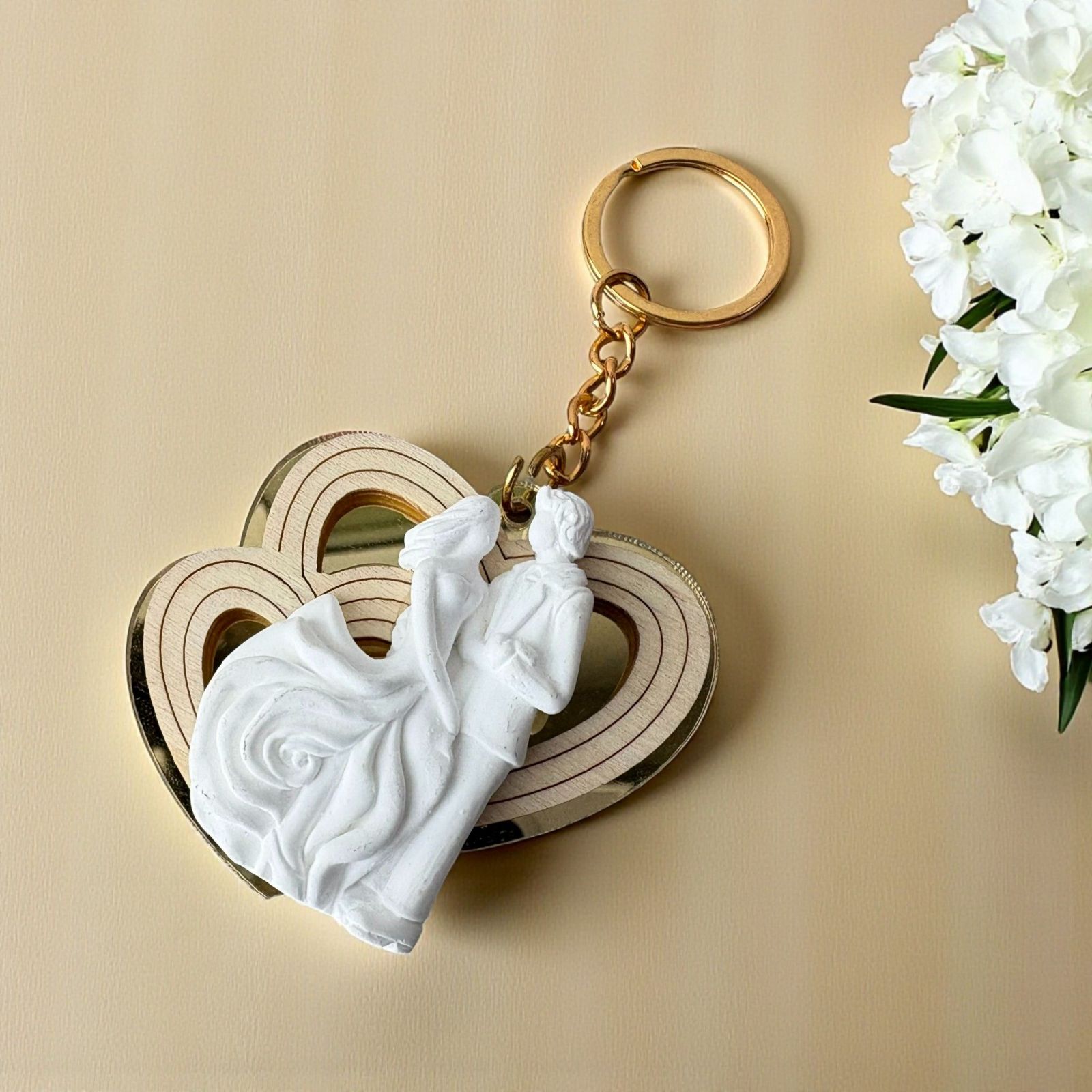 Realizzato con materiali di alta qualità come plexiglass, legno e gesso, il nostro portachiavi presenta un design elegante con un fondo dorato in plexiglass e una sagoma che rappresenta due cuori intrecciati in legno. Il gessetto bianco con sposini aggiunge un tocco di dolcezza, rendendolo un perfetto segnaposto o un delizioso omaggio per la tua confettata.