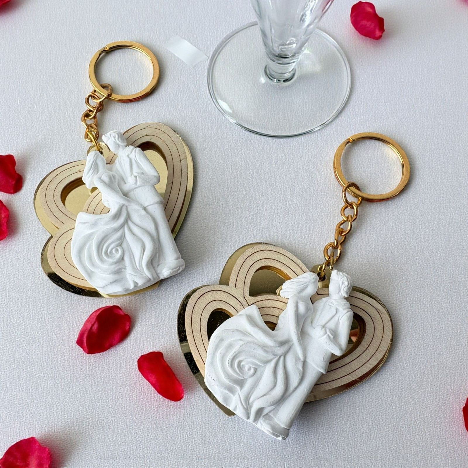Il nostro portachiavi cuori è anche un'idea originale per festeggiare le bomboniere anniversario. La catenina e l'anello portachiavi dorati conferiscono un tocco di classe, mentre il colore oro specchiato e il bianco creano un'eleganza senza tempo. Regala un pezzo di amore e felicità ai tuoi ospiti e rendi il tuo evento indimenticabile.