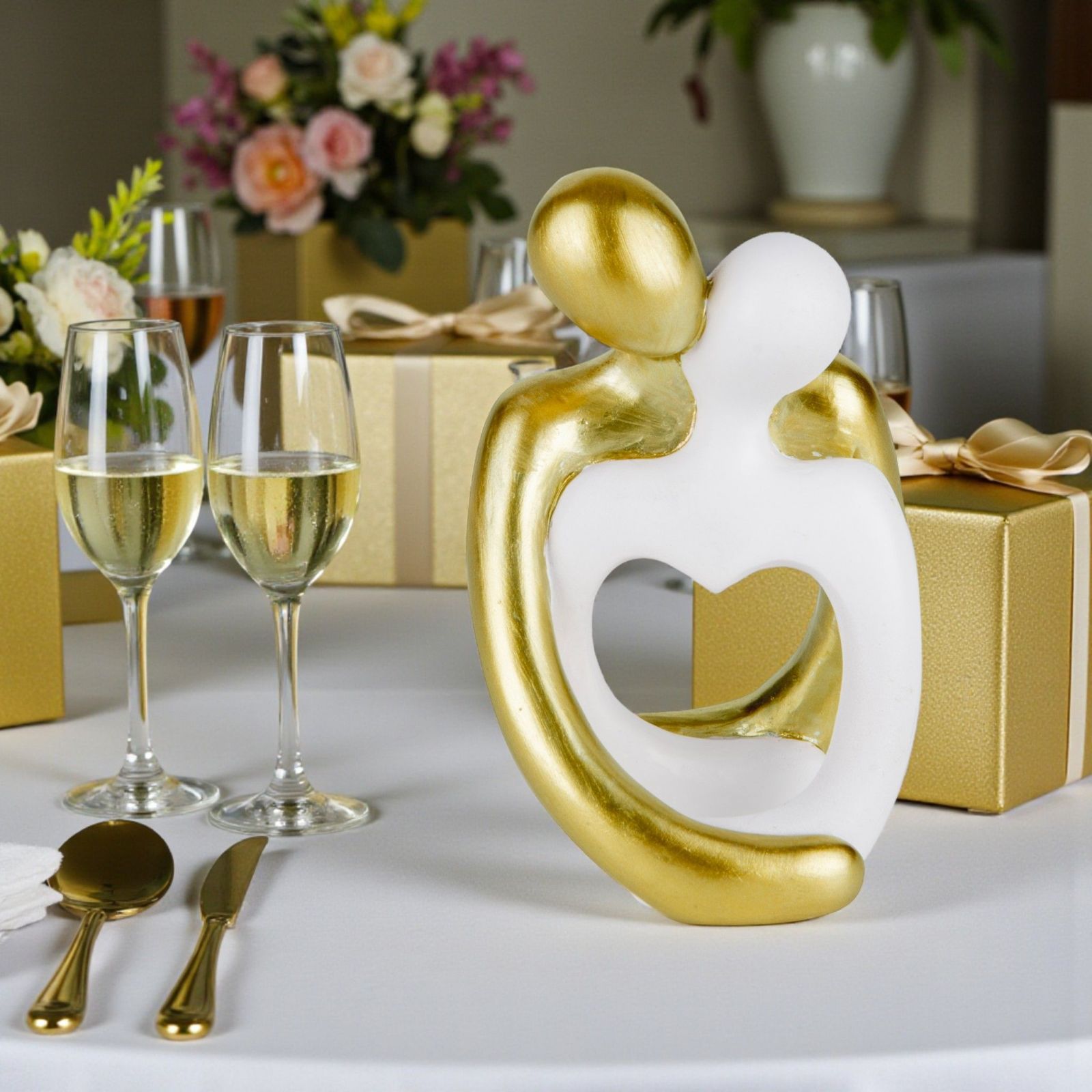 Avvolge il cuore questa elegante bomboniera in resina che raffigura una coppia artistica abbracciata mentre si bacia, con un delicato cuore posizionato al centro. Nelle sue tonalità bianco e oro, diventa un simbolo di unione profonda, perfetto per celebrare promessa, matrimonio o anniversario con idee ricche di emozione e di stile.
