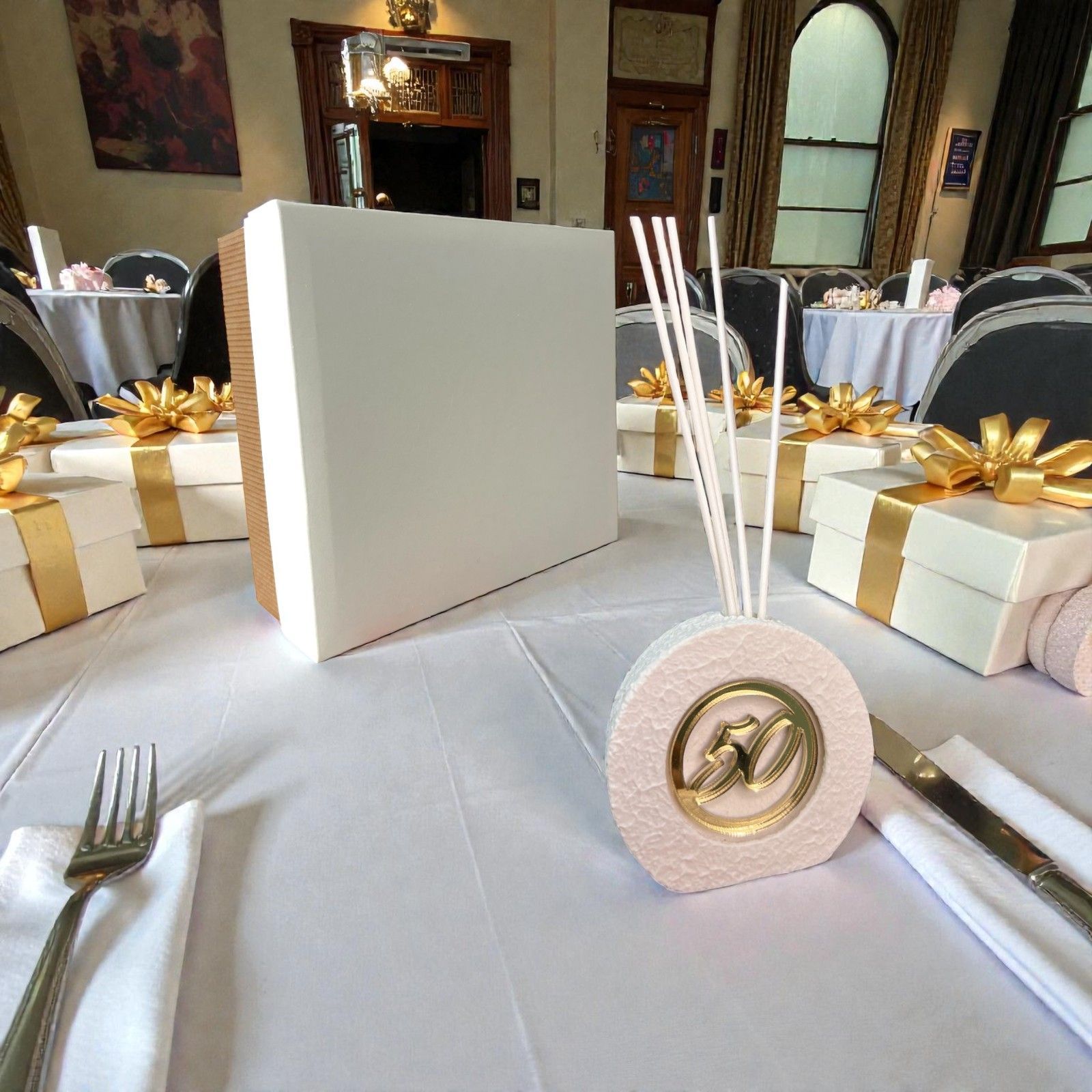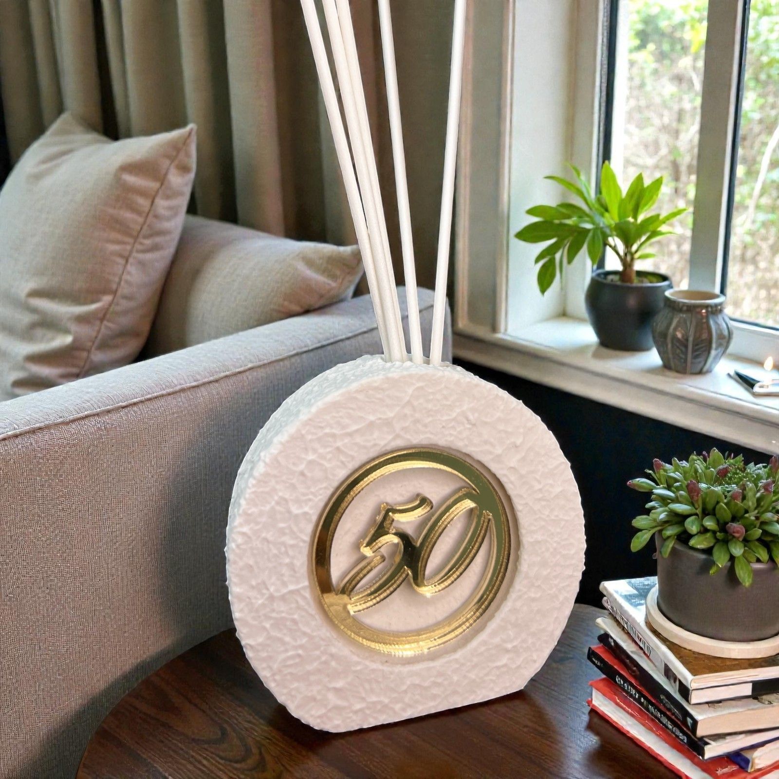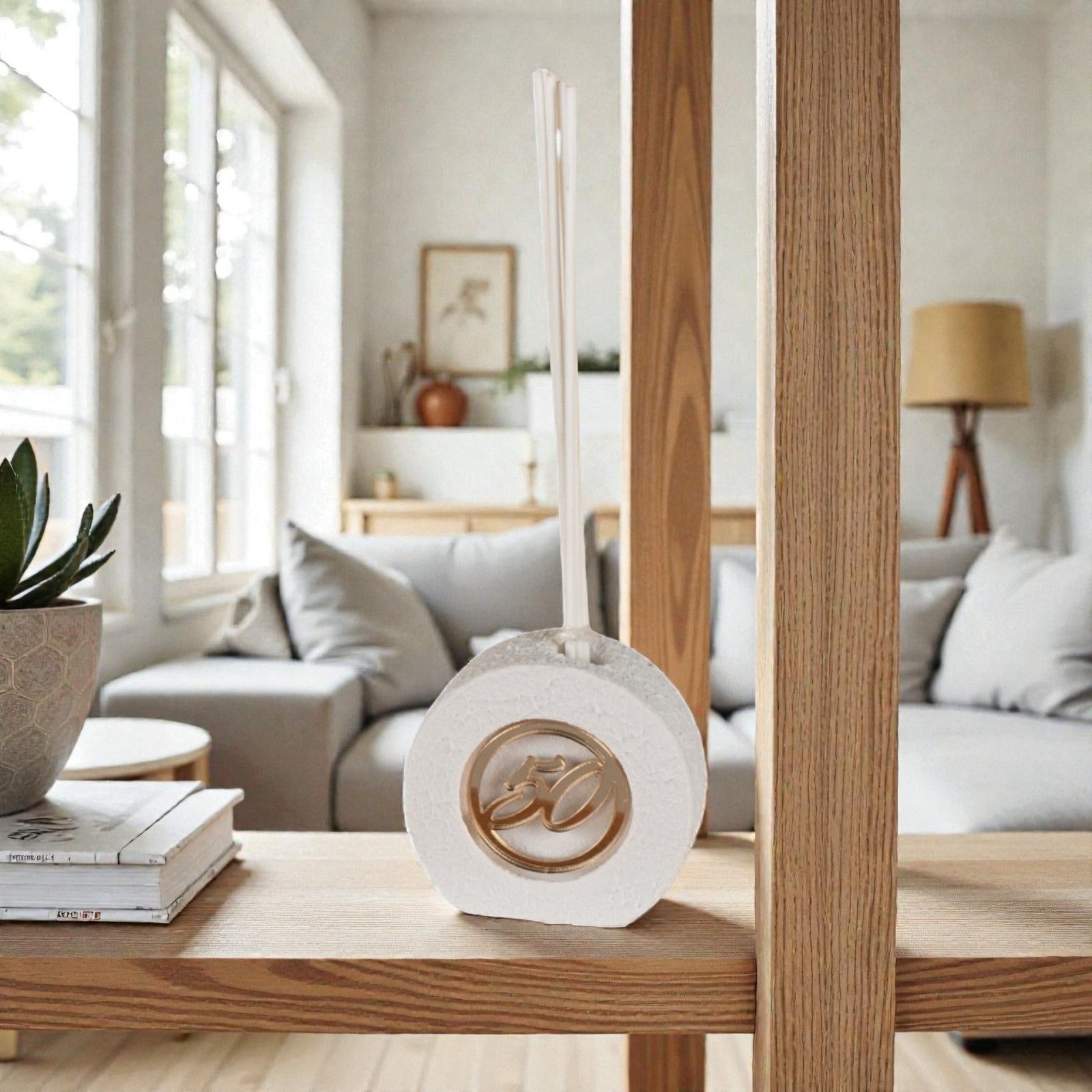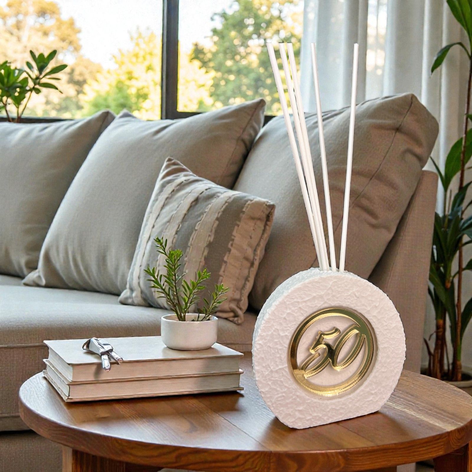 Realizzato in resina effetto pietra, questo diffusore si distingue per la sua raffinatezza. Il design tondo, impreziosito da un'applicazione in plexiglass dorato che rappresenta il n°50, trasmette un senso di eleganza e amore eterno. Insieme alla scatola regalo, ai bastoncini e all'essenza profumata inclusi, ogni dettaglio è pensato per rendere il tuo evento ancora più speciale.