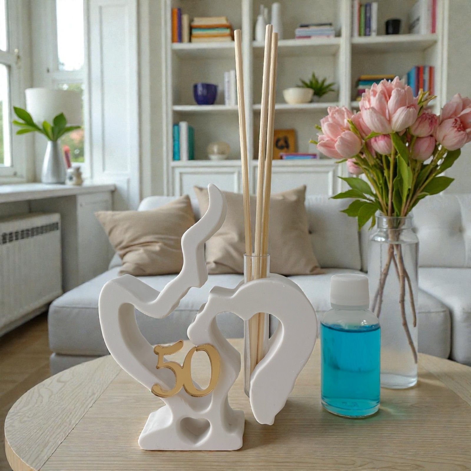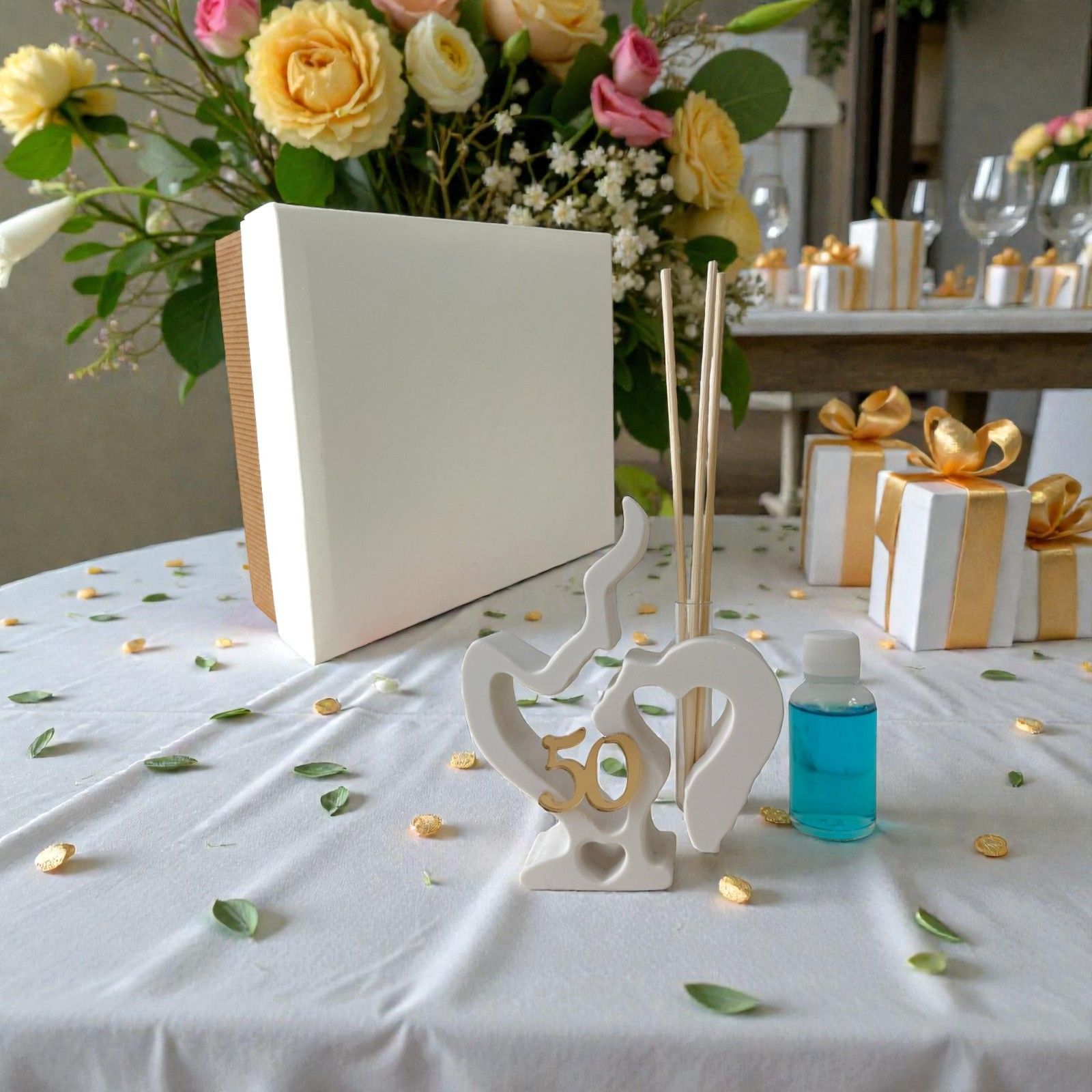 Completa il tuo evento con una bomboniera che racconta una storia: quella di una coppia che ha superato insieme le sfide e ha festeggiato le gioie della vita. Con l'applicazione in plexiglass dorato con il numero 50, questo diffusore non è solo un accessorio decorativo, ma un simbolo di amore duraturo. Ogni confezione include anche scatola, bastoncini e un'essenza profumata, per un'esperienza olfattiva che accompagnerà gli ospiti in un viaggio di emozioni e ricordi.