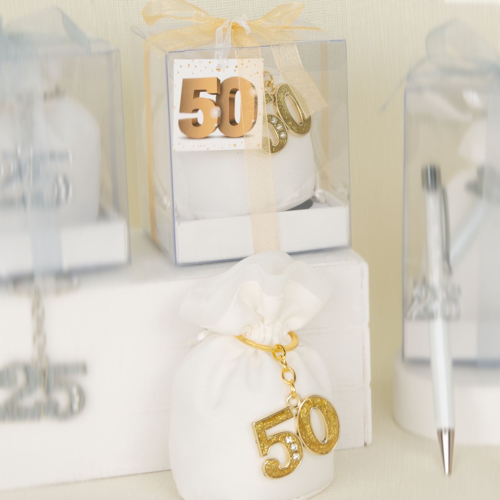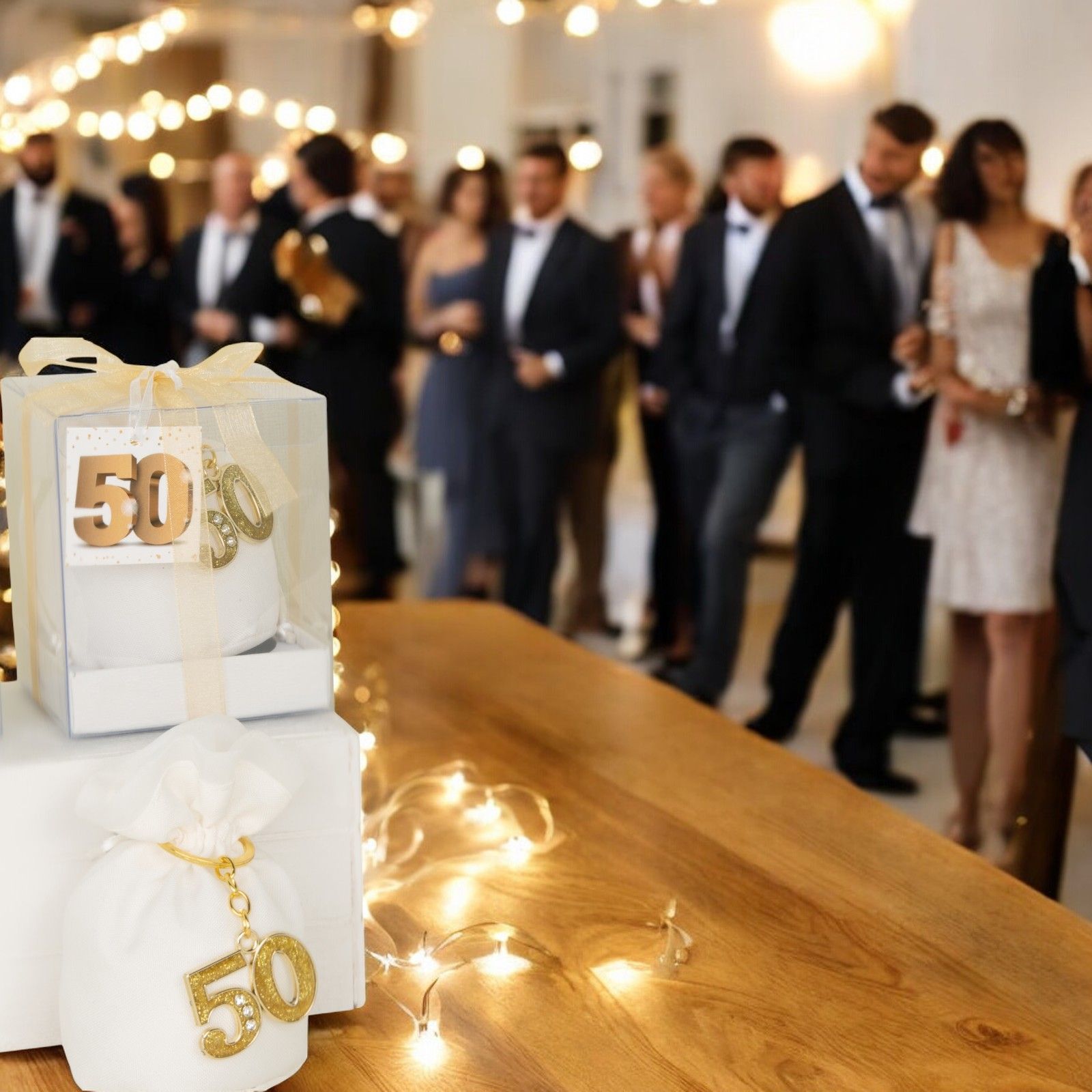 Il numero 50 simboleggia la longevità e la solidità del legame, rendendo questa bomboniera un regalo significativo per ringraziare gli ospiti.