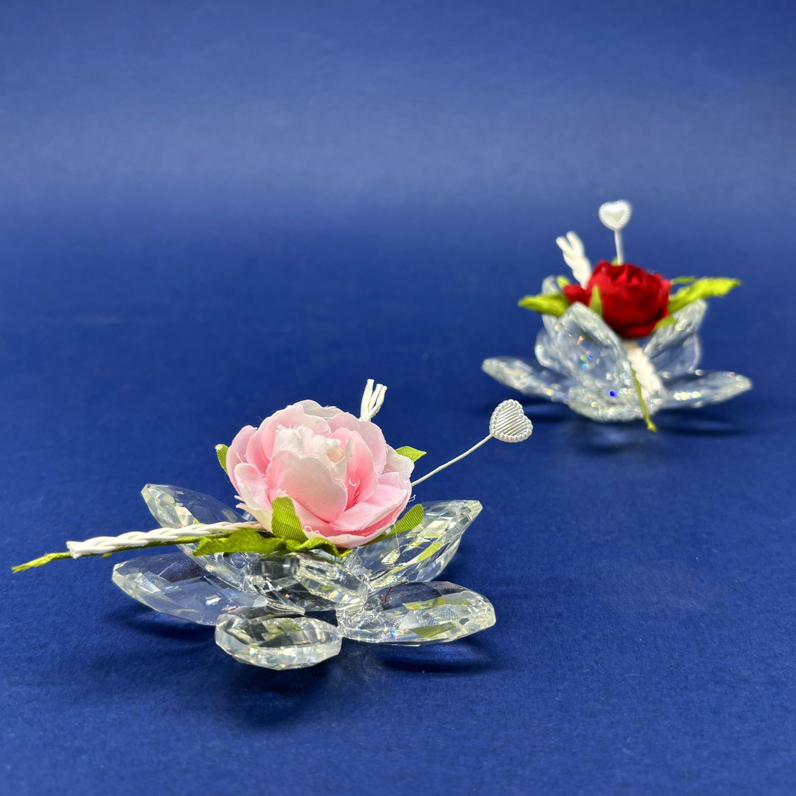 La bomboniera misura circa 8x8 cm, con il bocciolo che raggiunge i 3 cm. Il colore rosa conferisce un'aura di eleganza e femminilità, perfetto per un evento speciale come un battesimo o una comunione. Realizzata interamente in cristallo, questa bomboniera è un'opera d'arte da regalare e conservare come ricordo prezioso.