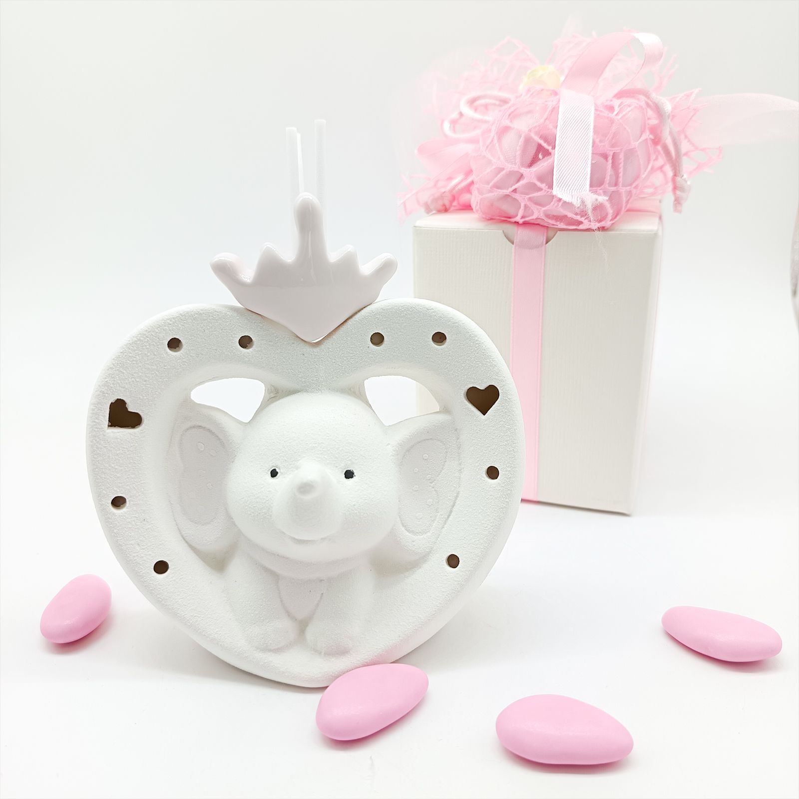 L’elefantino simboleggia dolcezza e protezione, il cuore richiama l’amore familiare. Una bomboniera ideale per il battesimo, pensata per lasciare un ricordo speciale e profumato agli invitati.