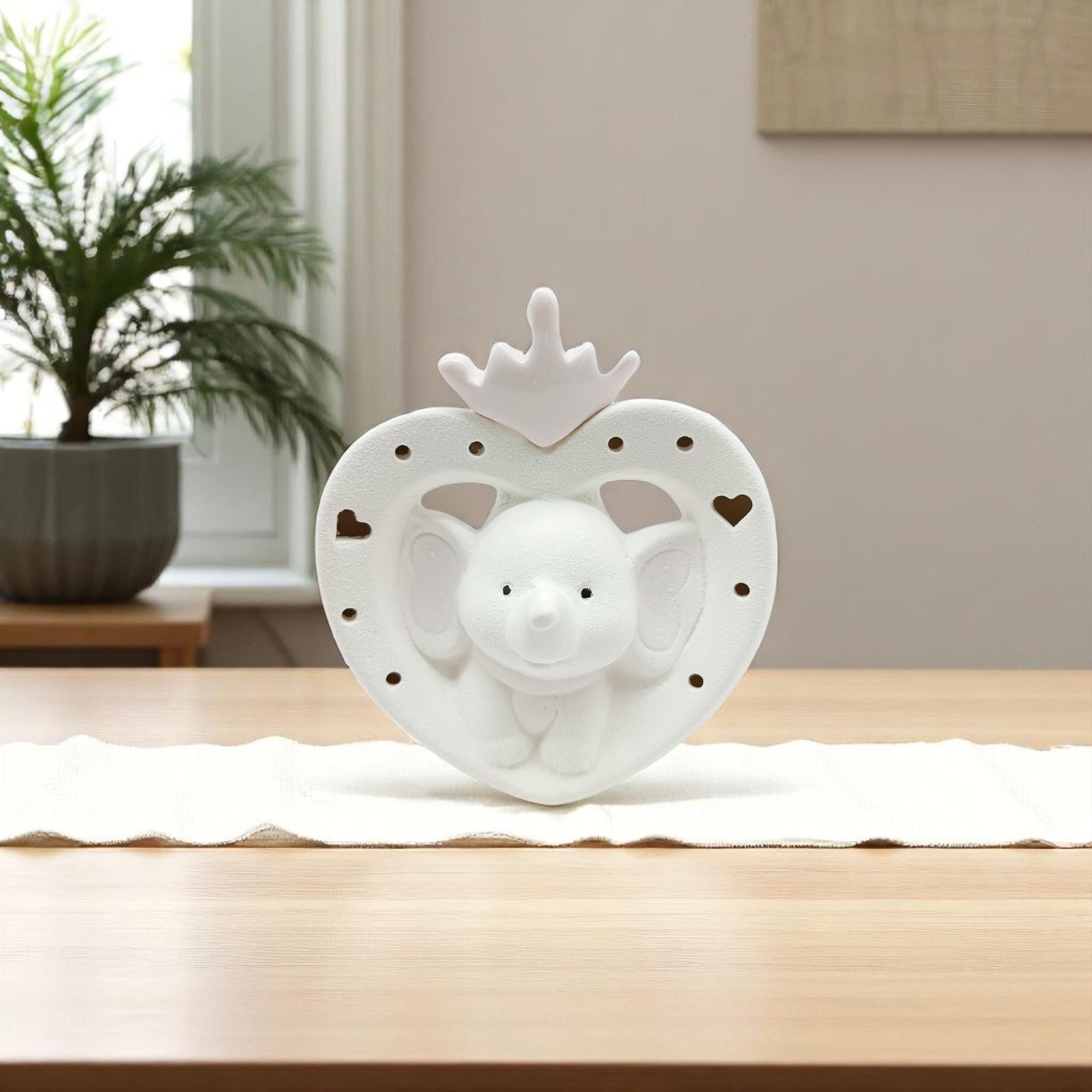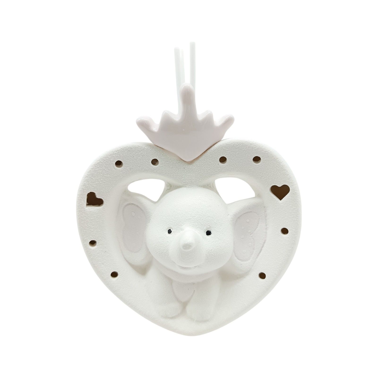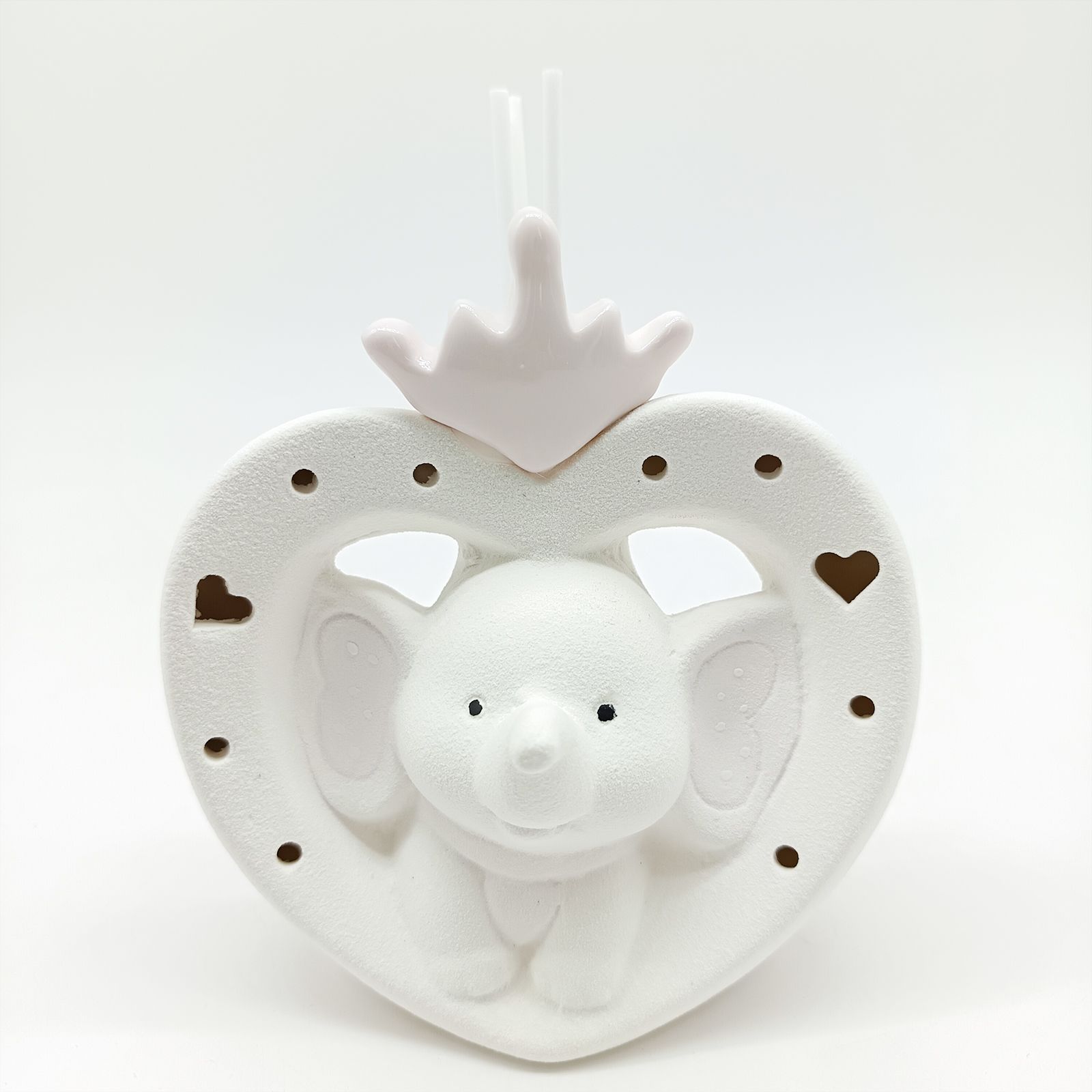 Raffinata lampada LED e profumatore ambiente in resina, dalle tonalità bianco e rosa, con un tenero elefantino affacciato a una finestra a forma di cuore. La luce esce da trafori a cuore e puntini, creando un effetto luminoso delicato. Completa di corona rosa sulla testa e misura circa 13x12 cm.