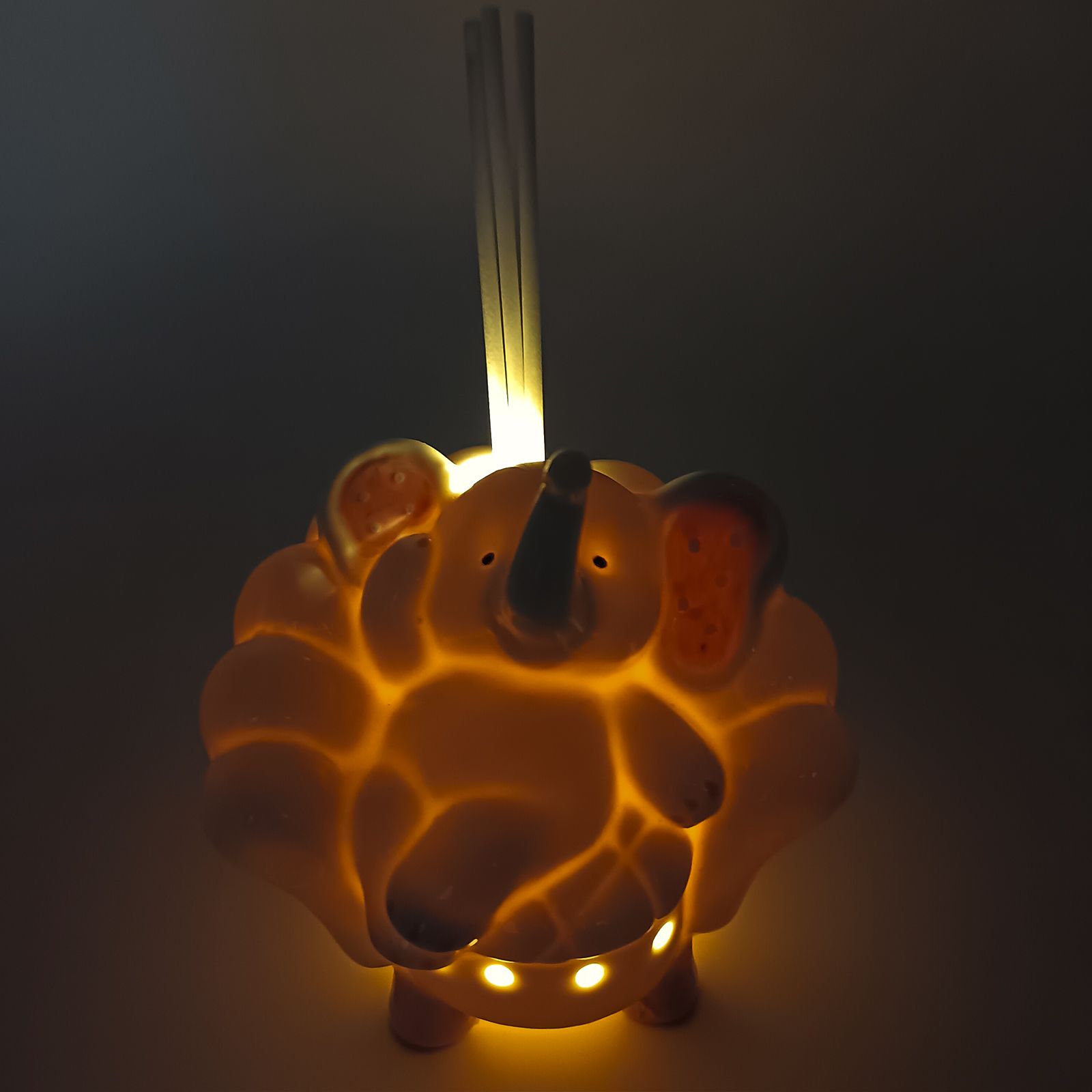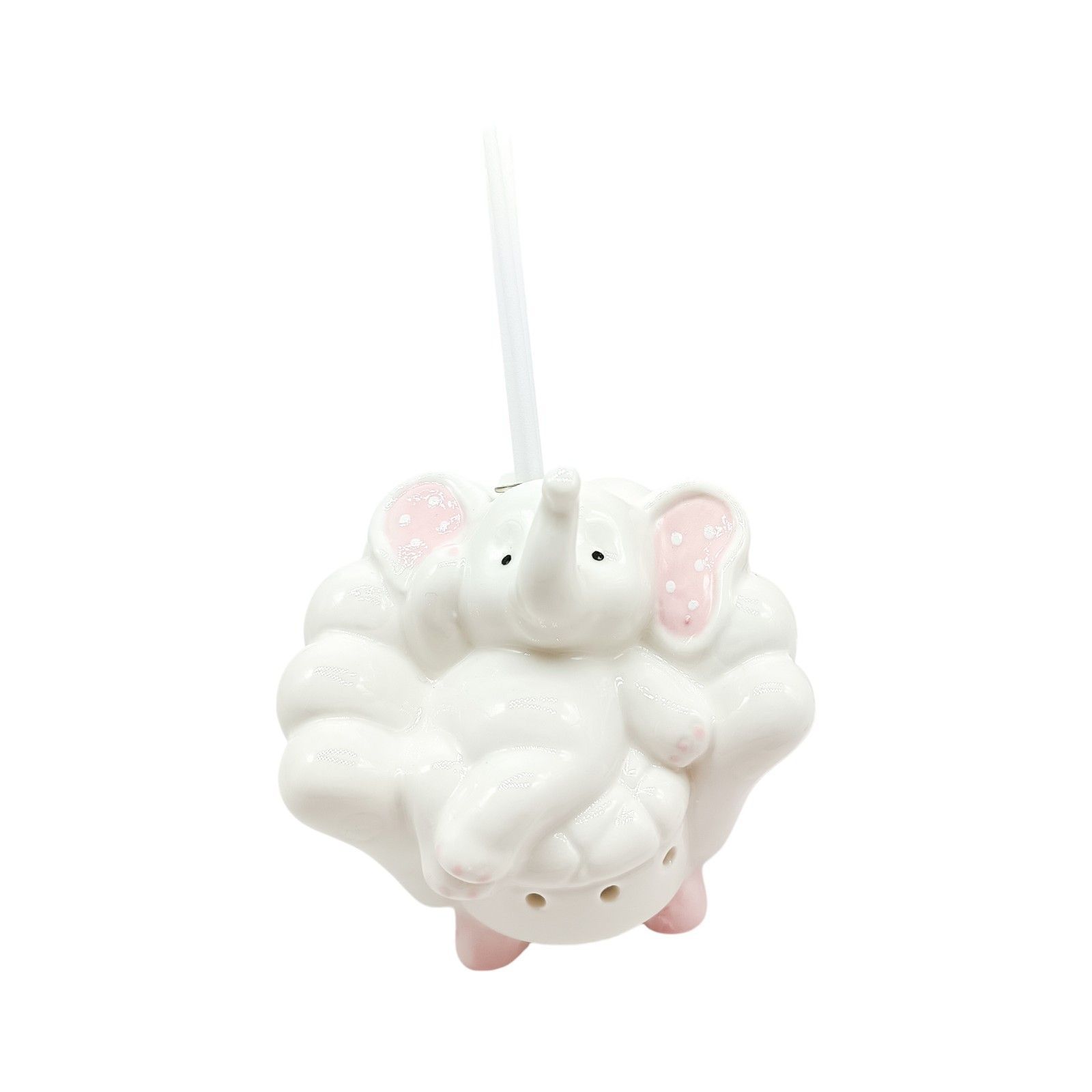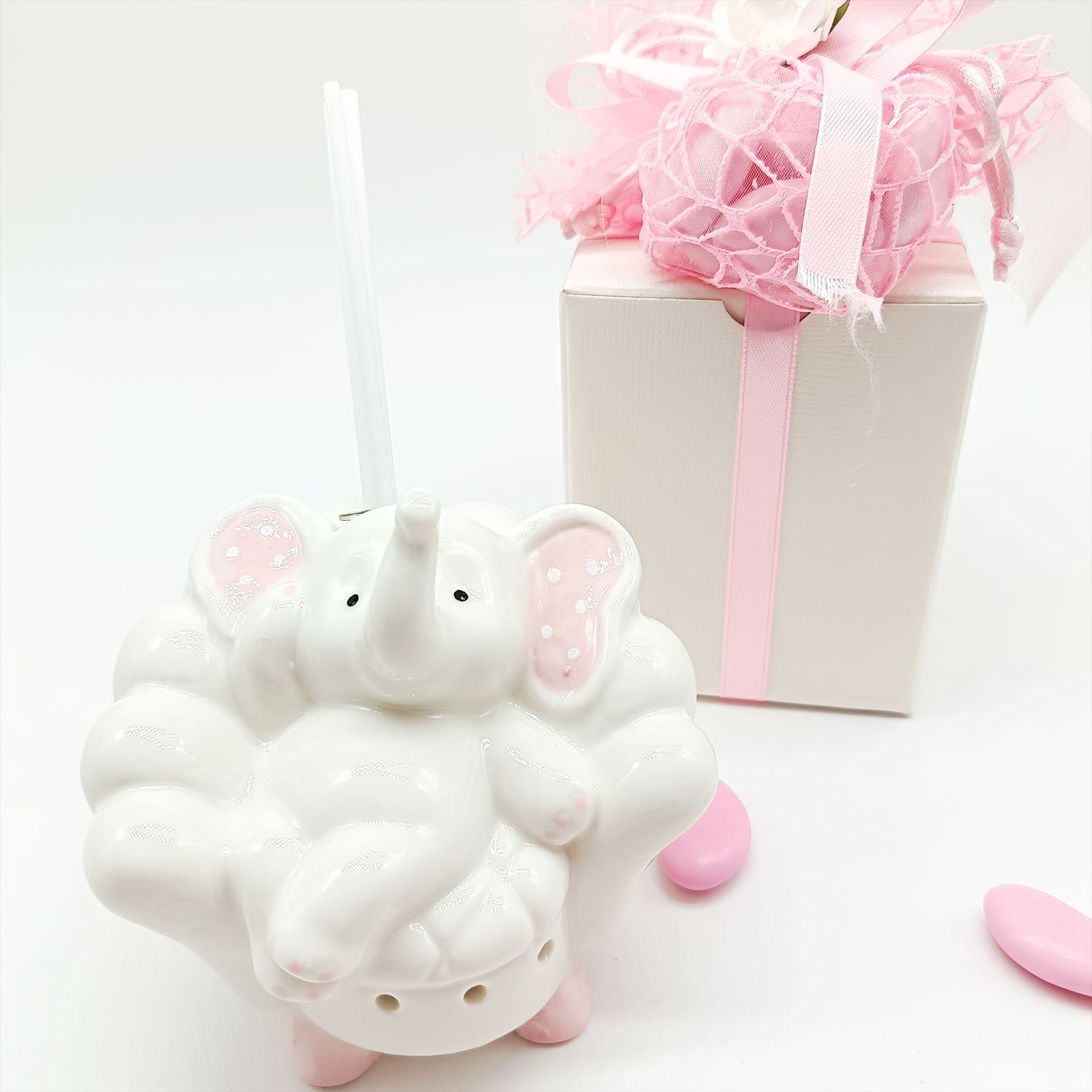 Un tocco di dolcezza per gli invitati al battesimo o al primo compleanno della tua bimba: un diffusore essenza con lampada LED, raffigurante un elefante seduto su poltrona con orecchie rosa a pois bianchi. Compatto (circa 9x9 cm) e perfetto come bomboniera battesimo bimba, è un dono elegante e originale.
