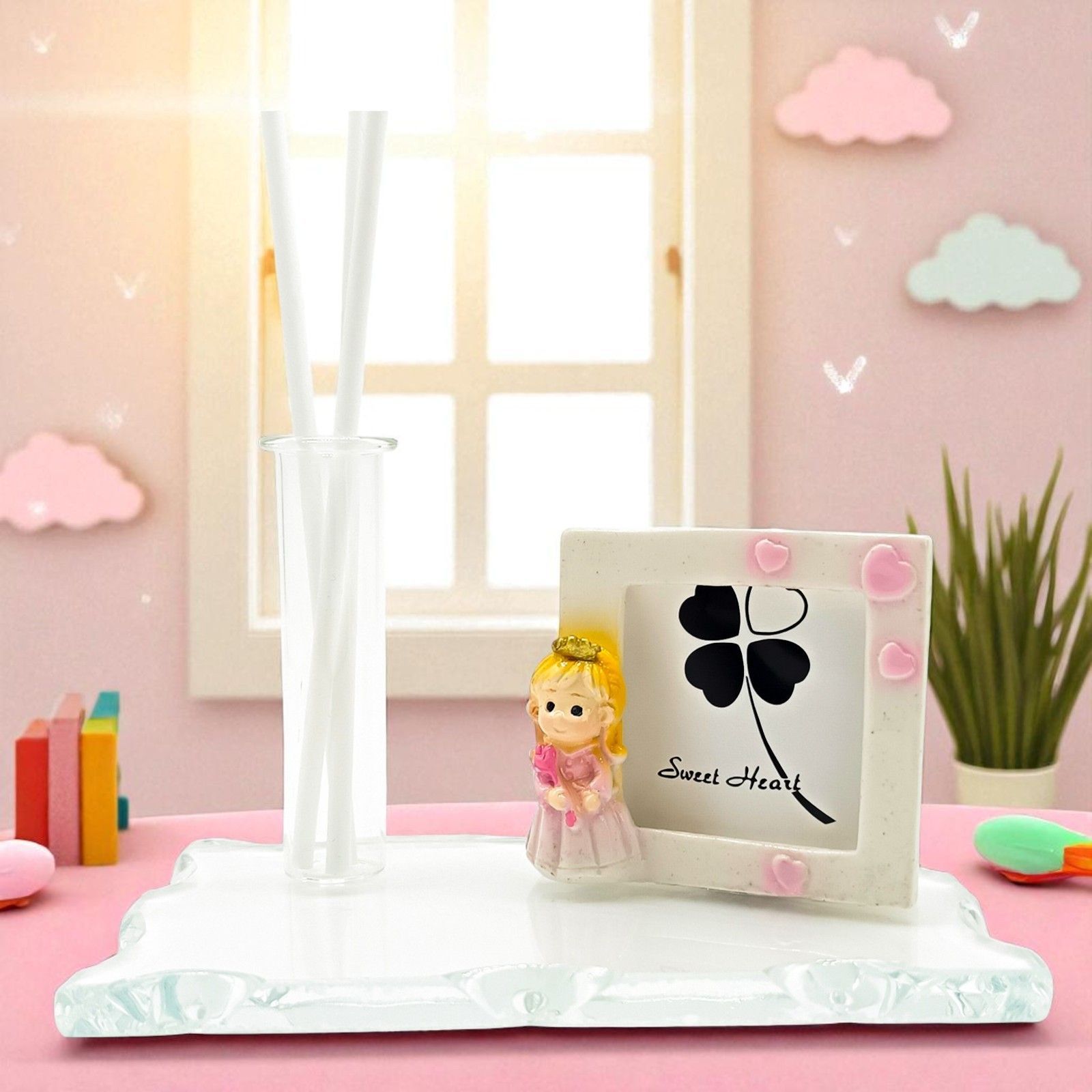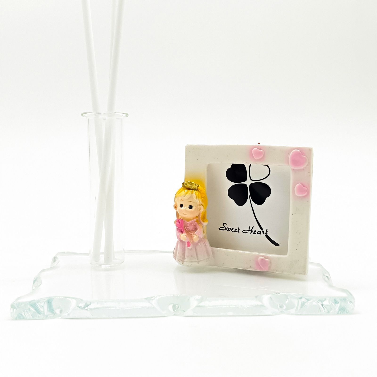Un’elegante bomboniera pensata per celebrare il battesimo della tua bimba, perfetta per chi ama il tema principessa. Questa raffinata base in vetro con cornice presenta una dolce statuina di principessa in resina, accompagnata da una fiala portaprofumo o vasetto monofiore, per un regalo originale e utile.