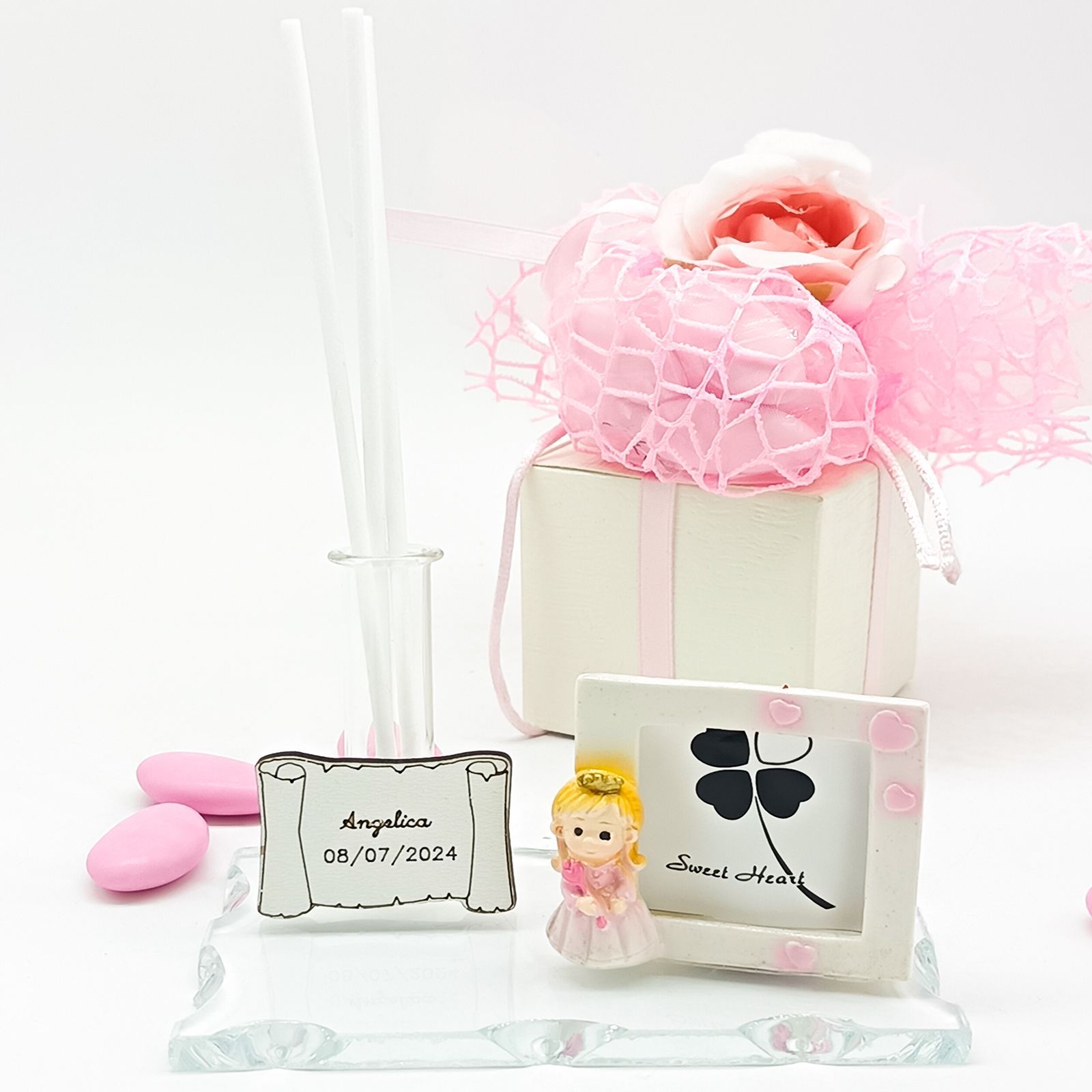Le dimensioni contenute (base 11x7 cm, fiala 6 cm circa, cornice 3,5x3 cm) e i dettagli rosa rendono questa bomboniera un vero gioiello da esporre.