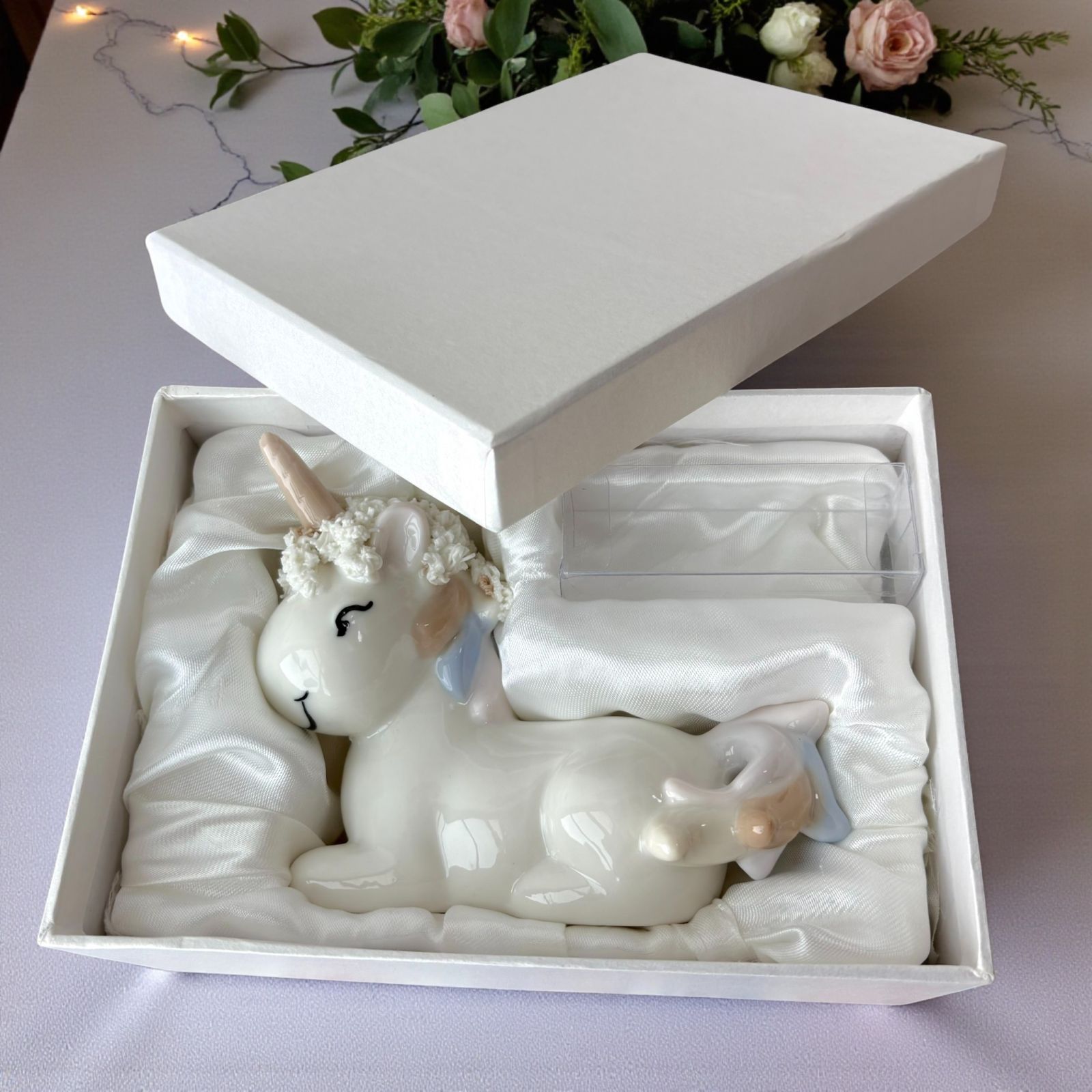 Rendi indimenticabile il battesimo del tuo piccolo con questa dolcissima bomboniera unicorno, simbolo di purezza, sogni e magia. Realizzata in ceramica lucida, questa raffinata statua unicorno incanta con i suoi dettagli nei toni rosa, celeste e tortora, perfetti sia per bomboniere maschietto che per bomboniere femminuccia. Un dono che racconta amore, fantasia e tenerezza in ogni suo dettaglio.