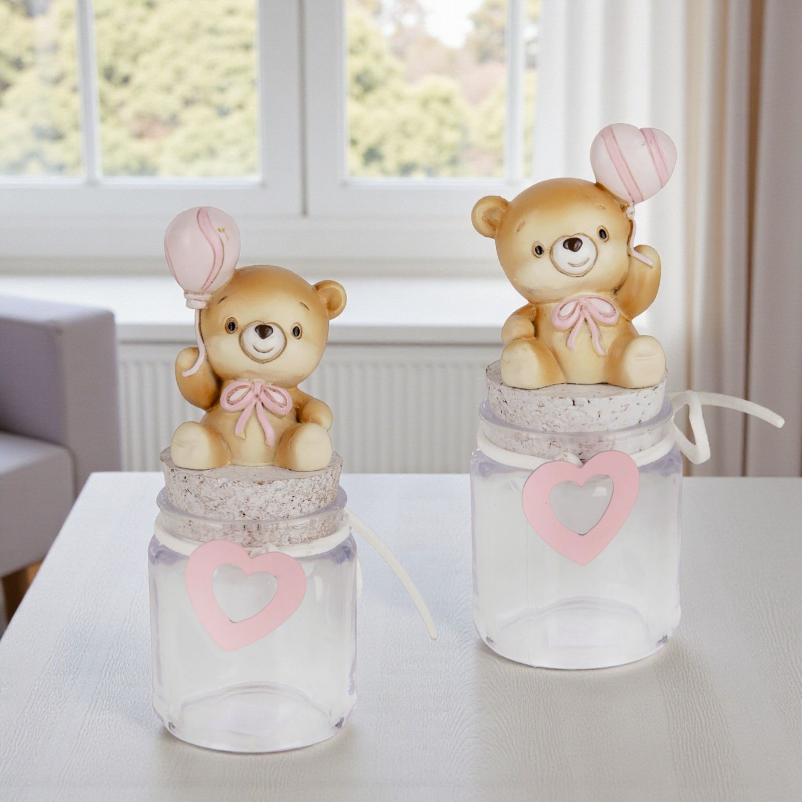 Rendi il tuo battesimo o il primo compleanno della tua piccola un momento indimenticabile con la nostra deliziosa bomboniera: un barattolo decorato con un adorabile orsetto che stringe tra le mani un palloncino a forma di cuore. Questa creazione unica non è solo un oggetto, ma un simbolo d'amore e di gioia, perfetto per celebrare eventi così speciali. Ogni dettaglio, dal cuoricino rosa al tappo in sughero, è pensato per trasmettere dolcezza e affetto.