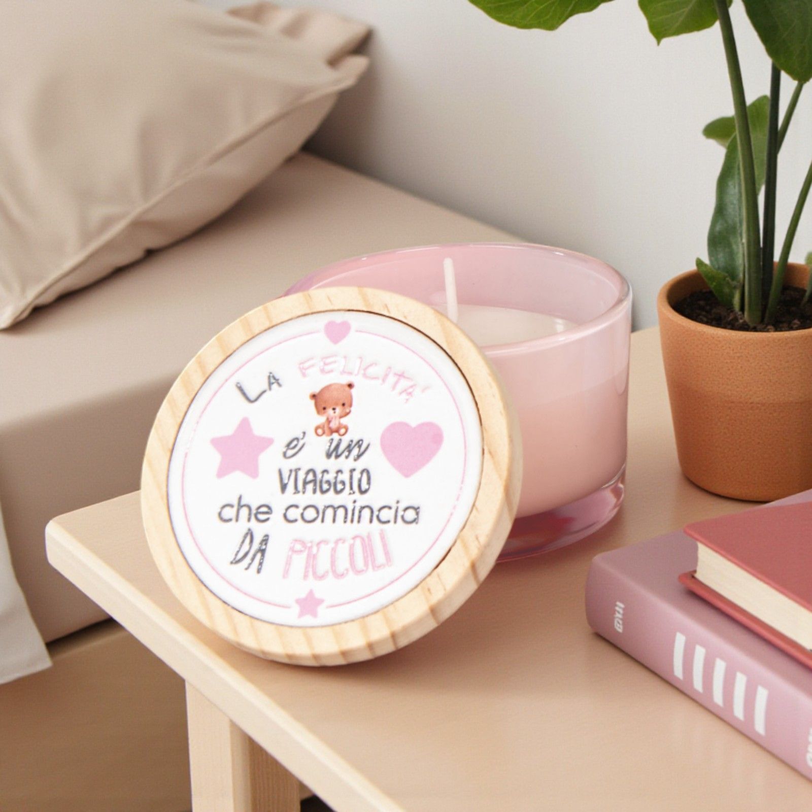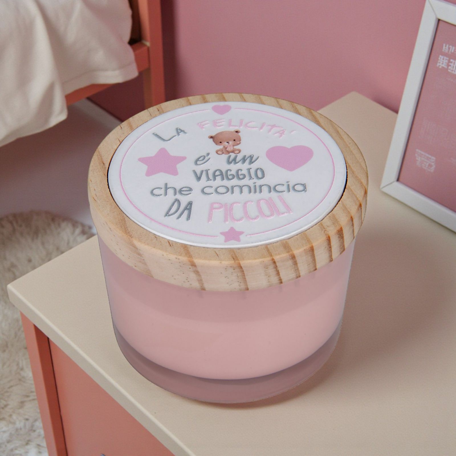 Regala un ricordo dolce e indimenticabile agli invitati con questo portacandela in vetro decorato con un tenero orsetto, cuoricini e stelline rosa e la frase "La felicità è un viaggio che comincia da piccoli". Perfetto come bomboniera per battesimo o primo compleanno, è un pensiero emozionante che trasmette gioia e affetto.