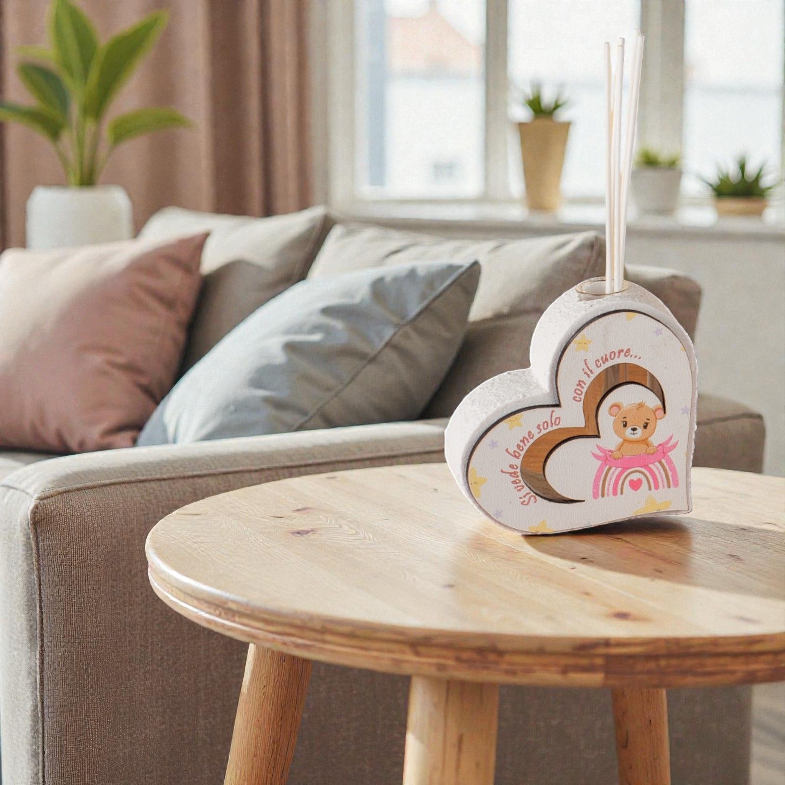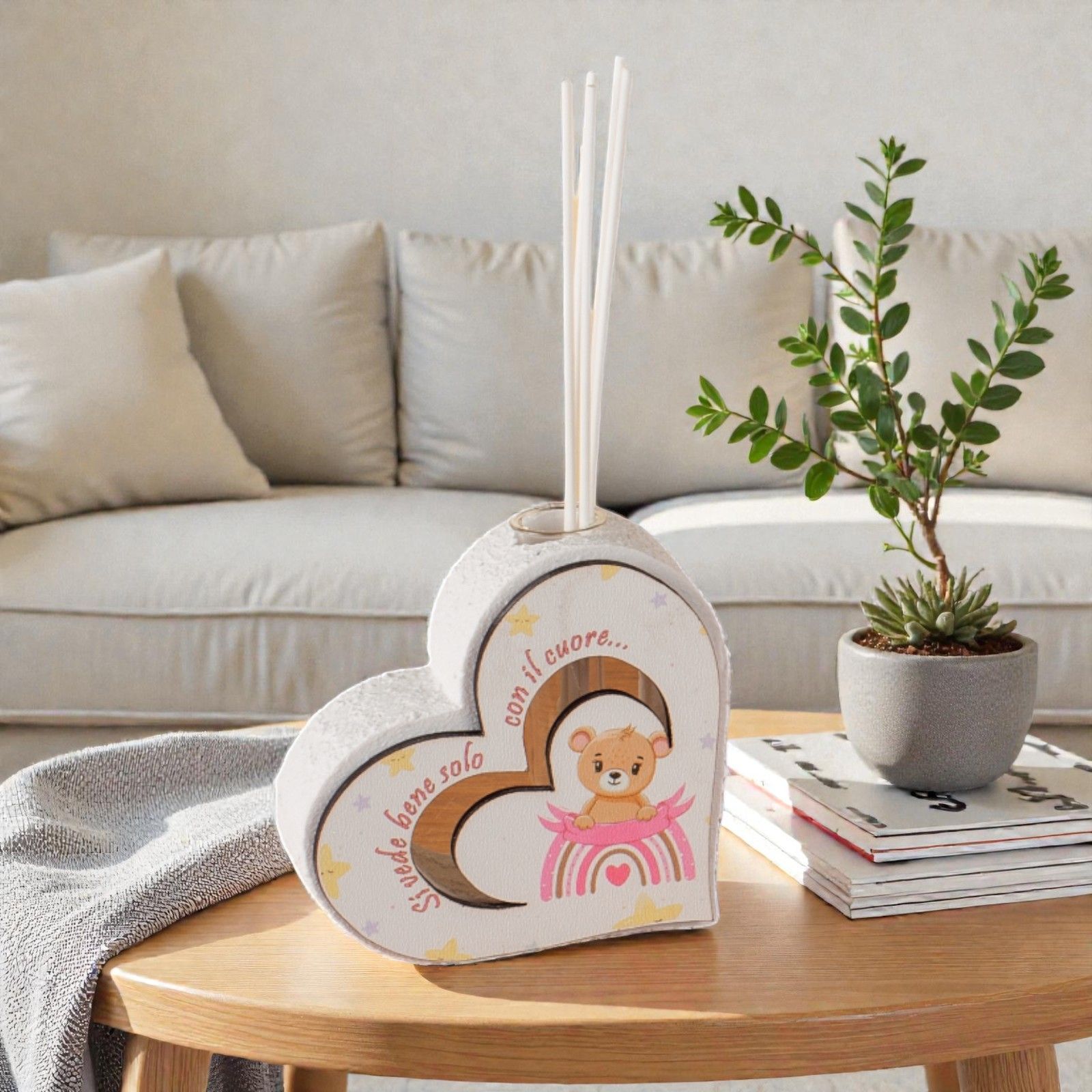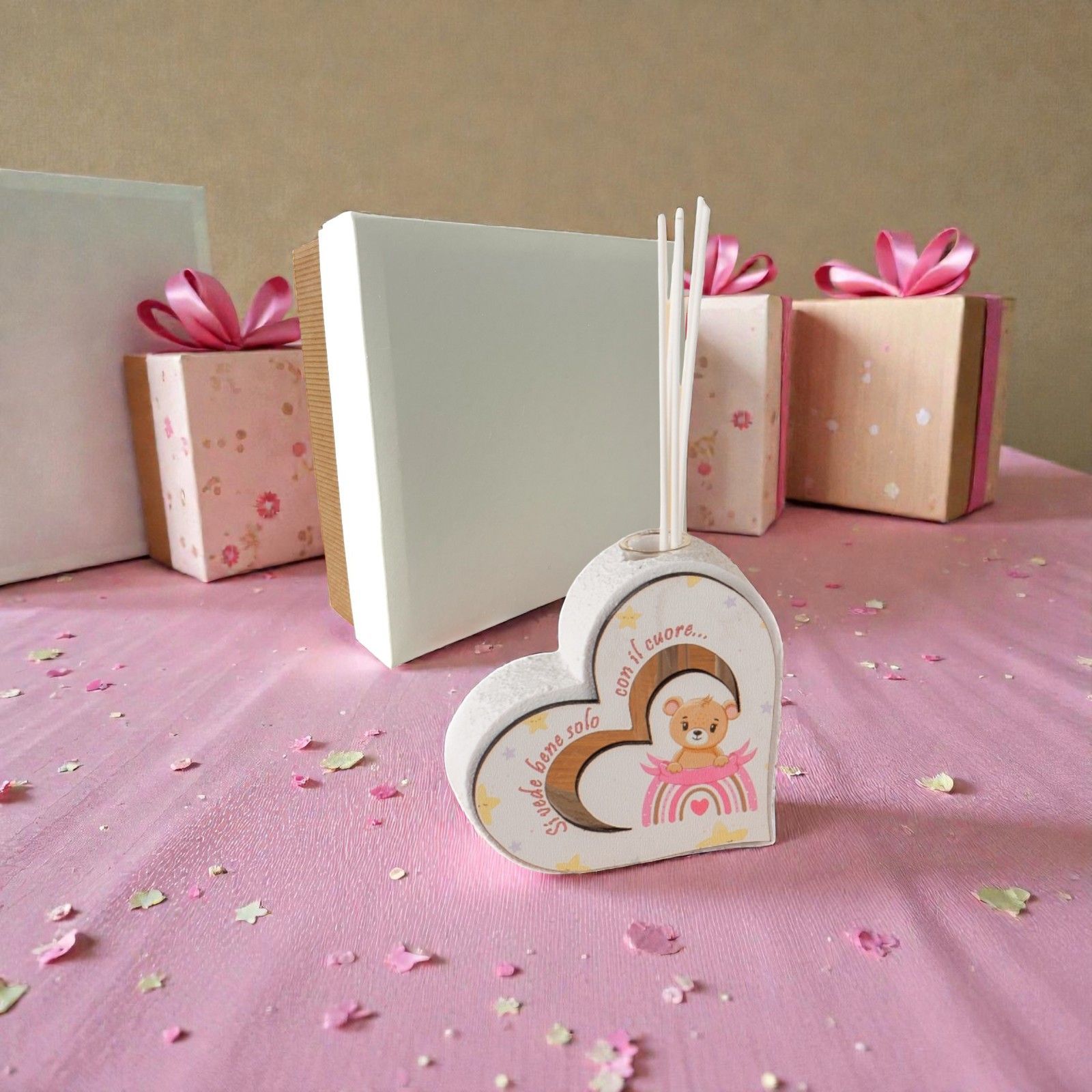 Realizzato in resina effetto pietra, il profumatore si distingue per la sua sagoma frontale in legno, decorata con un adorabile orsetto e un arcobaleno nei toni del rosa. La frase "Si vede bene solo con il cuore" invita a guardare oltre l'apparenza, rendendo ogni battesimo un momento da custodire nel cuore. Confezionato in una scatola regalo elegante e completo di essenza e bastoncini, è il dono ideale per lasciare un segno indelebile.