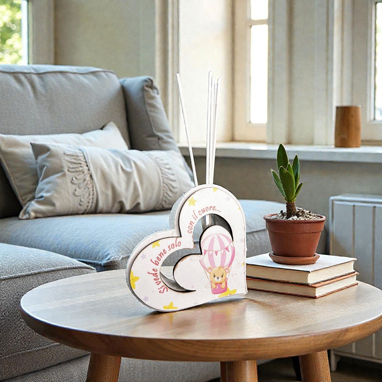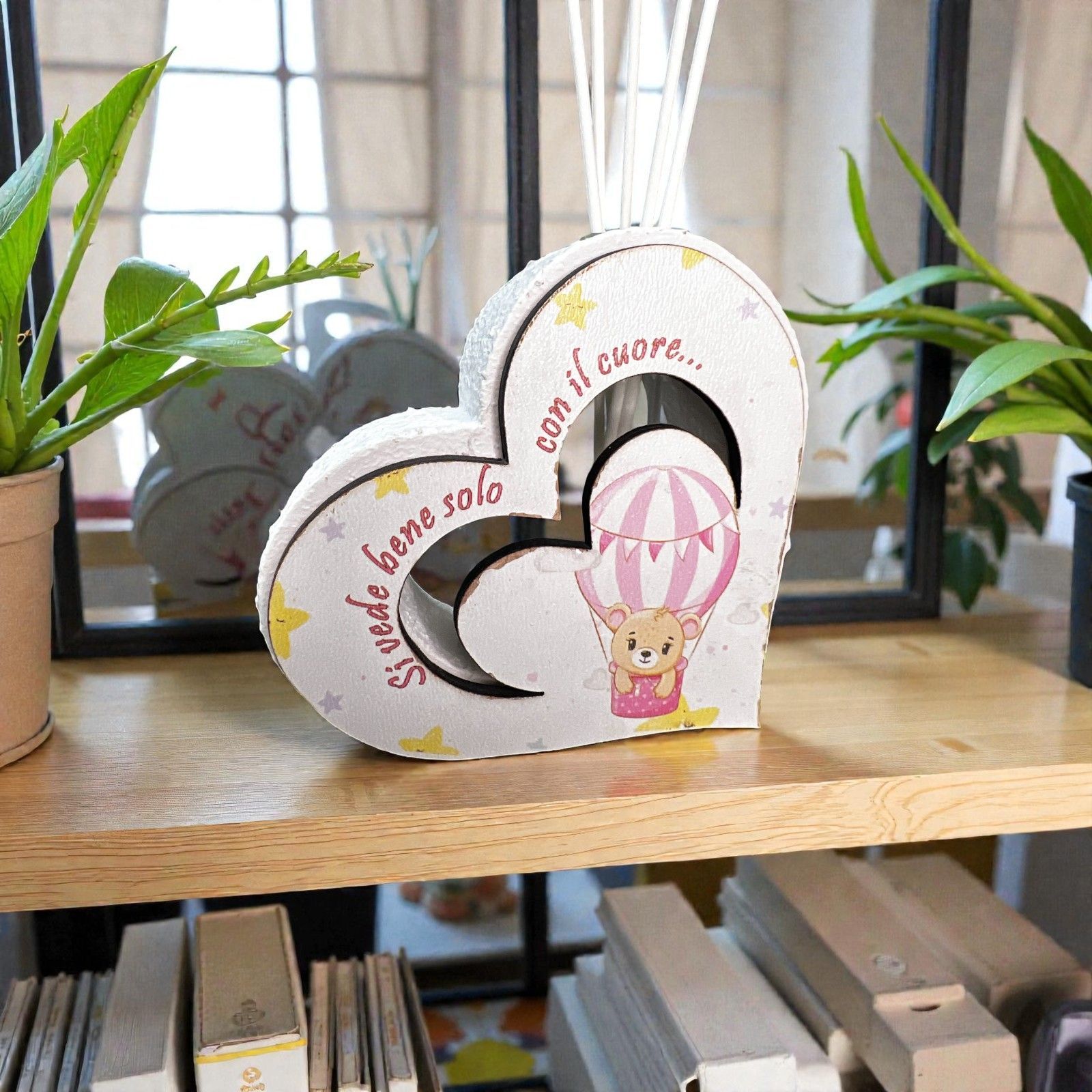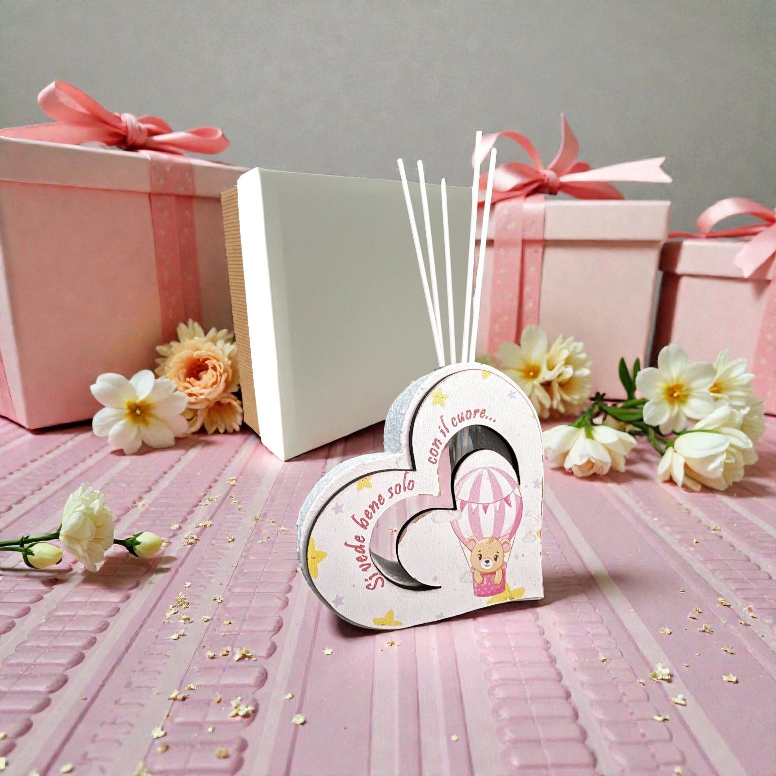 Realizzato in resina effetto pietra, questo elegante profumatore è caratterizzato da un'incantevole sagoma in legno con un orsetto in mongolfiera, dipinta con delicate tonalità di bianco e rosa. La frase "Si vede bene solo con il cuore" incarna il messaggio di amore e connessione, rendendo questo oggetto una meravigliosa bomboniera battesimo, perfetta per festeggiare la tua femminuccia.