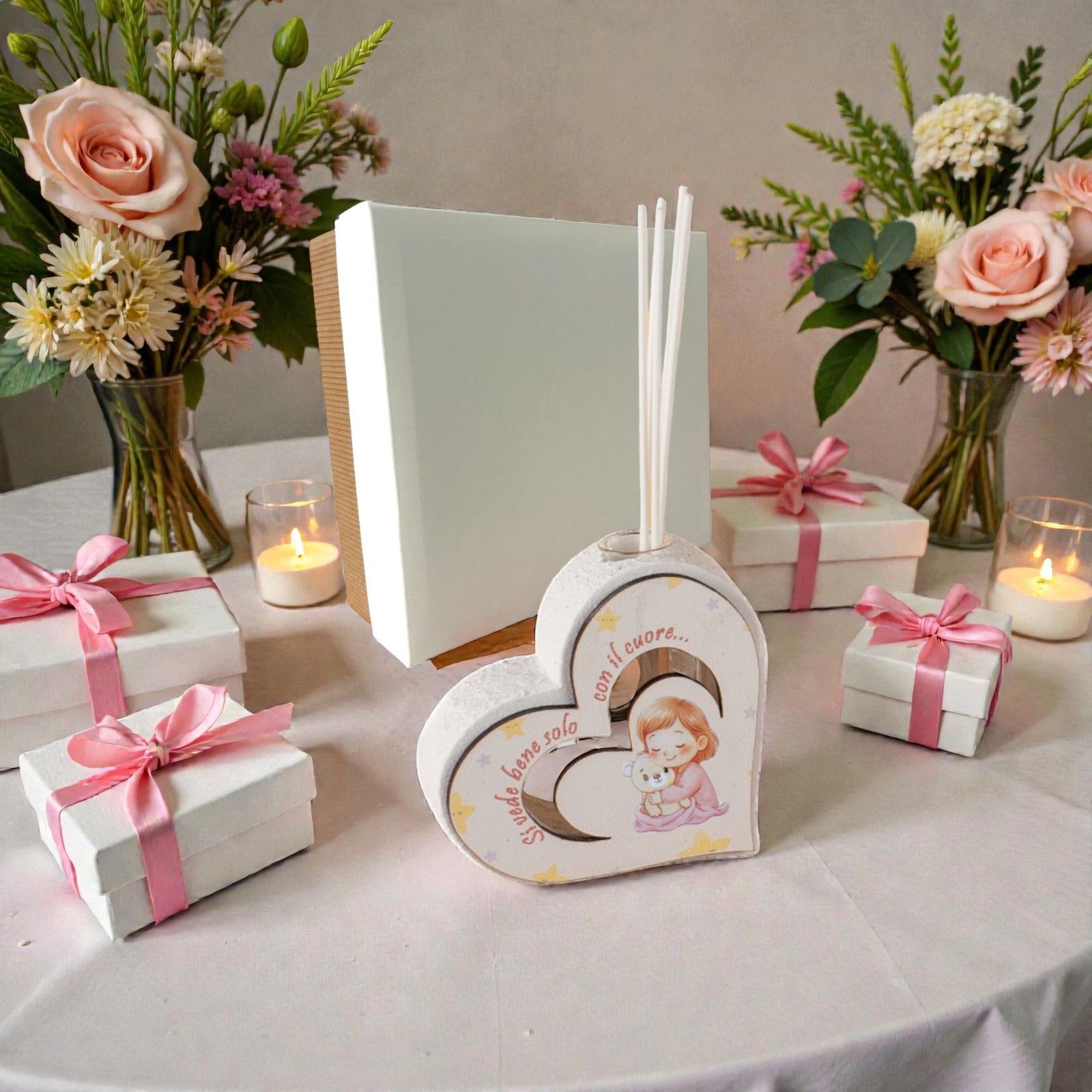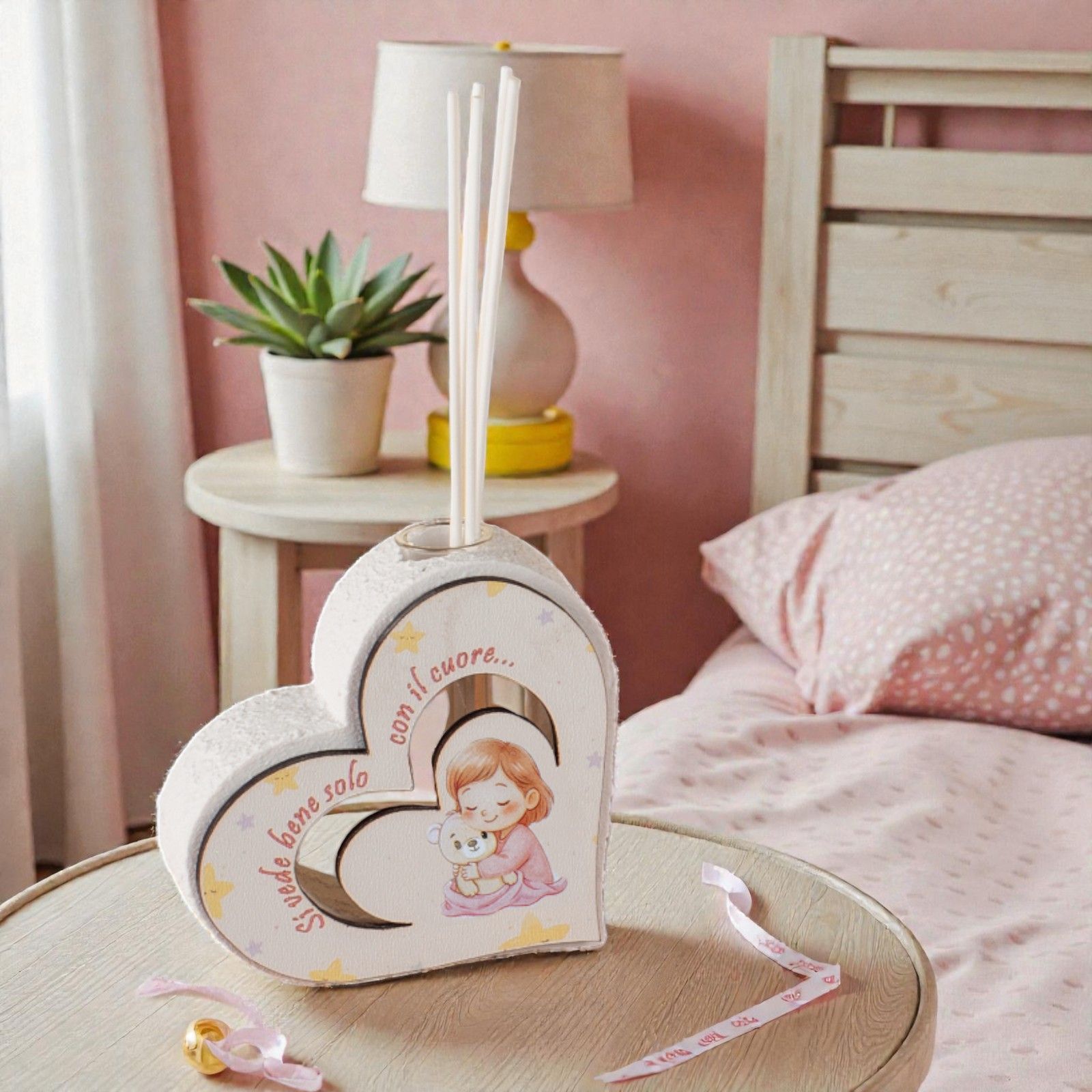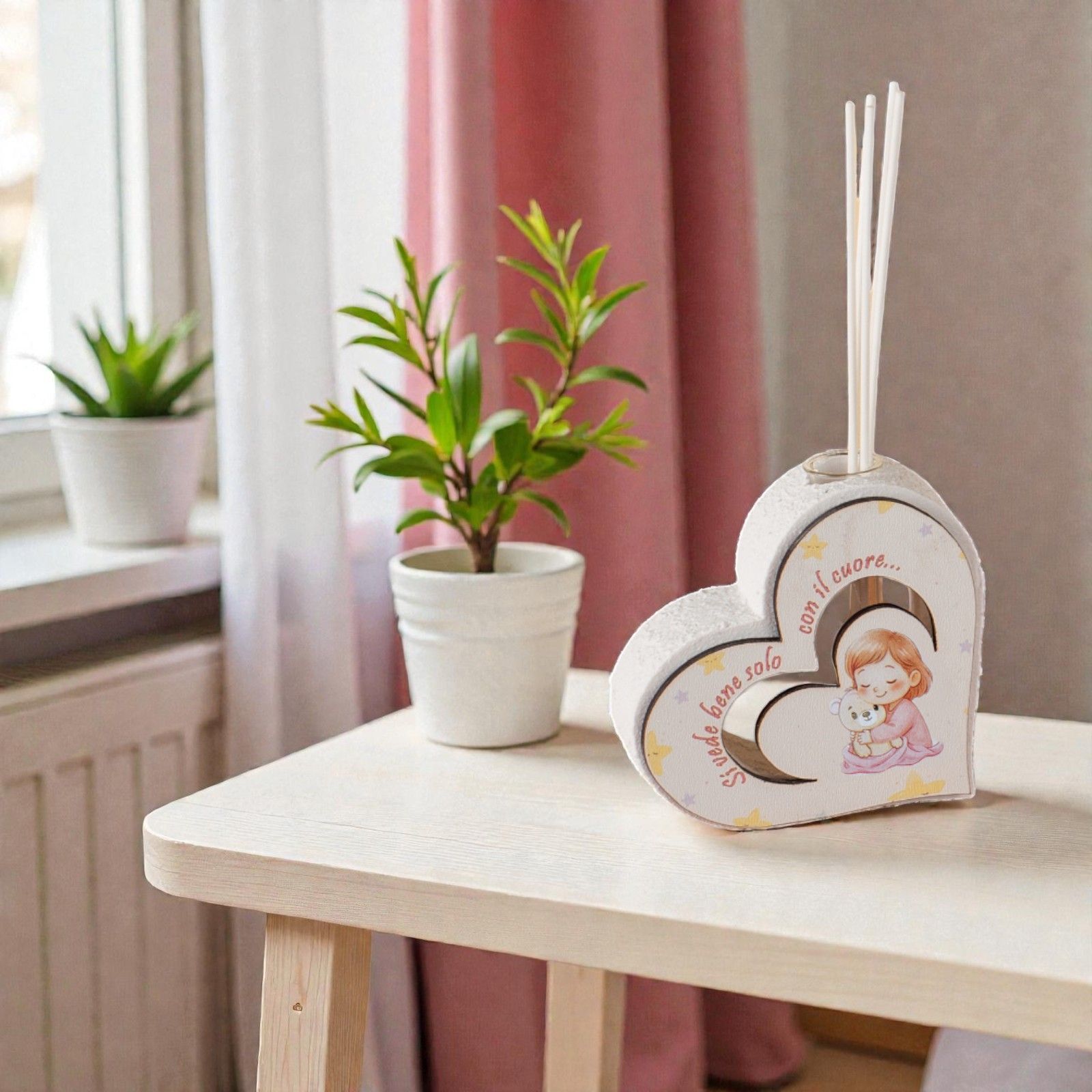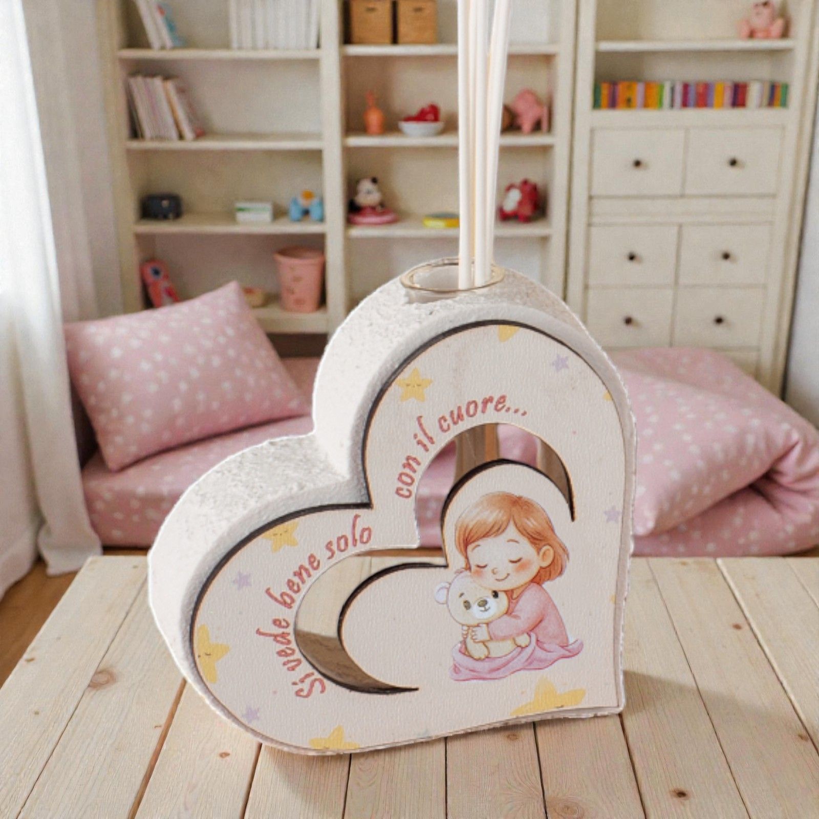 Realizzato in un delicato abbinamento di bianco e rosa, il nostro profumatore è impreziosito da una sagoma in legno che rappresenta una tenera bambina con il suo orsetto. La frase incisa "Si vede bene solo con il cuore" aggiunge un tocco poetico, trasmettendo messaggi di dolcezza e speranza. Ogni singolo pezzo è curato nei minimi dettagli, per un regalo che parla direttamente al cuore.