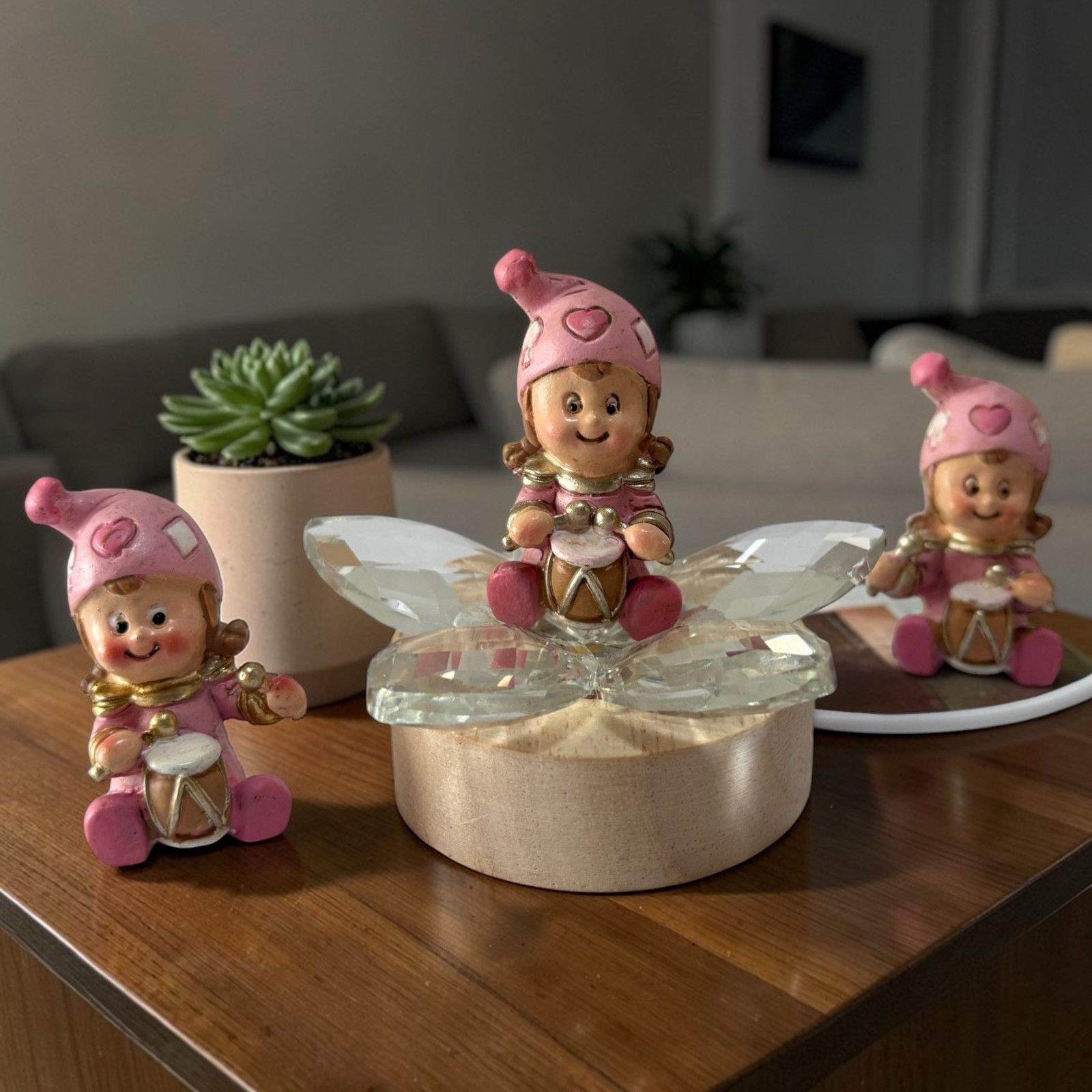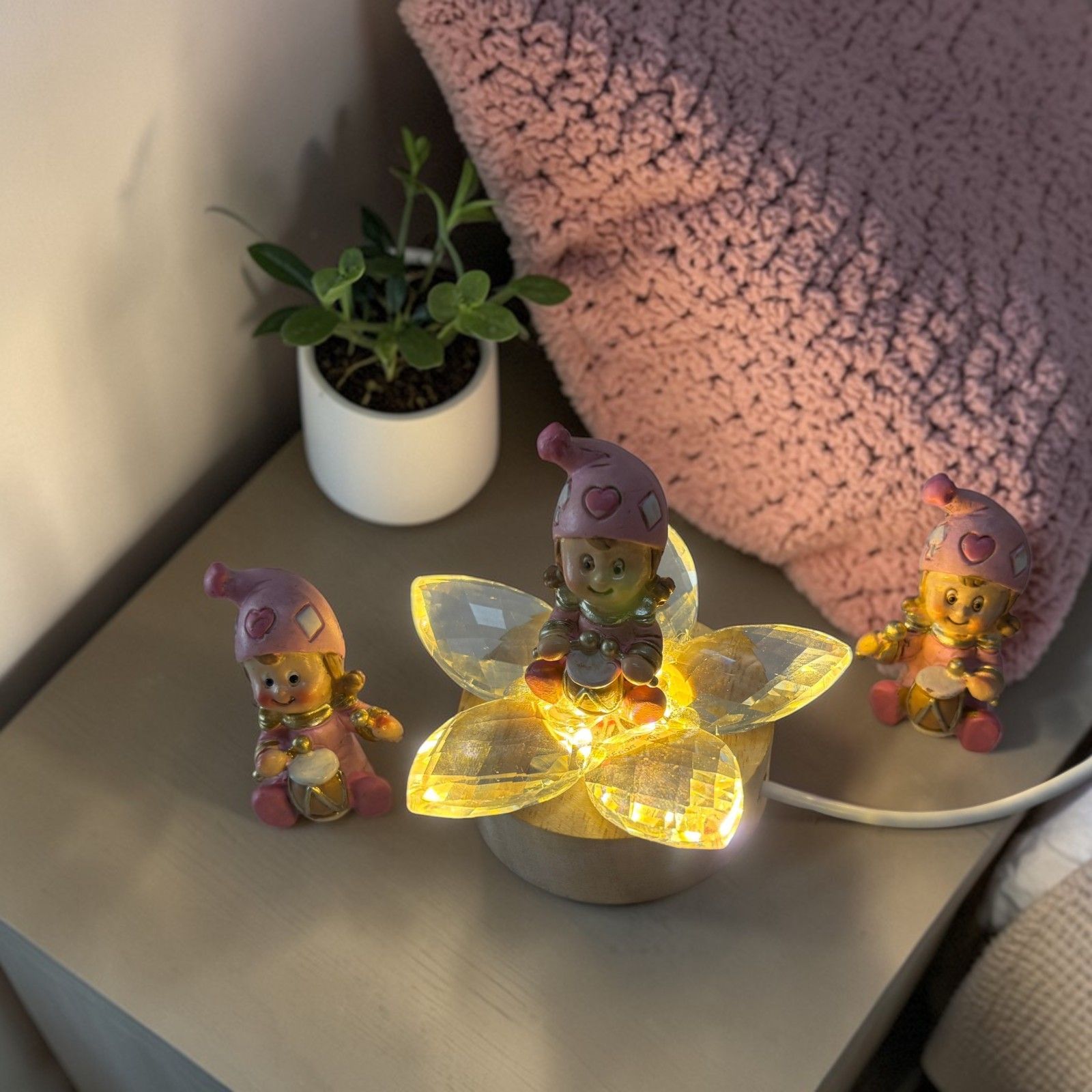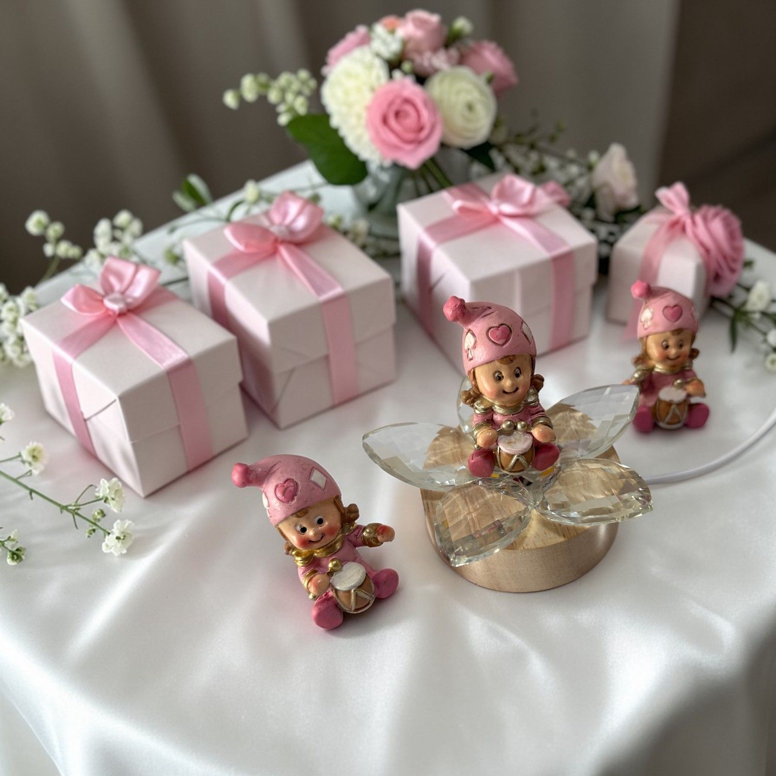 Deliziosa e gioiosa, questa base led con fiore in cristallo è perfetta tra le bomboniere battesimo bimba. Il fiore in cristallo, illuminato dal led, esalta i petali creando un effetto brillante, mentre la statuina jon bimba jolly con tamburro, con dettagli rosa e assortita in tre modelli, aggiunge un tocco di allegria e dolcezza alla composizione.
