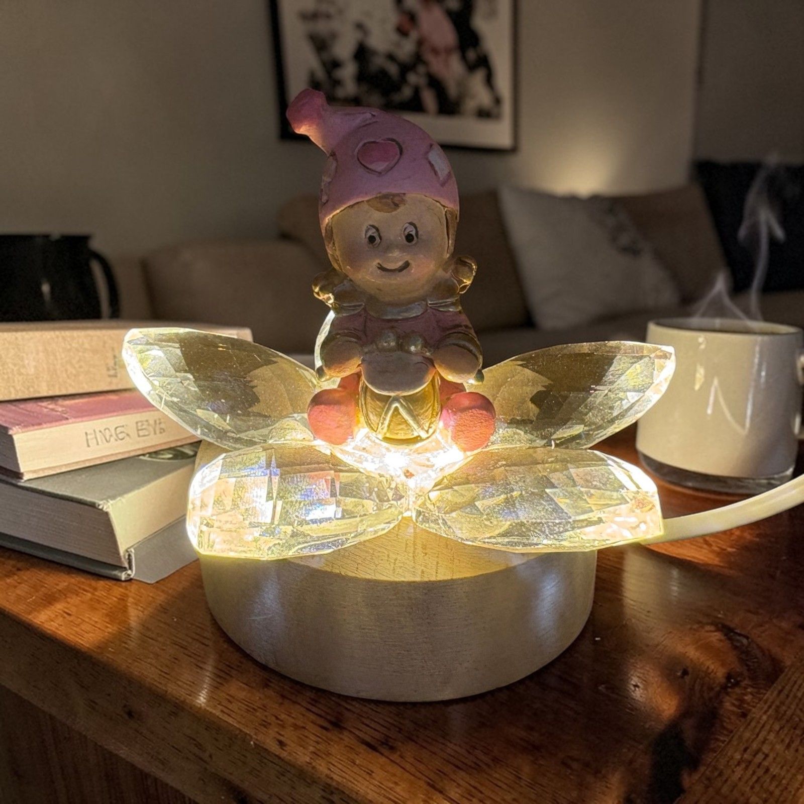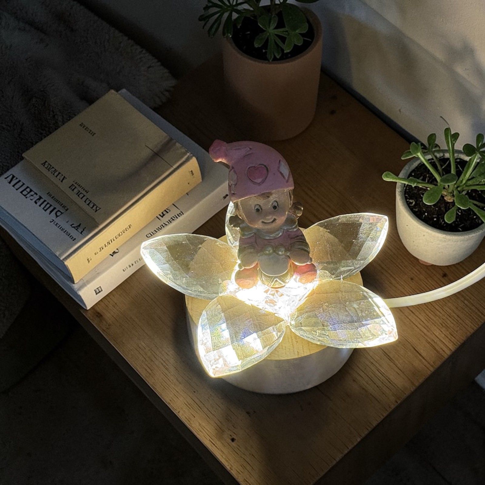 Dimensione: base led circa 6 cm; fiore circa 8x8 cm; statuina circa 5 cm.