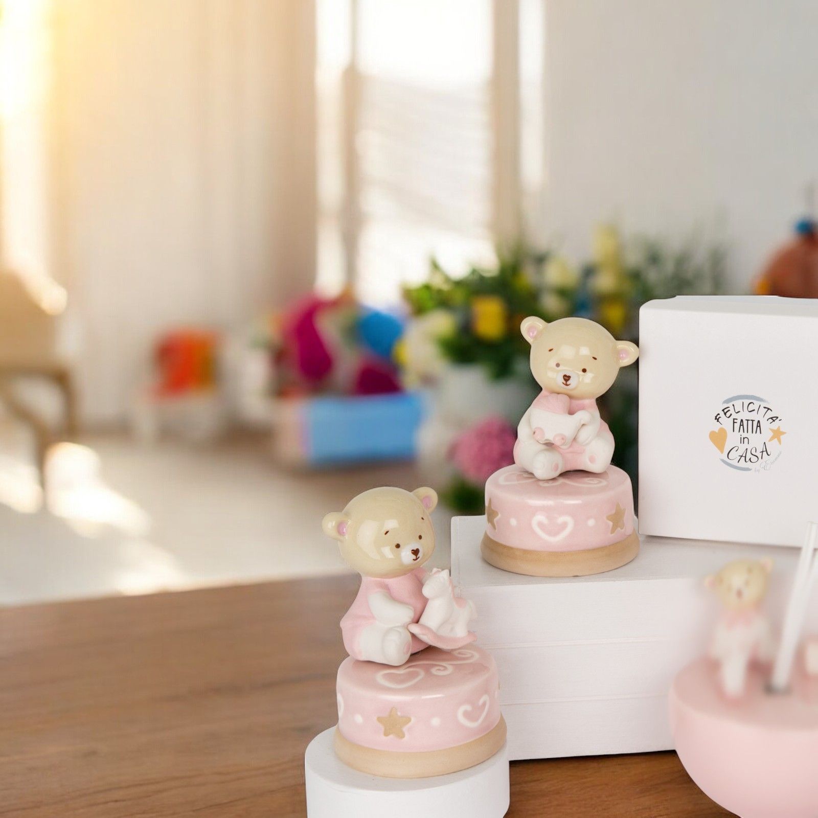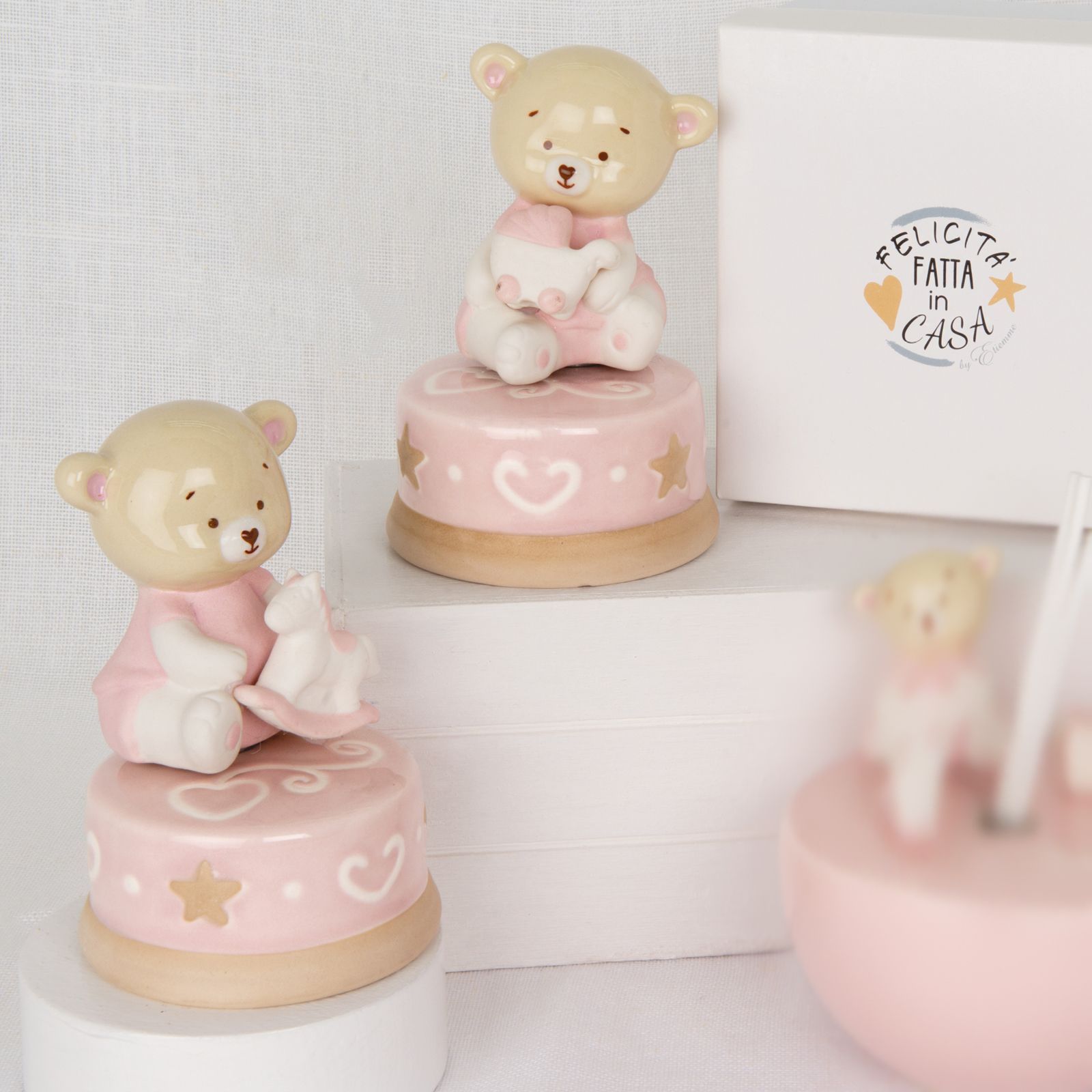 Questa bomboniera è il regalo perfetto per festeggiare il battesimo di una femminuccia. Il carillon con tenero orsetto, assortito in due varianti con carrozzina o con cavalluccio tra le mani, è un'idea originale e completa per ringraziare i padrini e le madrine che hanno accompagnato la piccola nel giorno del battesimo.