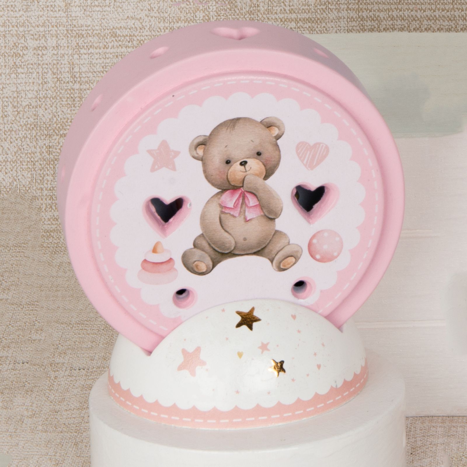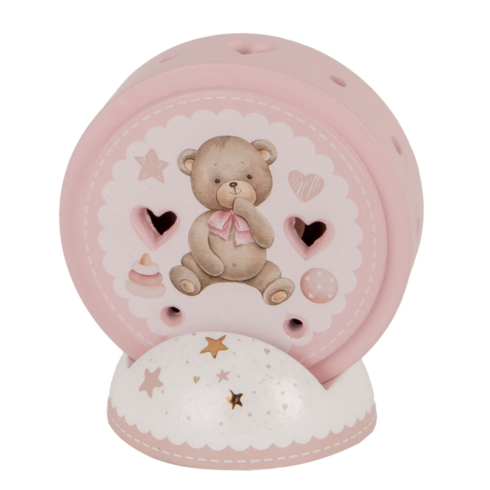 Questa lampada LED a forma di cerchio con trafori e orsetto centrale con fiocco rosa è un'idea originale e deliziosa per bomboniere da regalare ai tuoi invitati in occasione di battesimi e compleanni. Realizzata in terracotta, misura circa 11 cm di altezza e si presenta in un elegante colore bianco e rosa. La base è decorata con stelline, che conferiscono un tocco di tenerezza e dolcezza al regalo.