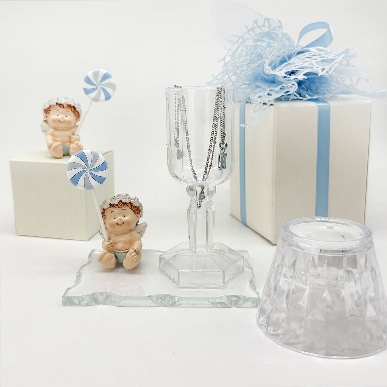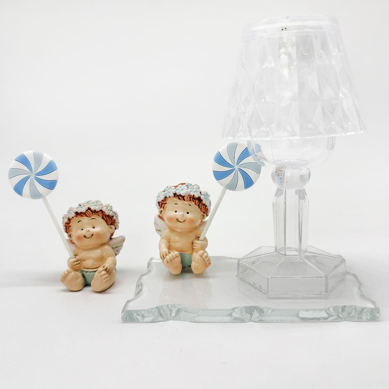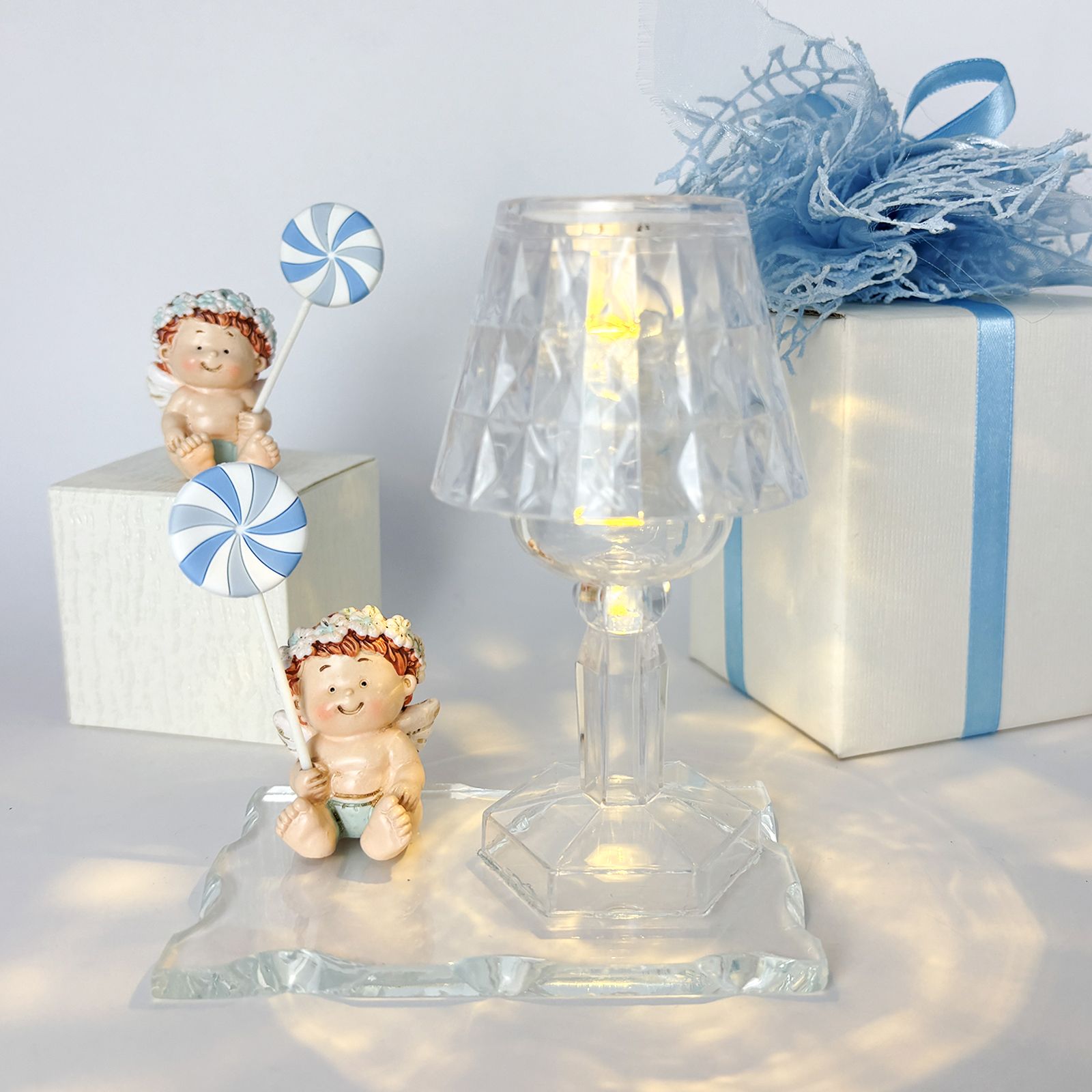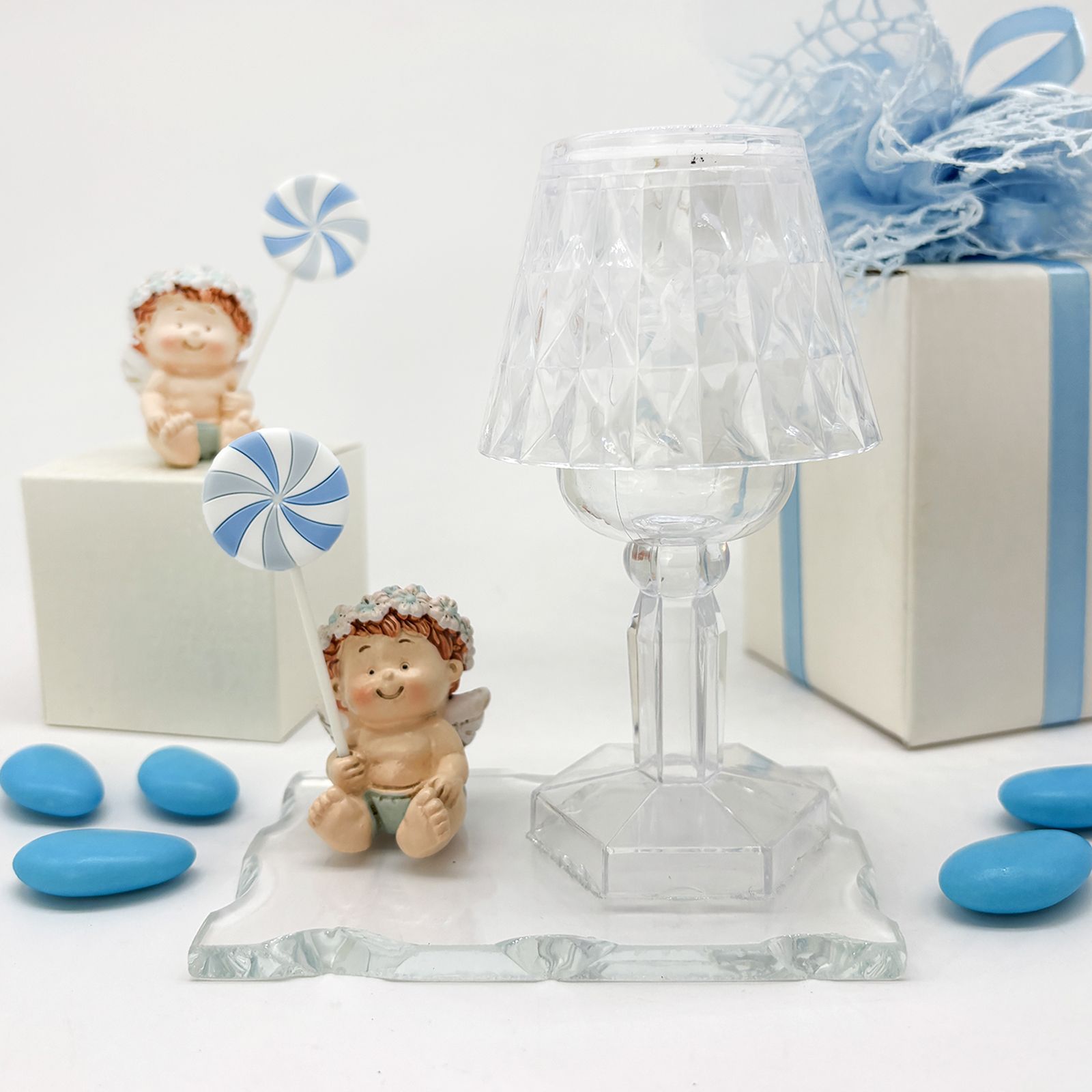 Un dolce pensiero per celebrare un momento unico e speciale. Questo elegante oggetto è composto da una base in vetro, un raffinato lumetto LED in plexiglass e una statuina in resina raffigurante un angioletto seduto con coroncina di fiori e lecca-lecca tra le mani, con dettagli azzurri. Perfetta per chi desidera bomboniere battesimo dallo stile particolare e raffinato, questa creazione è un segno di luce e protezione per chi la riceve.
