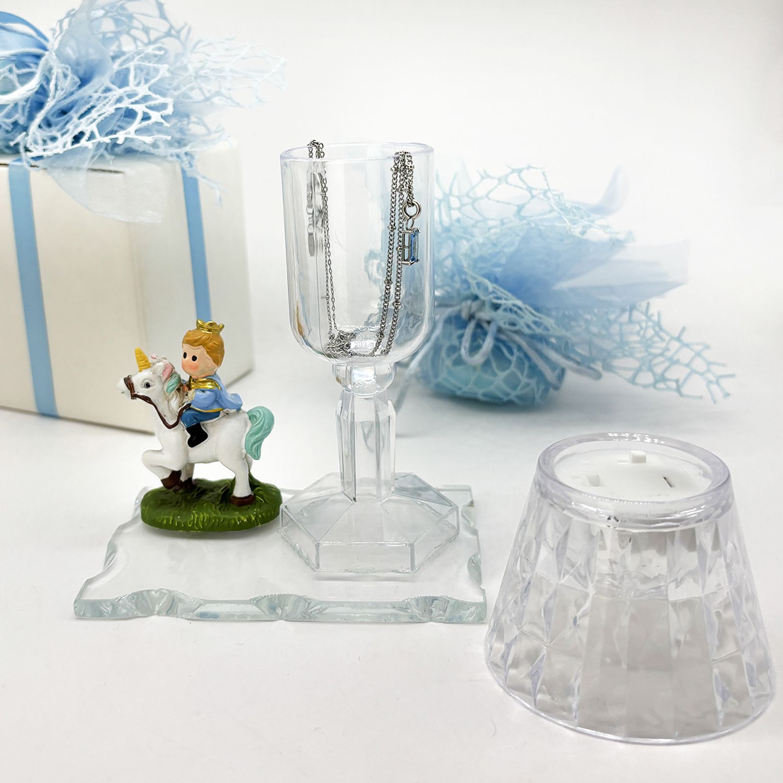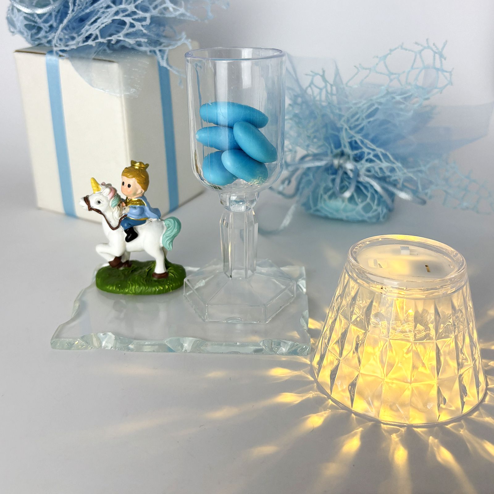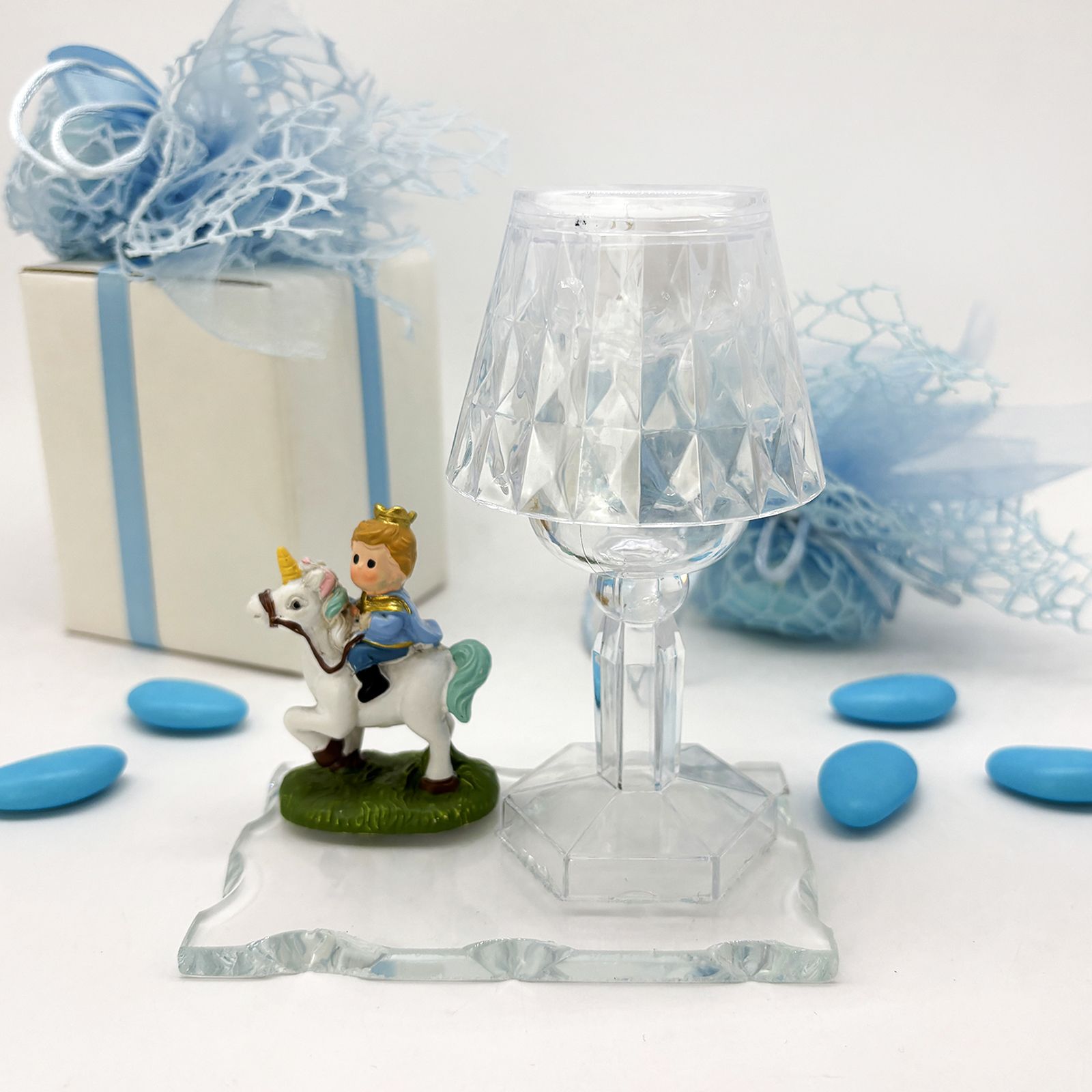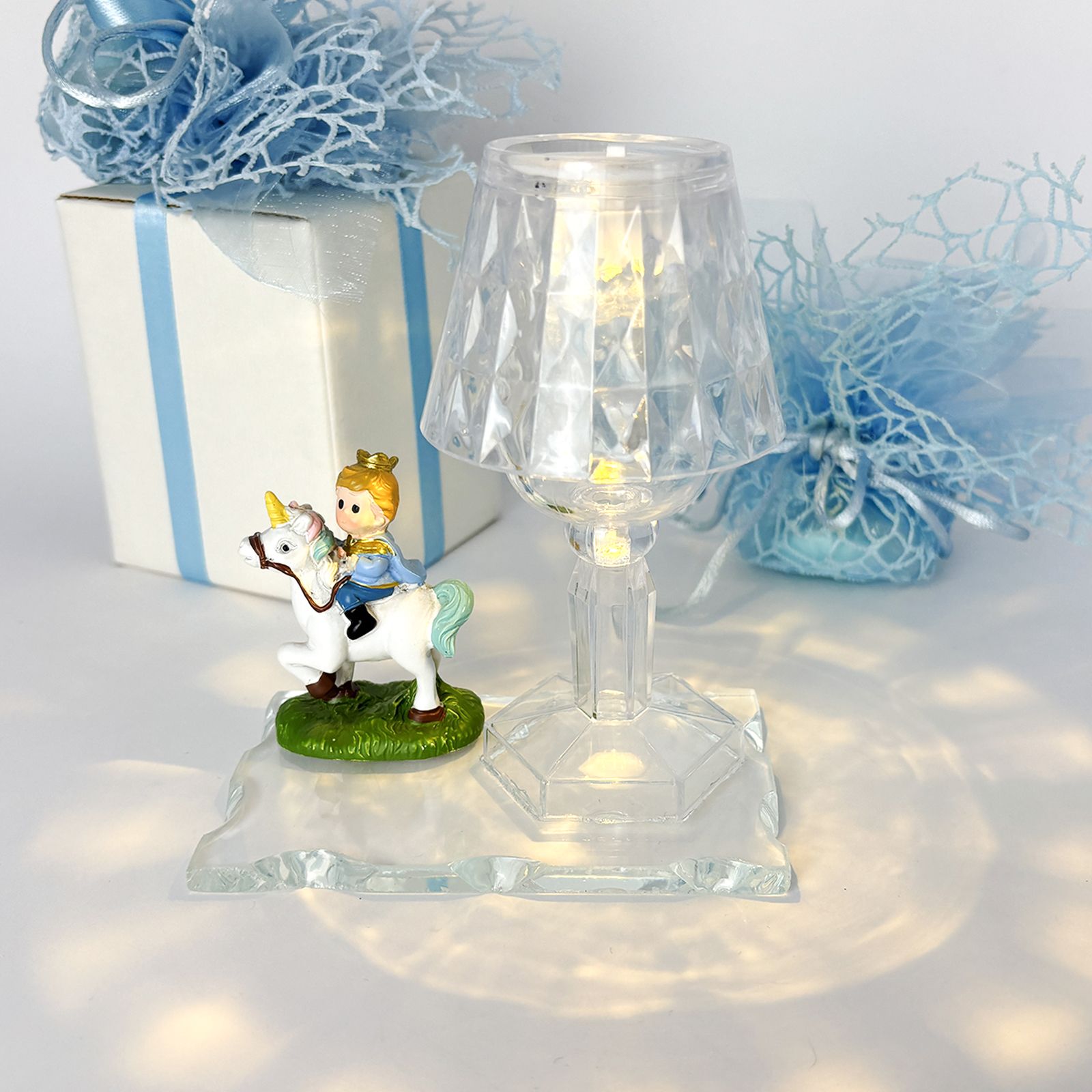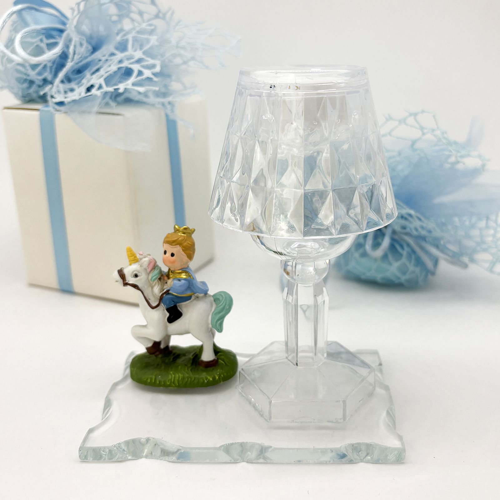 Un’elegante creazione perfetta per rendere ancora più speciale una cerimonia importante. Questo magnifico lumetto in plexiglass con base in vetro è arricchito da una statuina in resina che raffigura un tenero piccolo principe in sella a un cavallo bianco. Ideale per chi cerca bomboniere comunione o bomboniere battesimo bimbo dal design particolare e suggestivo, questa bomboniera è un simbolo di purezza e dolcezza.