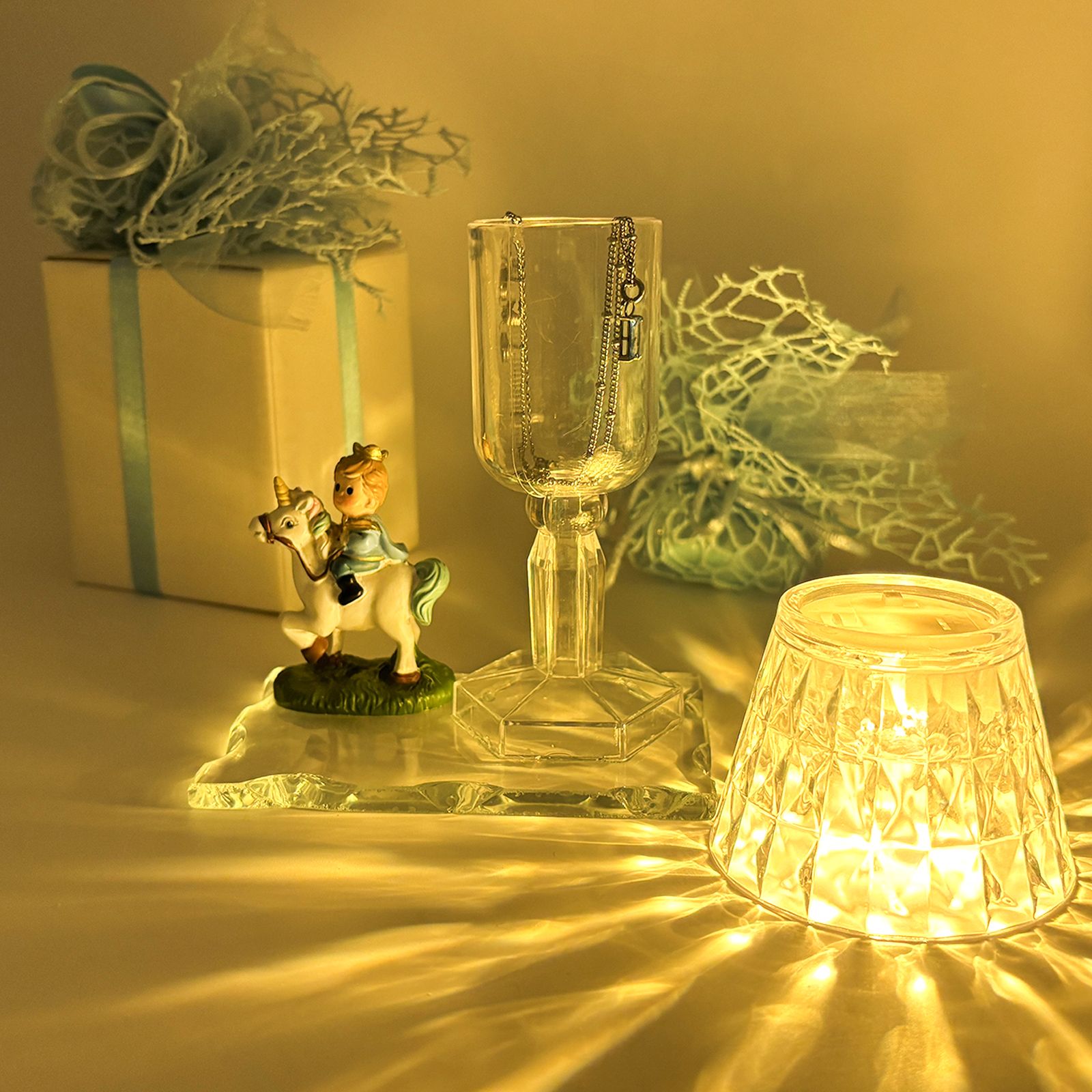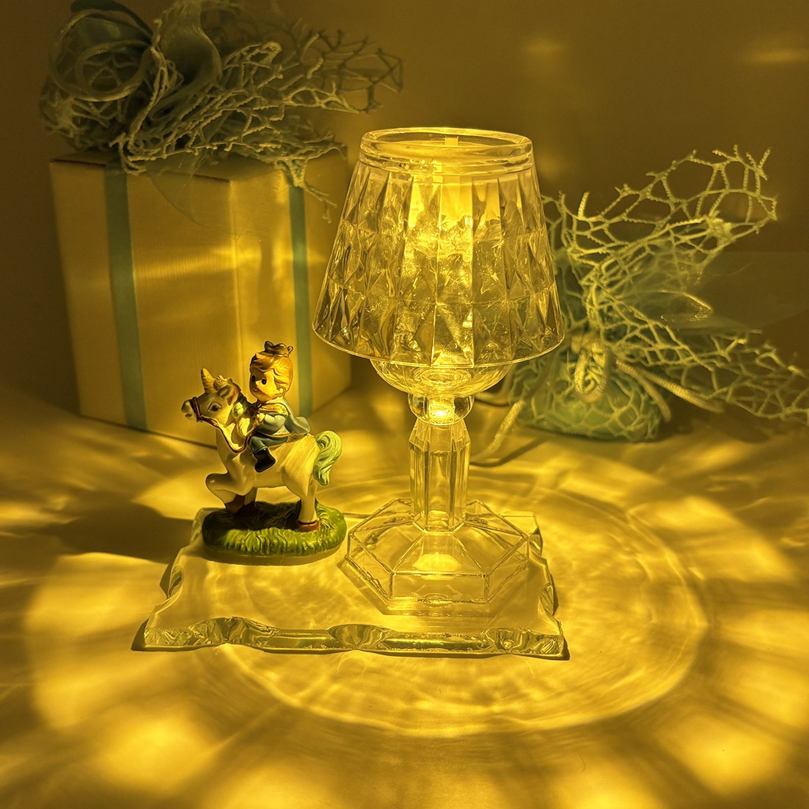 Oltre alla sua bellezza estetica, questo raffinato oggetto si presta anche a un uso pratico: può essere impiegato come lampada notturna per diffondere una luce calda e accogliente oppure come portagioie. Le sue dimensioni contenute lo rendono perfetto per qualsiasi ambiente: la base misura 11x7 cm, il lumetto 6,5x6,5x11,5 cm e la statuina è alta circa 6 cm e larga 5 cm. I materiali pregiati, tra cui vetro, resina e plexiglass, ne garantiscono eleganza e resistenza nel tempo.