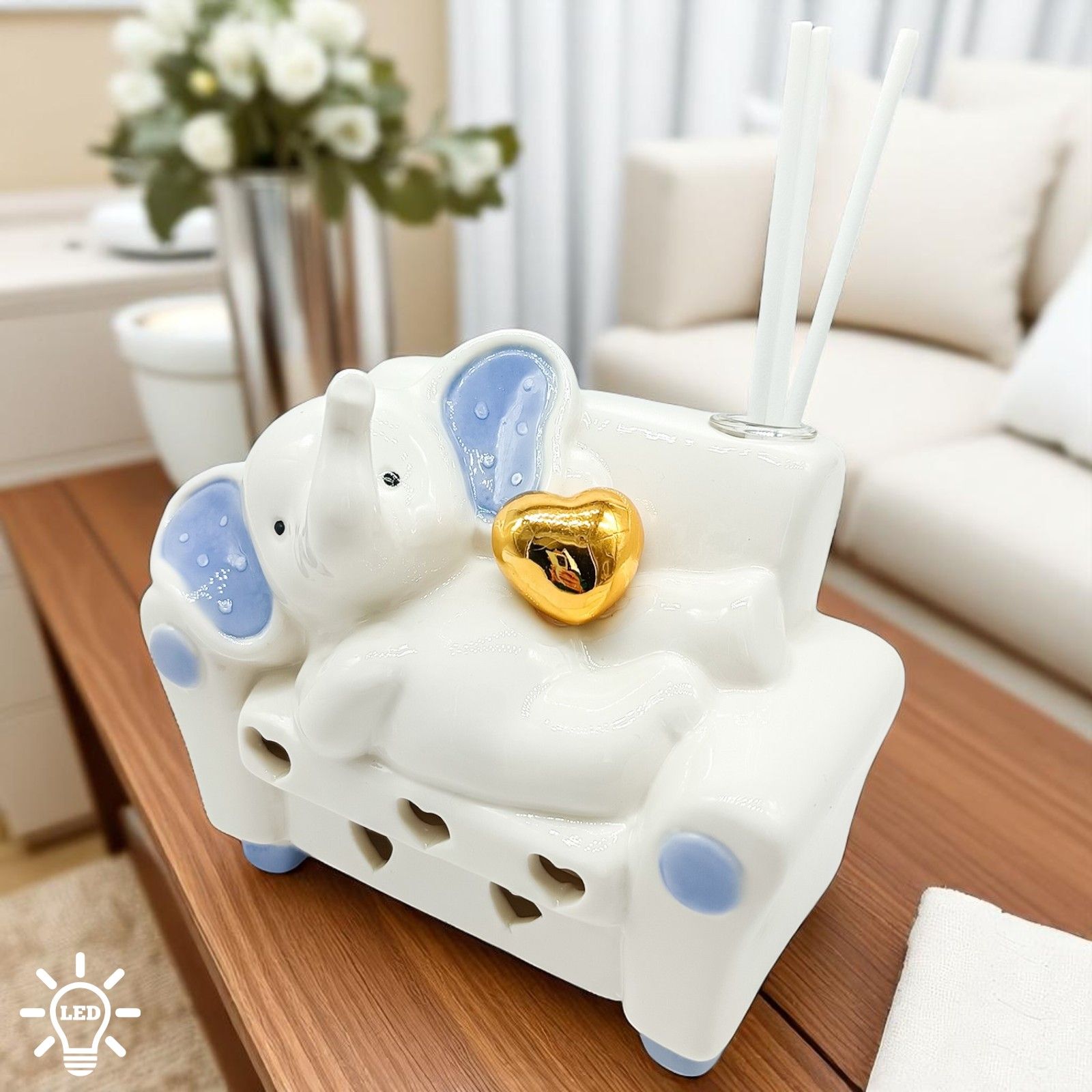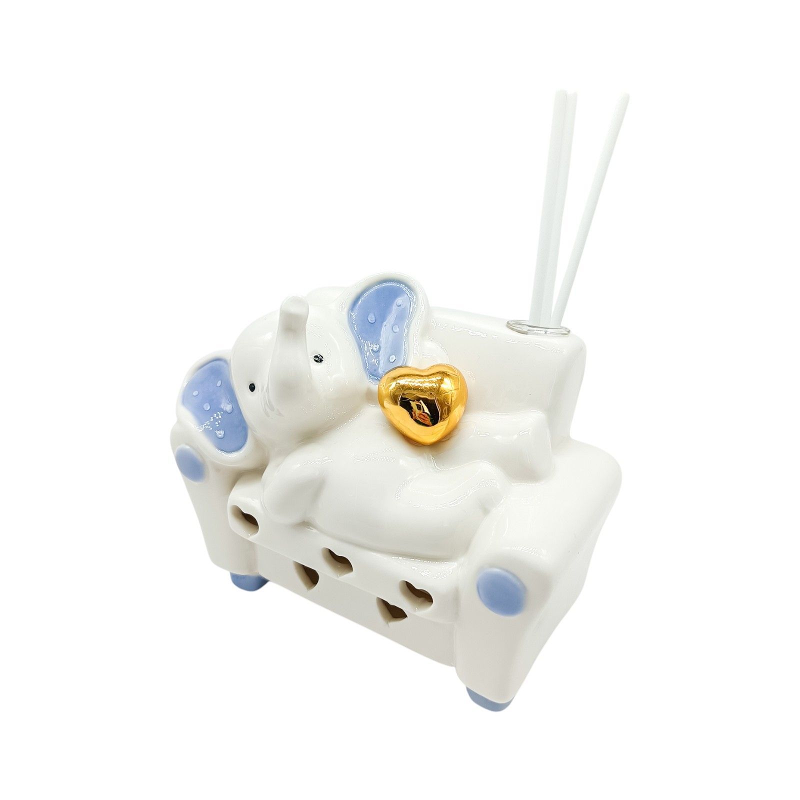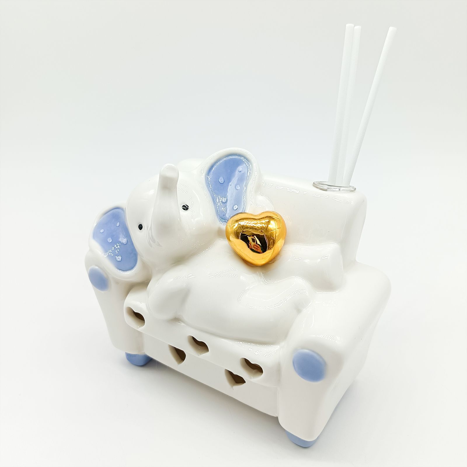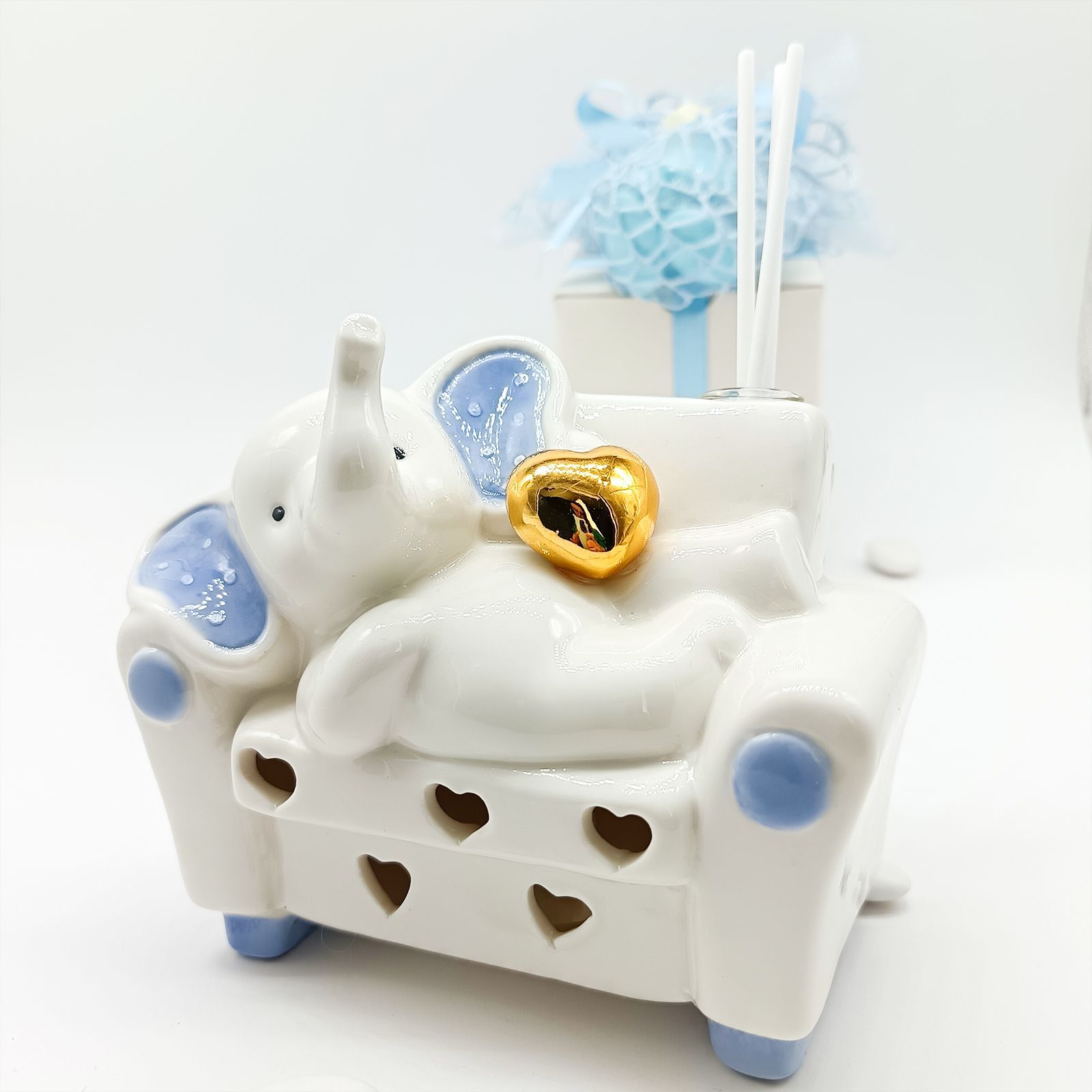 Una bomboniera raffinata e funzionale, perfetta per il battesimo o il primo compleanno di un bimbo. La lampada LED in ceramica bianca lucida, arricchita da dettagli celesti, raffigura un tenero elefantino sdraiato su un divanetto, con cuoricino dorato e orecchie a pois. Dimensioni compatte: 11 x 9 cm.